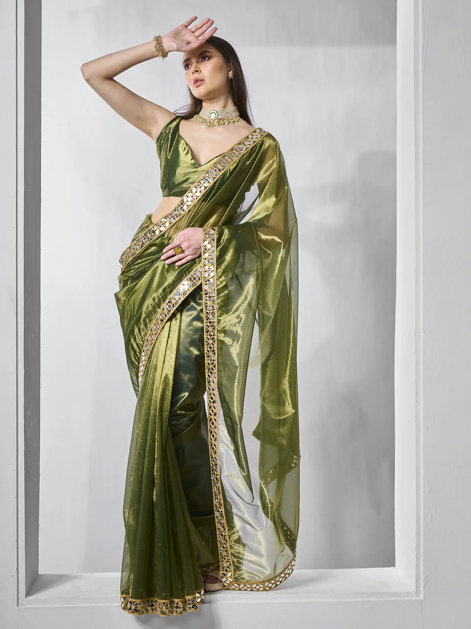 Purplish-Red Mirror Work Designer Border Satin Chiffon Party Wear Saree With Blouse