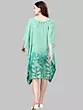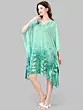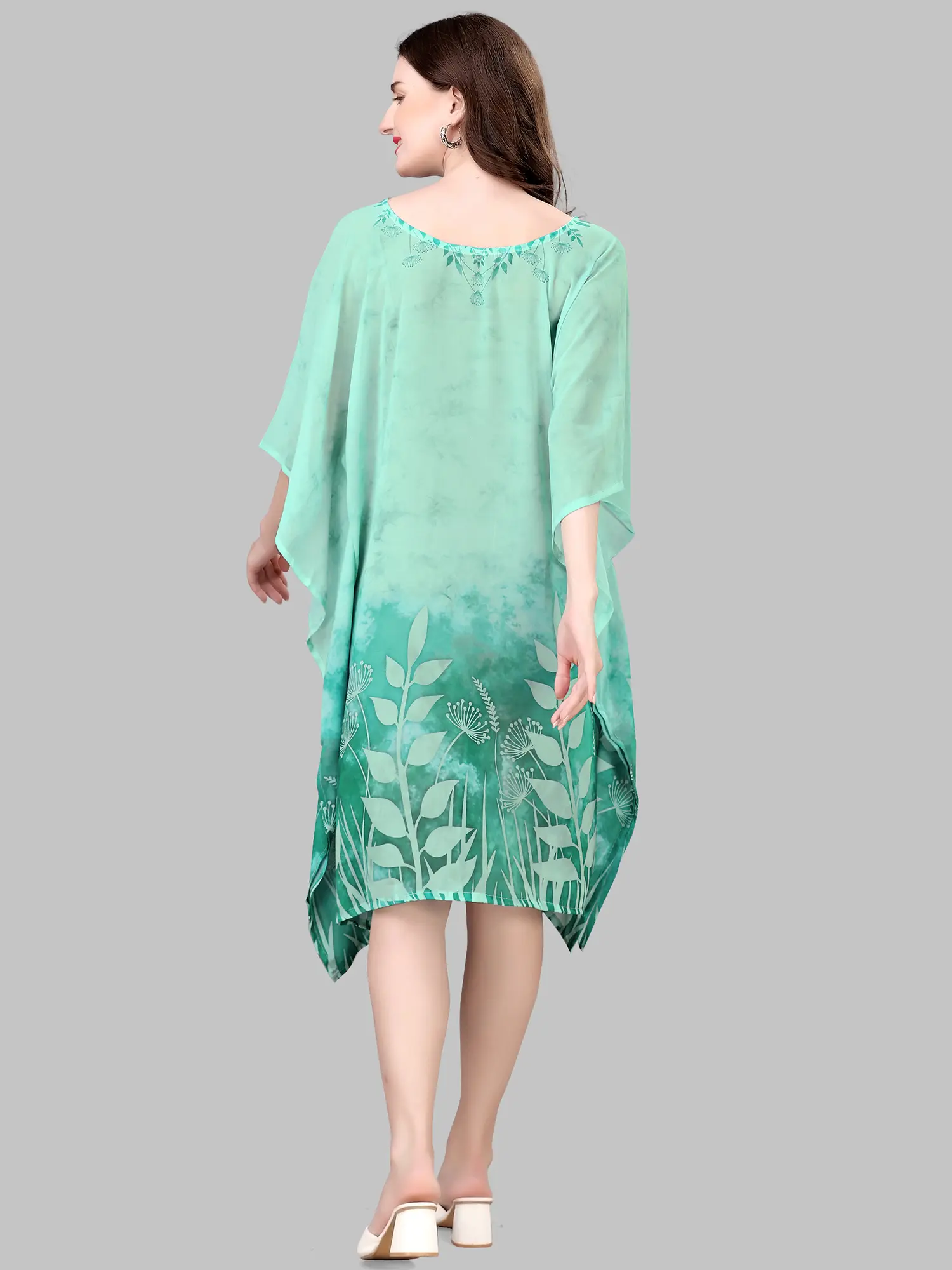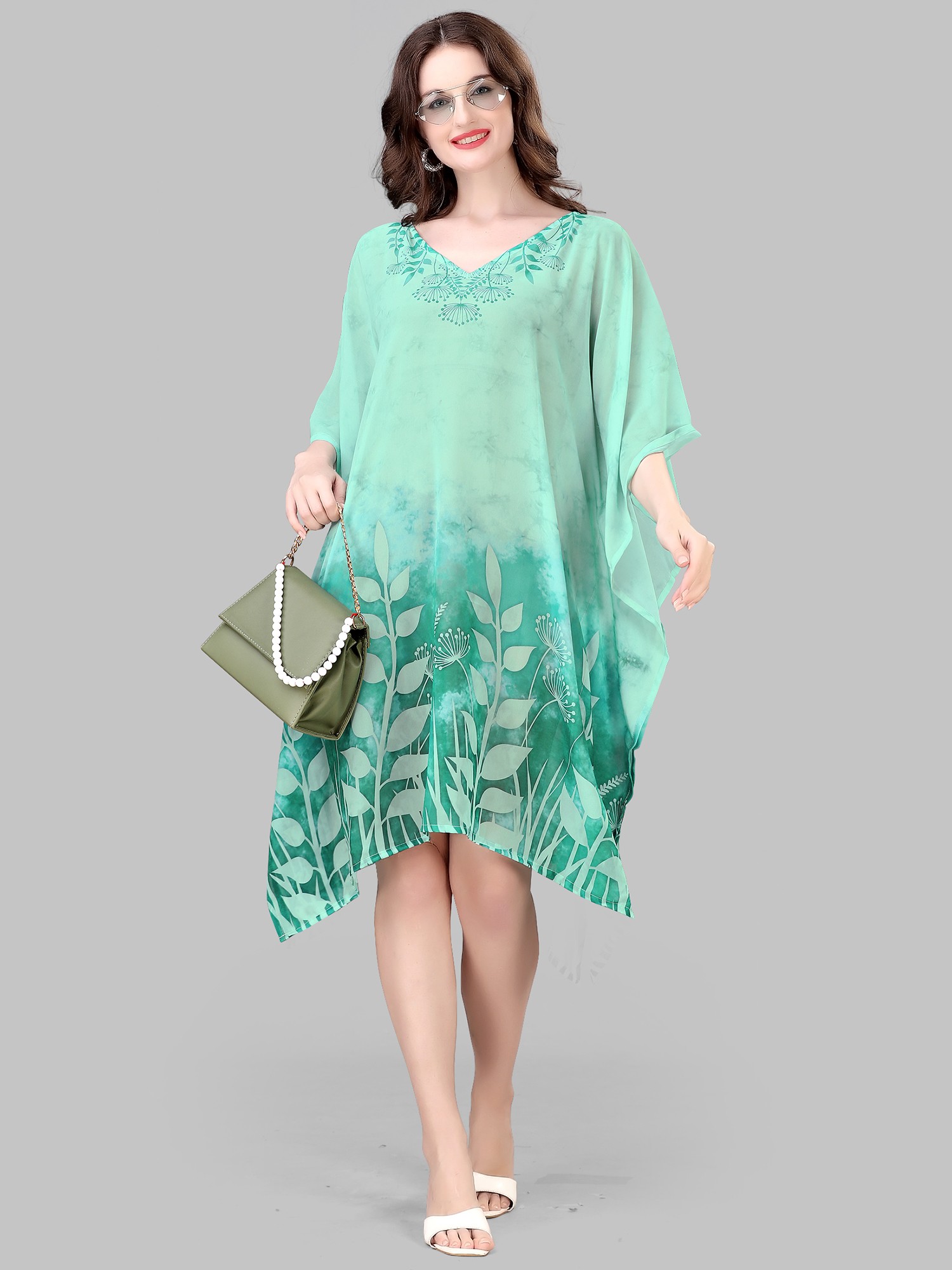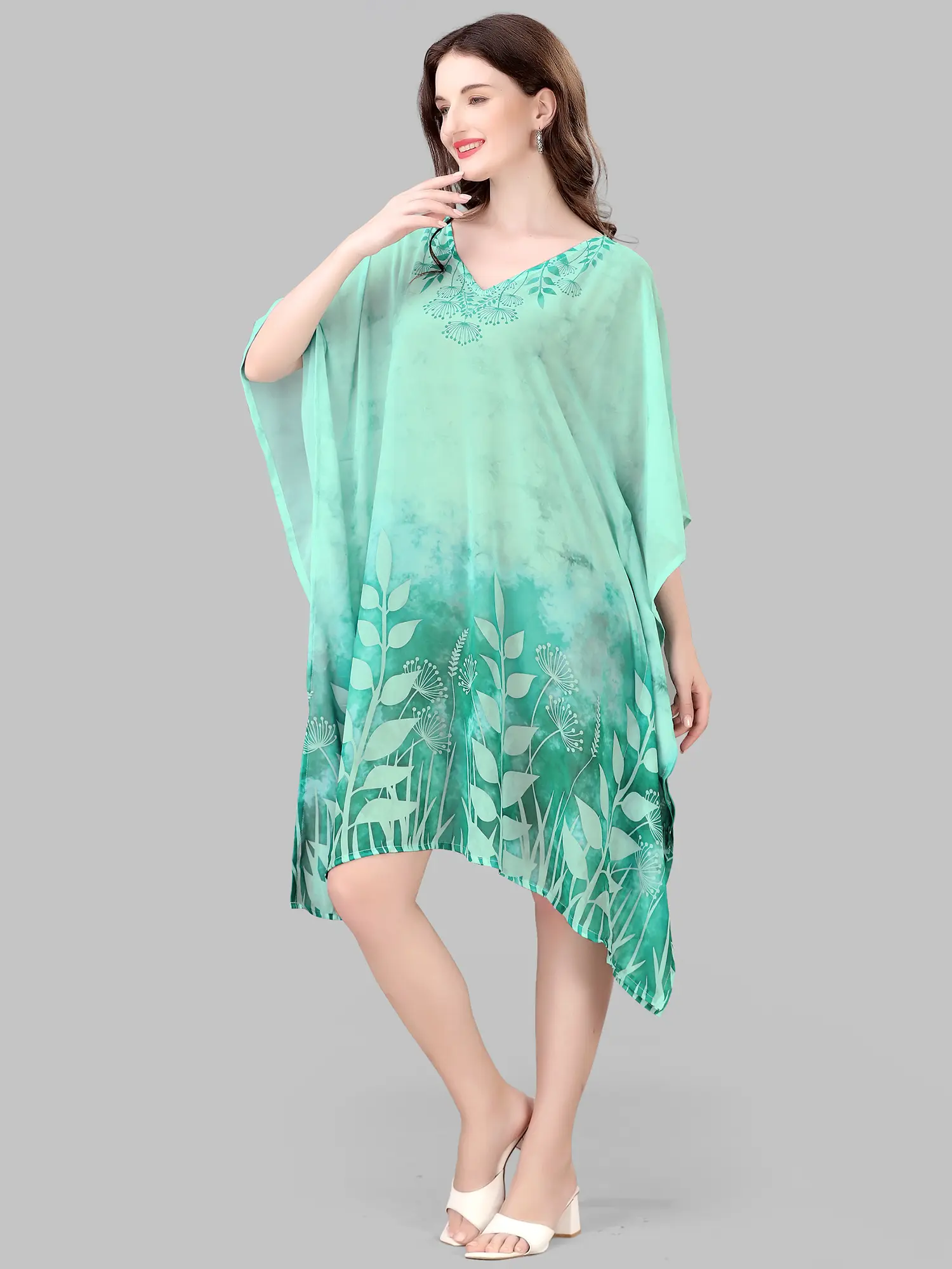The kaftan features a beautiful gradient of green hues, transitioning from a light, misty tone at the top to a richer, darker shade towards the hem. This creates a visually appealing effect that mimics the natural beauty of a lush garden. Adorning the lower portion is a delicate leaf print, showcasing elegant silhouettes of foliage in varying shades of white and pale green. These intricate designs add a touch of nature-inspired sophistication to the garment. The V-neckline is subtly embellished with a matching printed design, providing a delicate detail that draws the eye and enhances the overall elegance of the piece. The design creates a stunning focal point that frames the face beautifully.