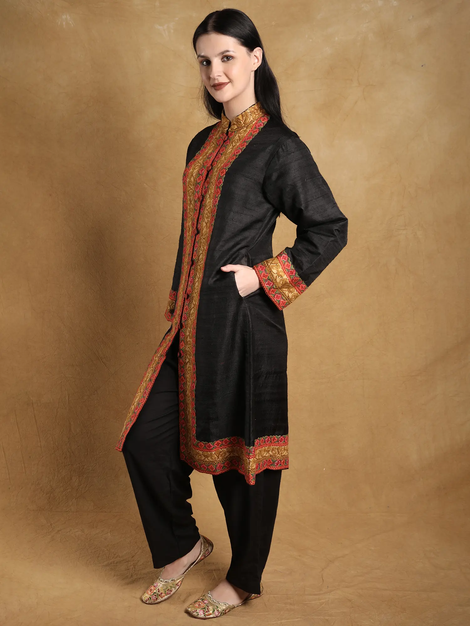 This long jacket transcends fleeting trends, offering a style that is both classic and contemporary. Its flowing silhouette provides a flattering fit for various body types, while its generous length adds a touch of dramatic flair. The band collar lends a refined finish, and the discreet button closure ensures a seamless look. Designed for the modern woman who appreciates both comfort and sophisticated style, this jacket is incredibly versatile. It can be effortlessly paired with traditional Indian ensembles like kurtis and palazzos for a regal look, or styled with sleek black trousers and a simple top for a chic, understated ensemble. The inherent elegance of pure silk combined with the intricate embroidery makes it suitable for formal occasions, festive gatherings, or even as a luxurious layering piece for a touch of everyday glamour. Elevate your wardrobe with this exceptional piece of wearable art.