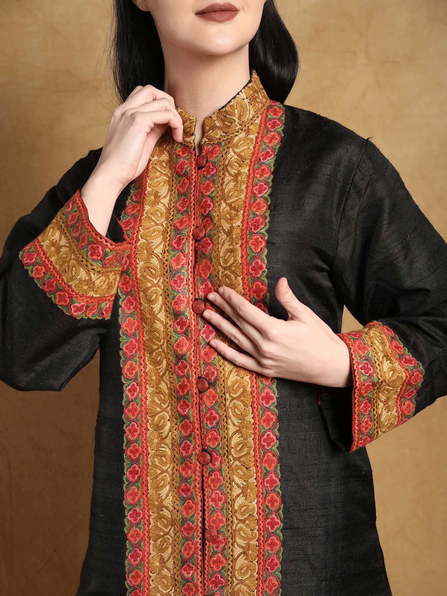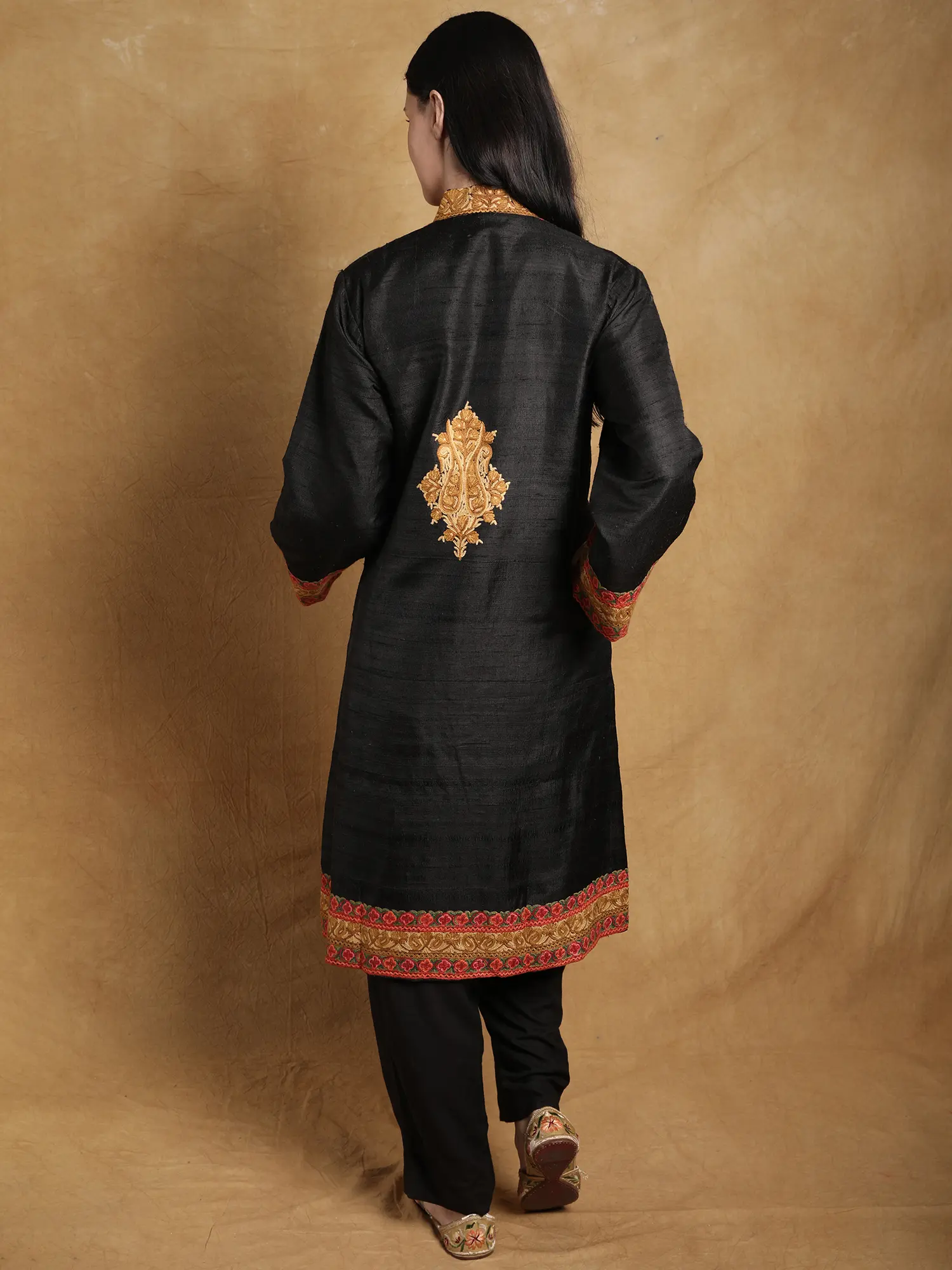 The true magic of this jacket lies in its hand Aari embroidery. This ancient Kashmiri technique involves using a special hook-like needle to create dense, vibrant patterns. The paisley designs, universally recognized for their flowing, organic beauty, are meticulously hand-embroidered along the jacket's placket, cuffs, and hem. The interplay of golden threads against the rich black silk creates a stunning contrast, drawing the eye to the intricate details. The crimson accents add a touch of warmth and sophistication, making this jacket a statement piece that exudes timeless elegance. The careful placement of these embroidered borders frames the silhouette beautifully, enhancing its inherent grace. ––––––––––