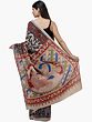 Crafted with traditional hues and patterns of Kalamkari, this printed cotton saree is a graceful drape. The beautiful muted fabric of the saree is made enchanting by the vivid prints all over. The field is covered with butterfly patterns, bordered by musical instruments, scenes from traditional literature, and floral vines. On the pallu of the saree, a large Hamsa or swan is depicted with a fish in its beak, making this saree a lovely ode to nature and culture.