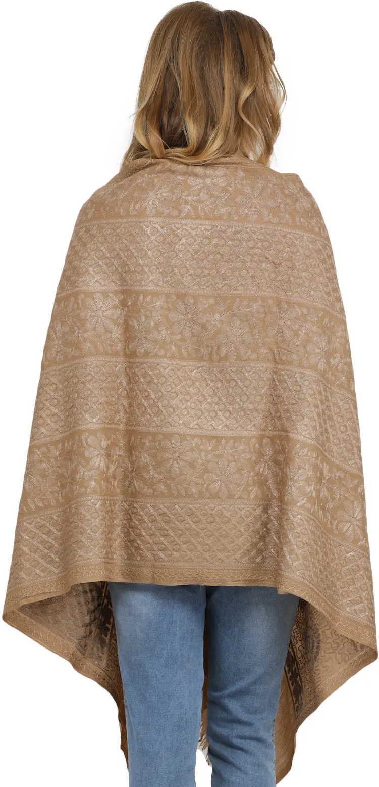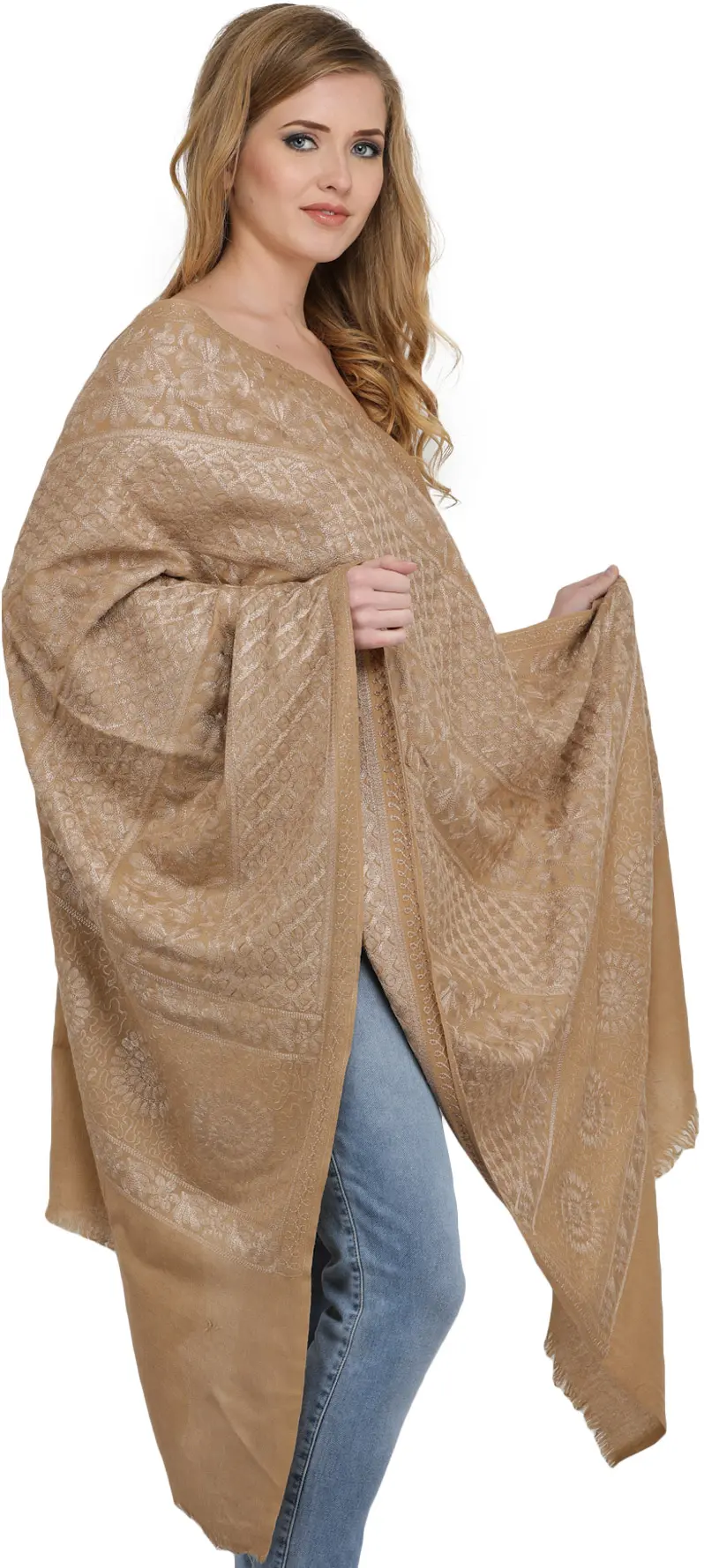 Solitary-Star Pure Wool Shawl with All-Over Floral Chain Stitch Aari Embroidery in Multicolor Thread