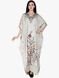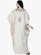The field of the kaftan is a moon-like silver colour. The silk of the make - the most delicate variety grown in the valley - lends it a shimmer that would make you look like some shapely sliver of the moon having descended the earth. Every bit of the embroidery that meets the eyes has been laboriously done by hand. Zoom in on the same to appreciate the perfection of the work, and the irresistible beads and sequins that complete it. This is a fine number to wear to close-knit evening gatherings, best teamed with ever-so-slightly dramatic makeup.