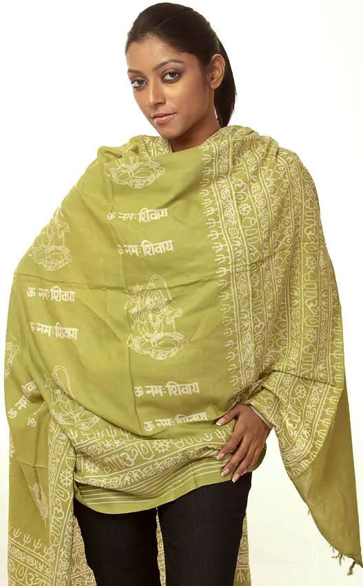 Moss-Green Prayer Shawl with Printed Om Namah Shivai Mantra