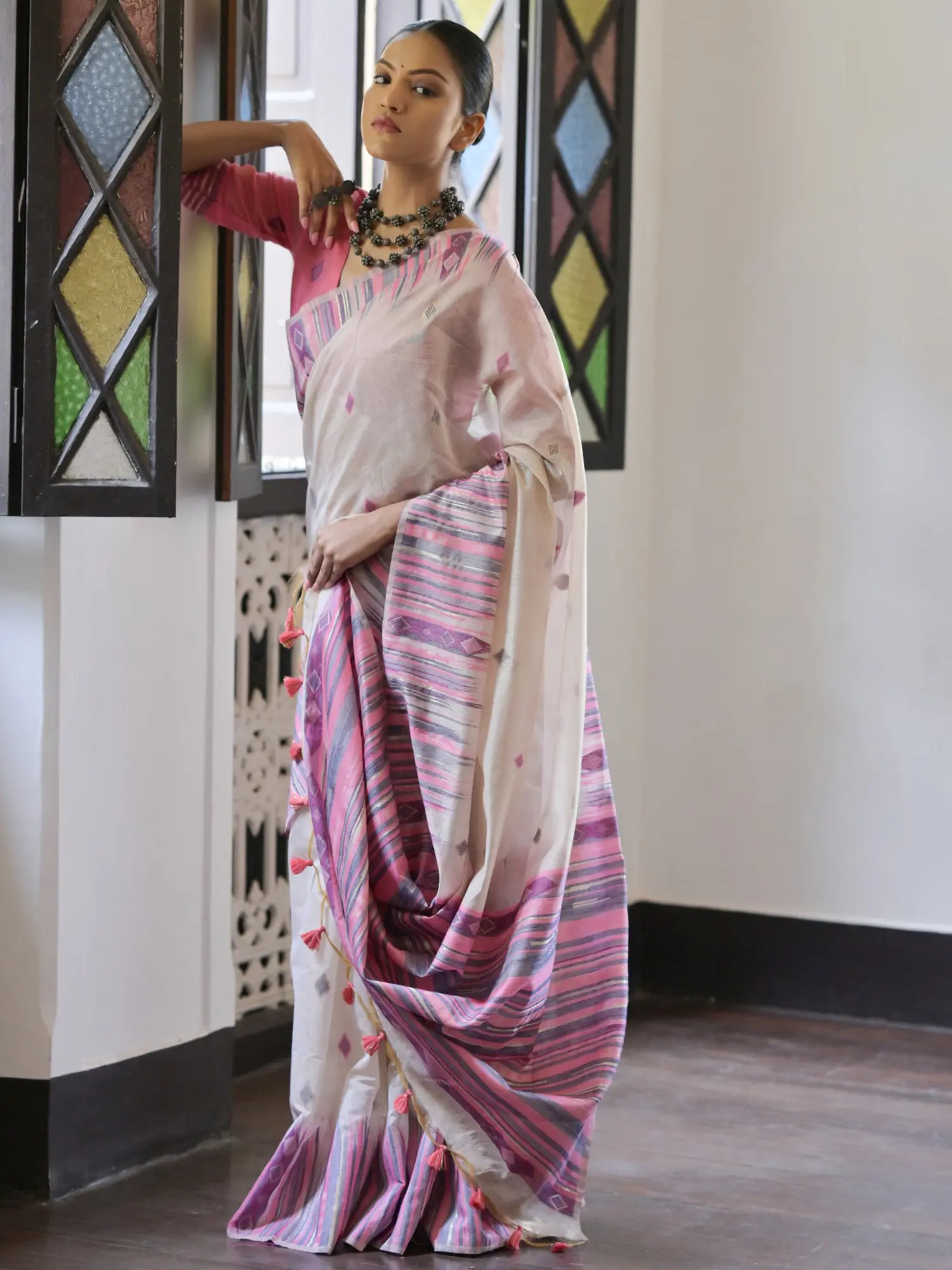 The highlight of this saree is its beautifully woven pallu and broad border, intricately crafted with the traditional Ikat technique. Ikat weaving is an ancient art form that involves dyeing threads before they are woven, creating distinctive patterns that appear to have been "bound" or "tied." The geometric motifs and the interplay of colors within the borders and pallu speak volumes of the artisan's skill and dedication. The soft, earthy base of the Muga cotton is beautifully complemented by the vibrant yet subtle hues of pink, purple, and gray in the woven patterns, creating a visually captivating design that is both classic and chic.