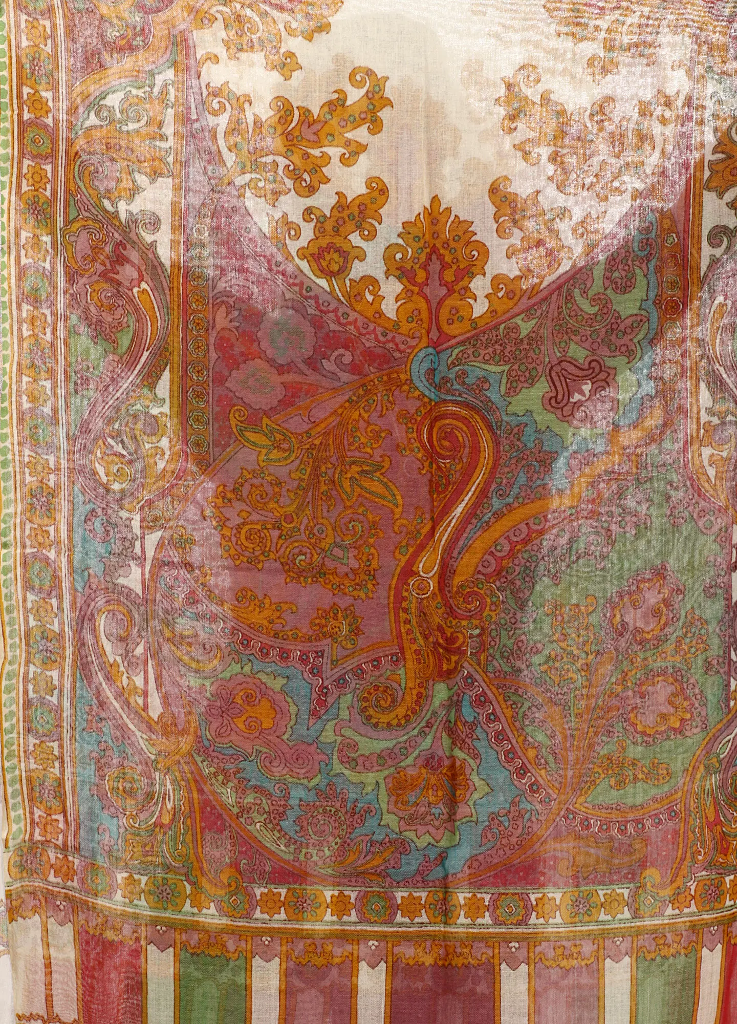 The true artistry of this stole lies in its captivating print. Inspired by the intricate motifs and vibrant palettes of antique Akbari designs, the pattern is a visual symphony. Swirls of rich auburn, earthy ochre, and deep olive green intertwine with delicate floral elements and paisley-like forms, evoking a sense of regal grandeur. This complex, multi-hued design is printed onto a soft, ivory core, creating a striking contrast that makes the colors pop and the details stand out. The overall effect is one of profound depth and artisanal craftsmanship, a wearable piece of art that carries the legacy of centuries-old design. ––––––––––––––––––––