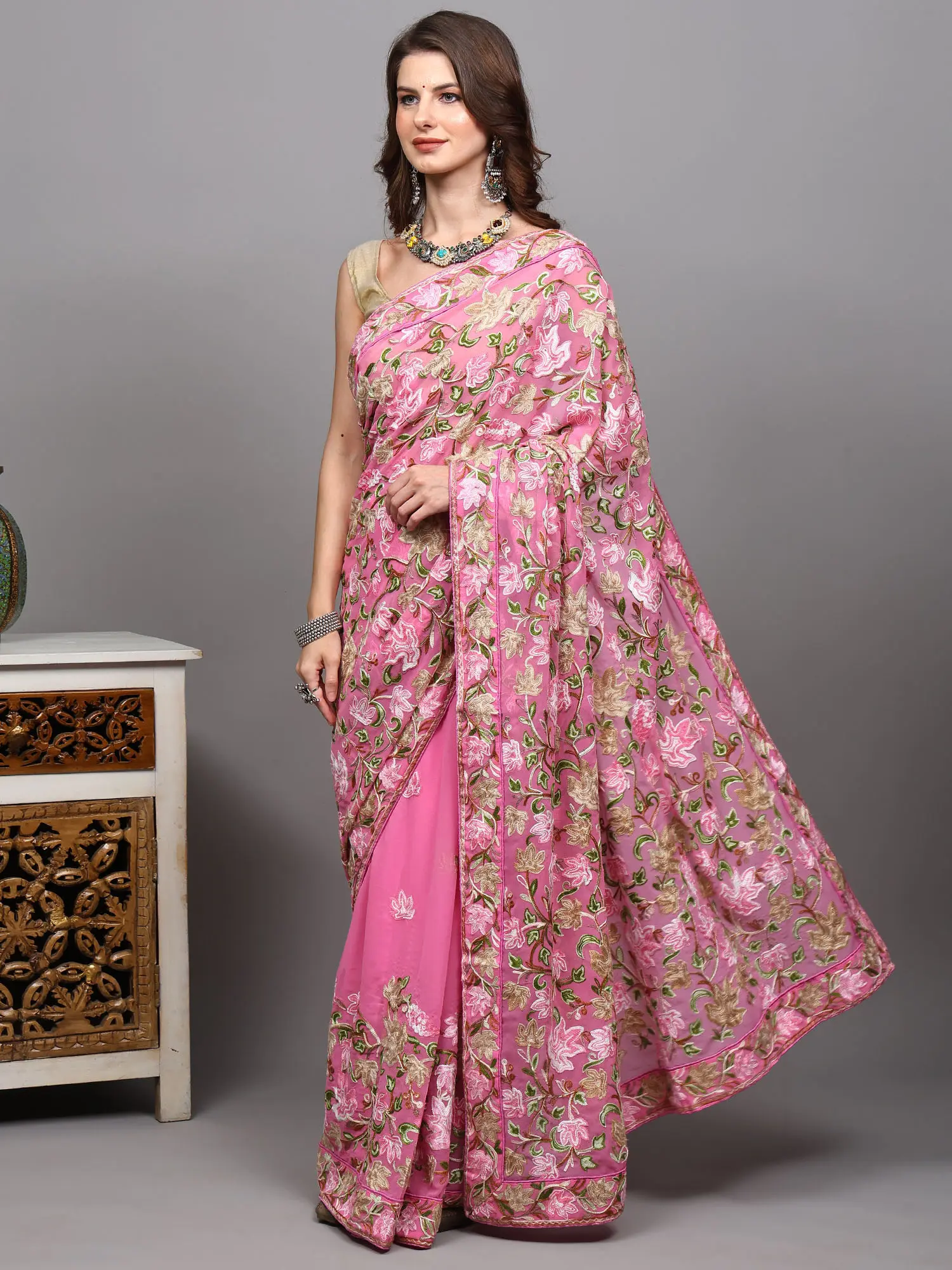 Georgette Kashmiri Sari with Beautiful All-Over Kashida Embroidery