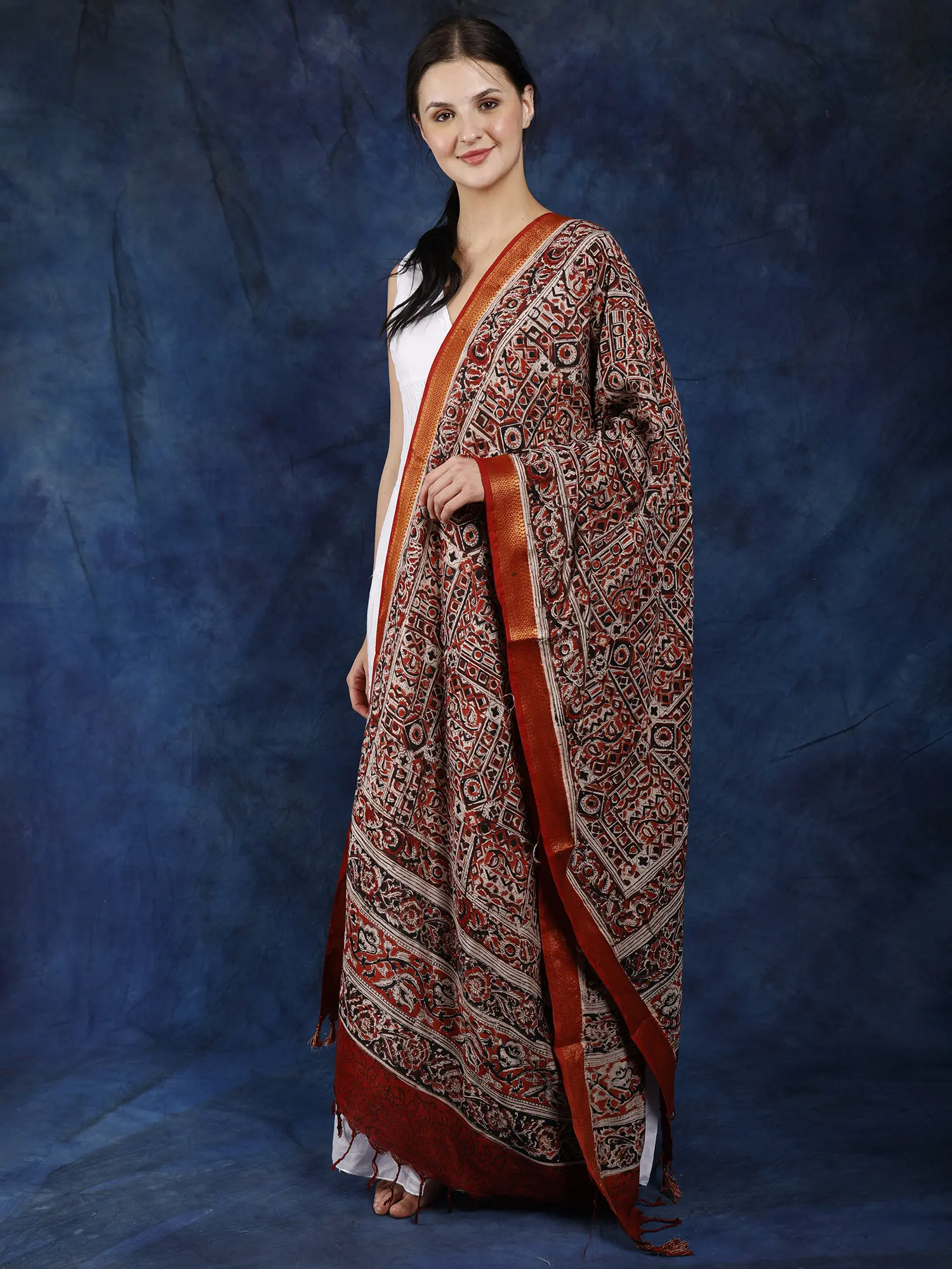 Kalamkari Dupatta from Telangana with Zari Border and Floral Print All-Over