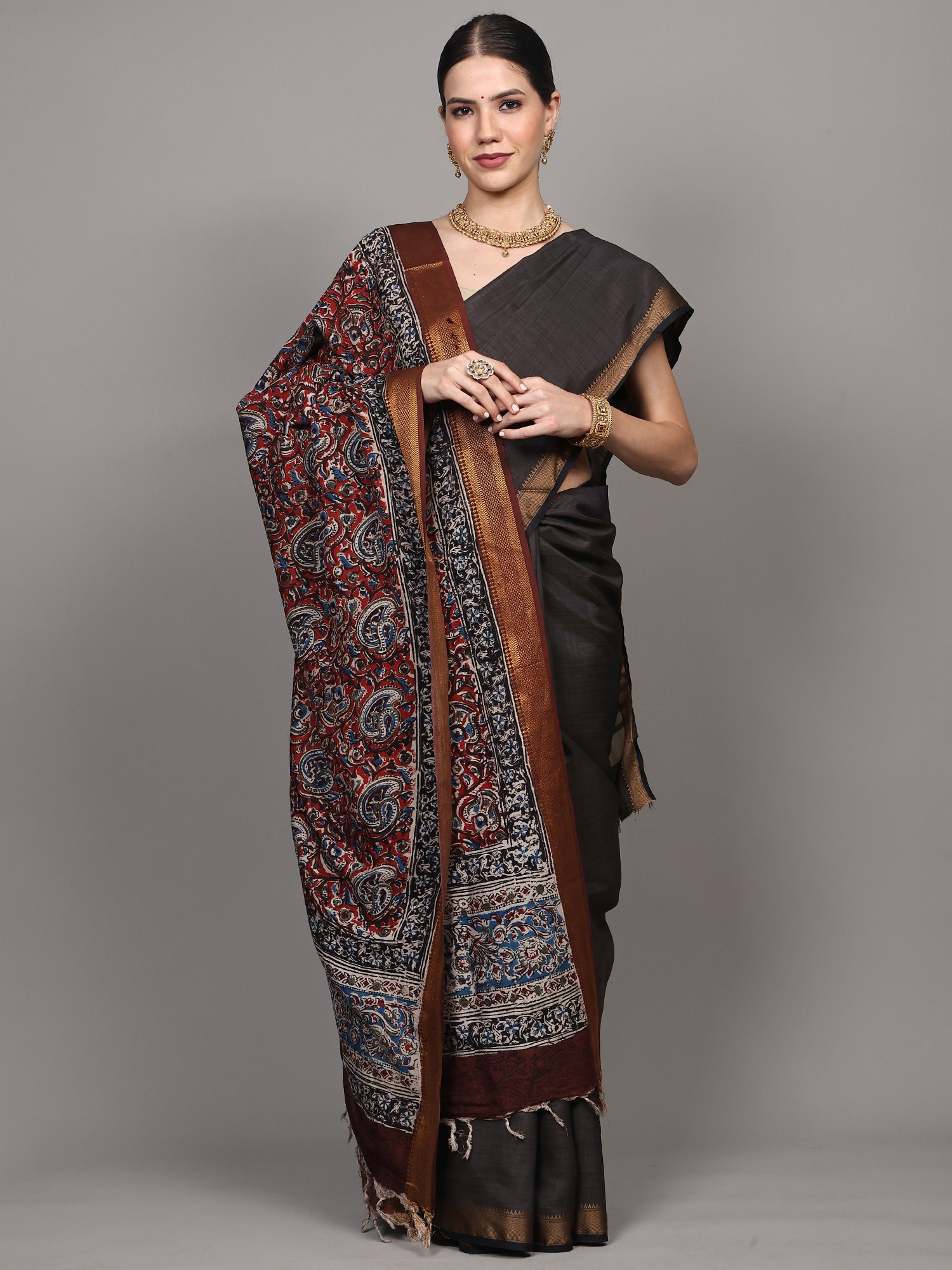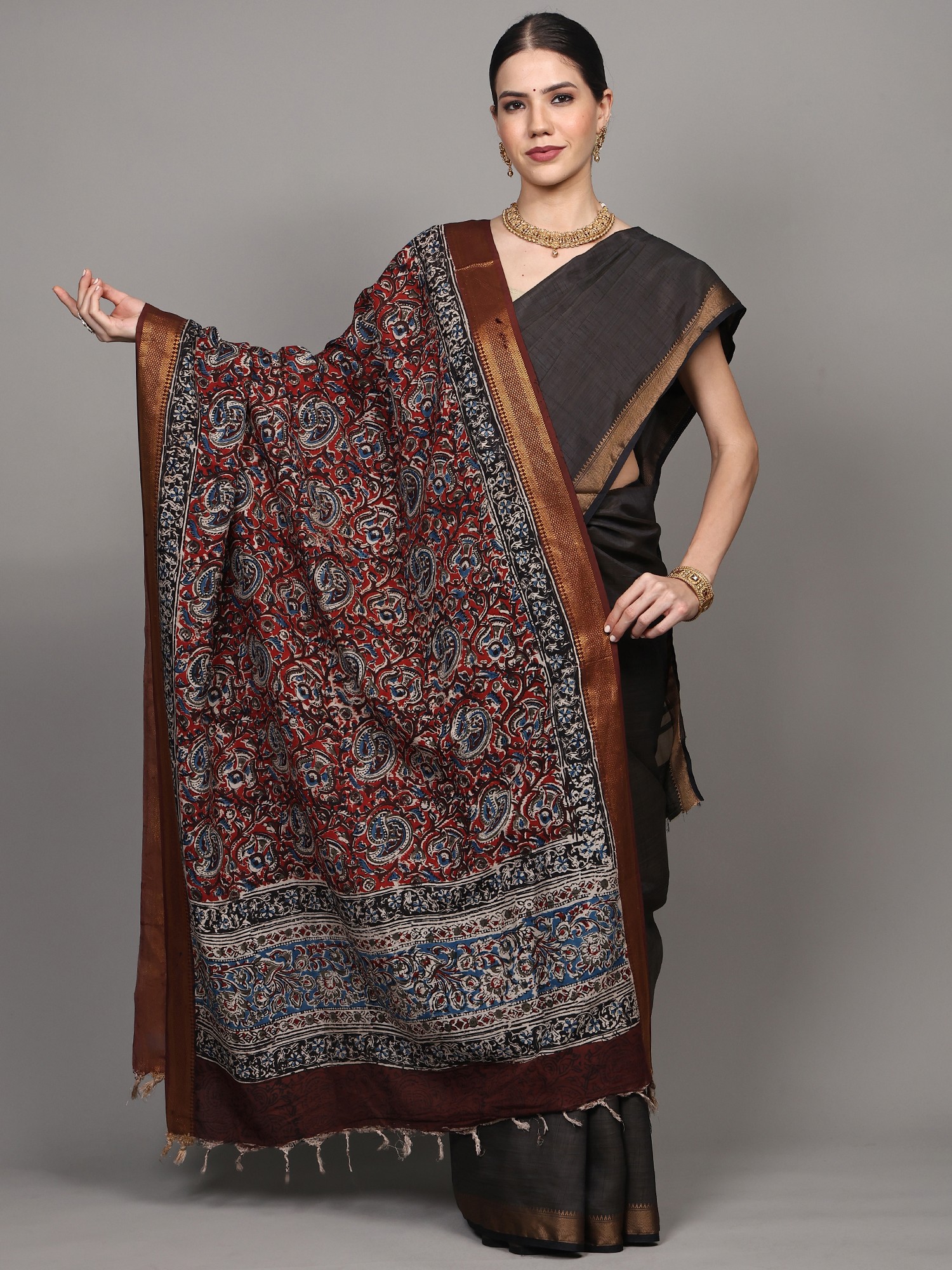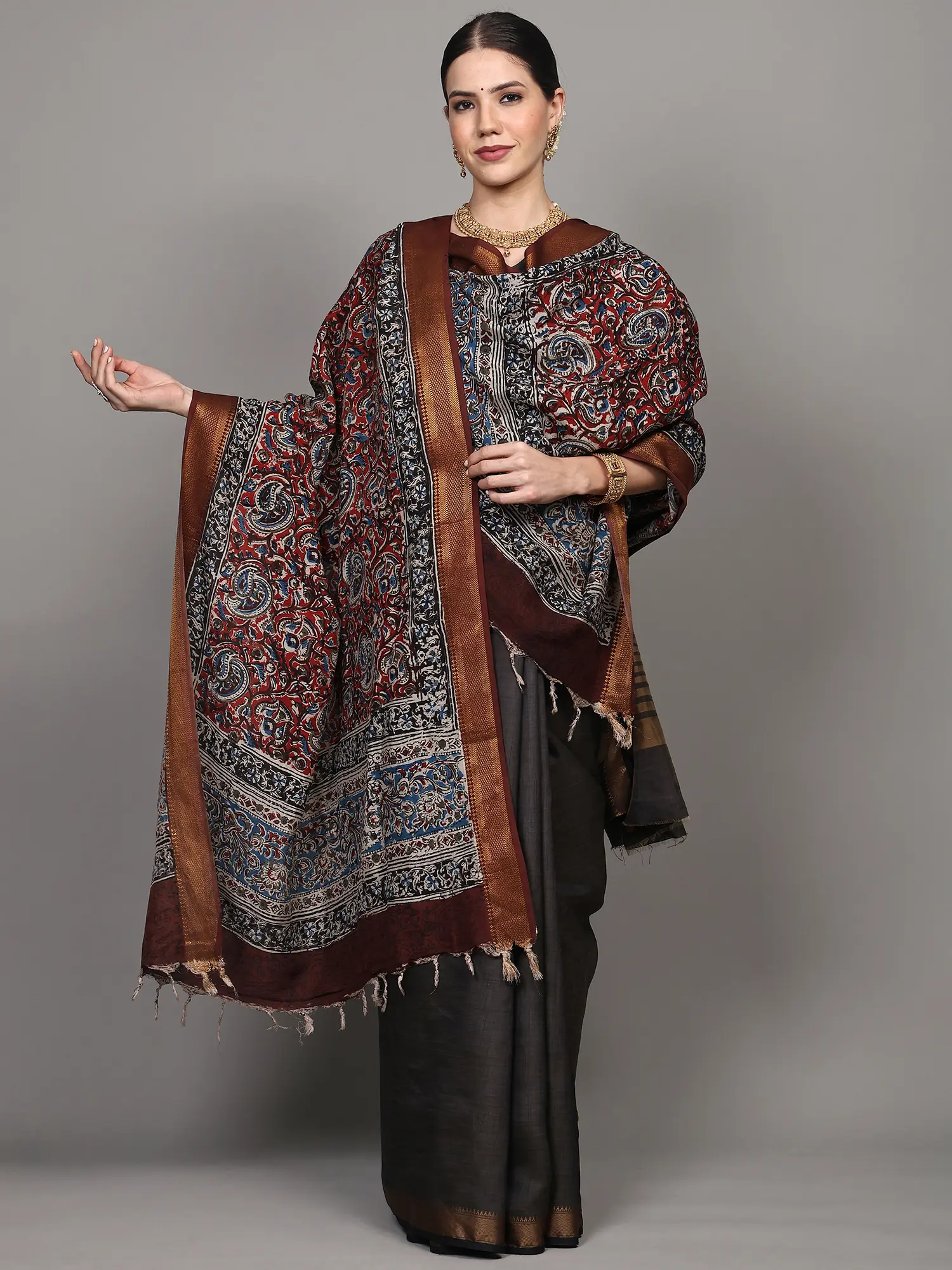 Forest-River Kalamkari Dupatta from Telangana with Zari Border and Printed Paisleys