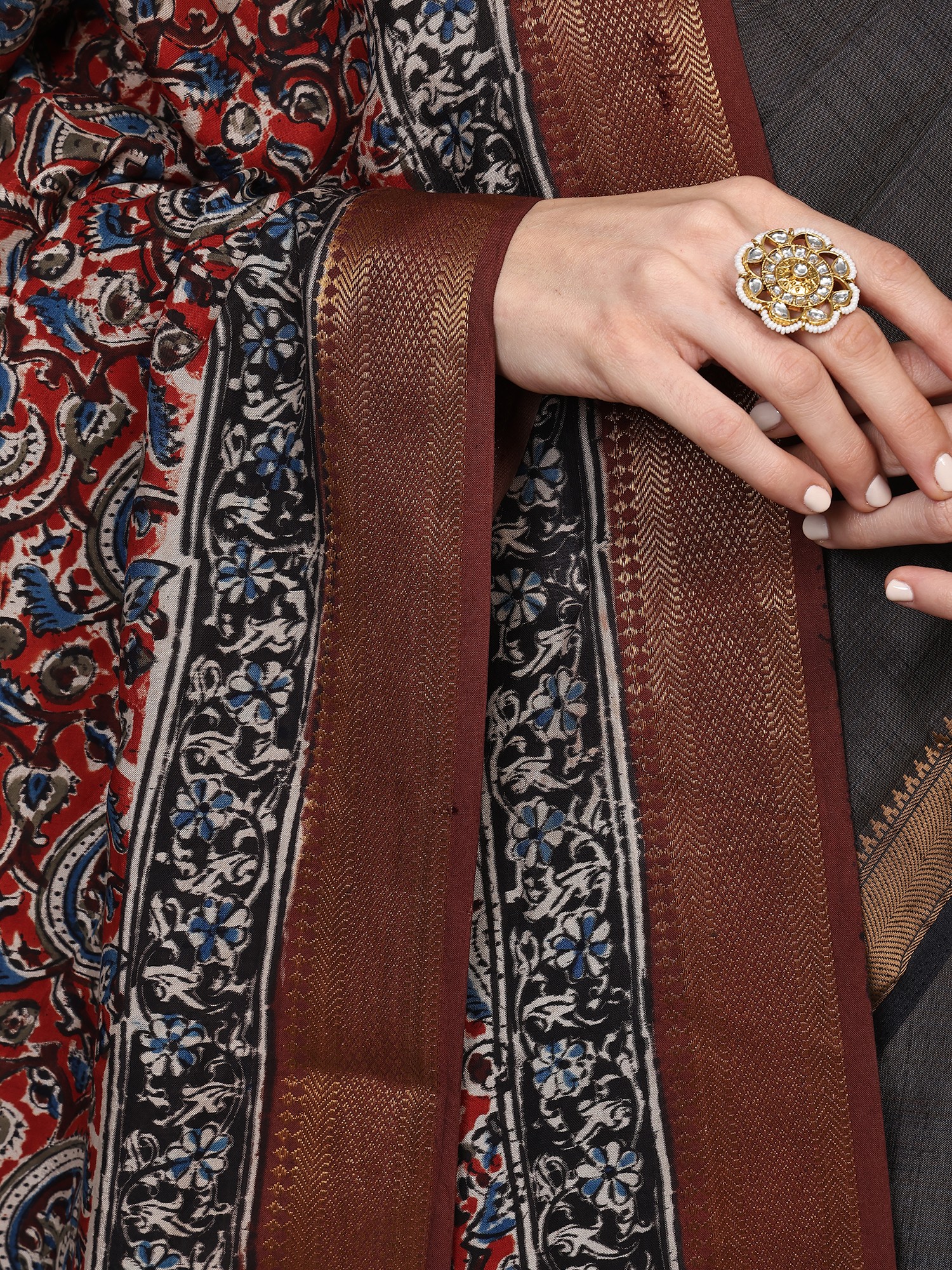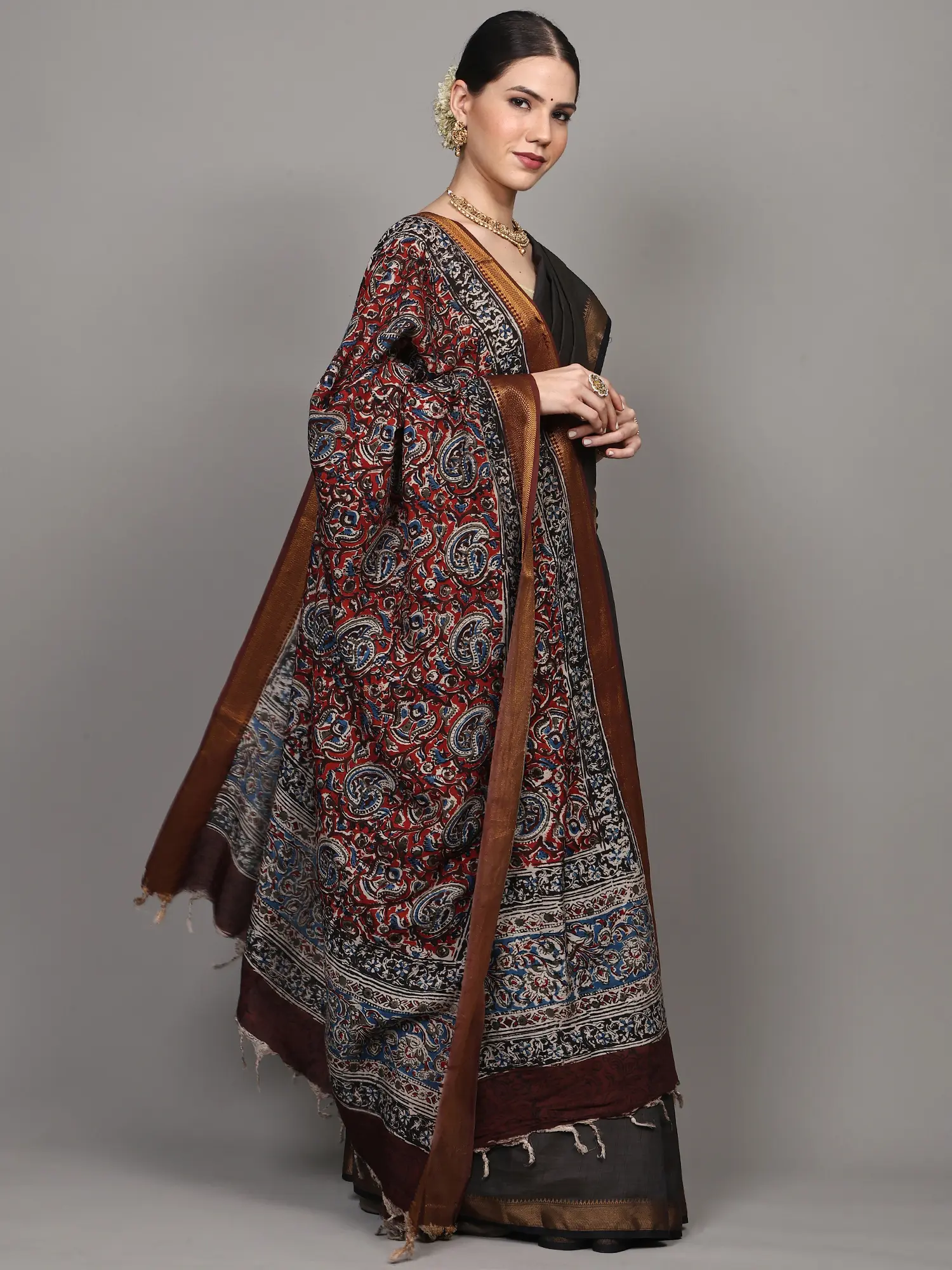 Stretch-Limo Kalamkari Dupatta from Telangana with Zari Border and Printed Paisleys
