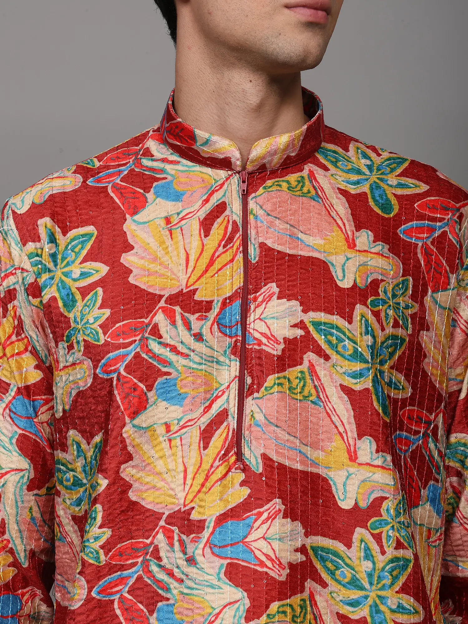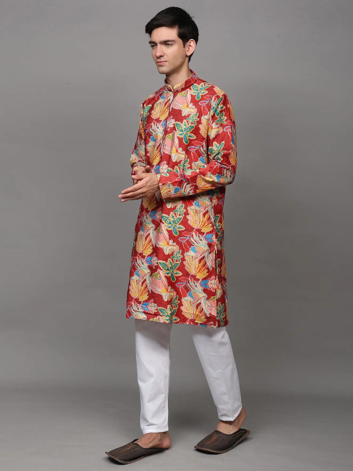 Wedding Kurta Pajama Set with All-Over Woven Floral Motifs in Self