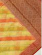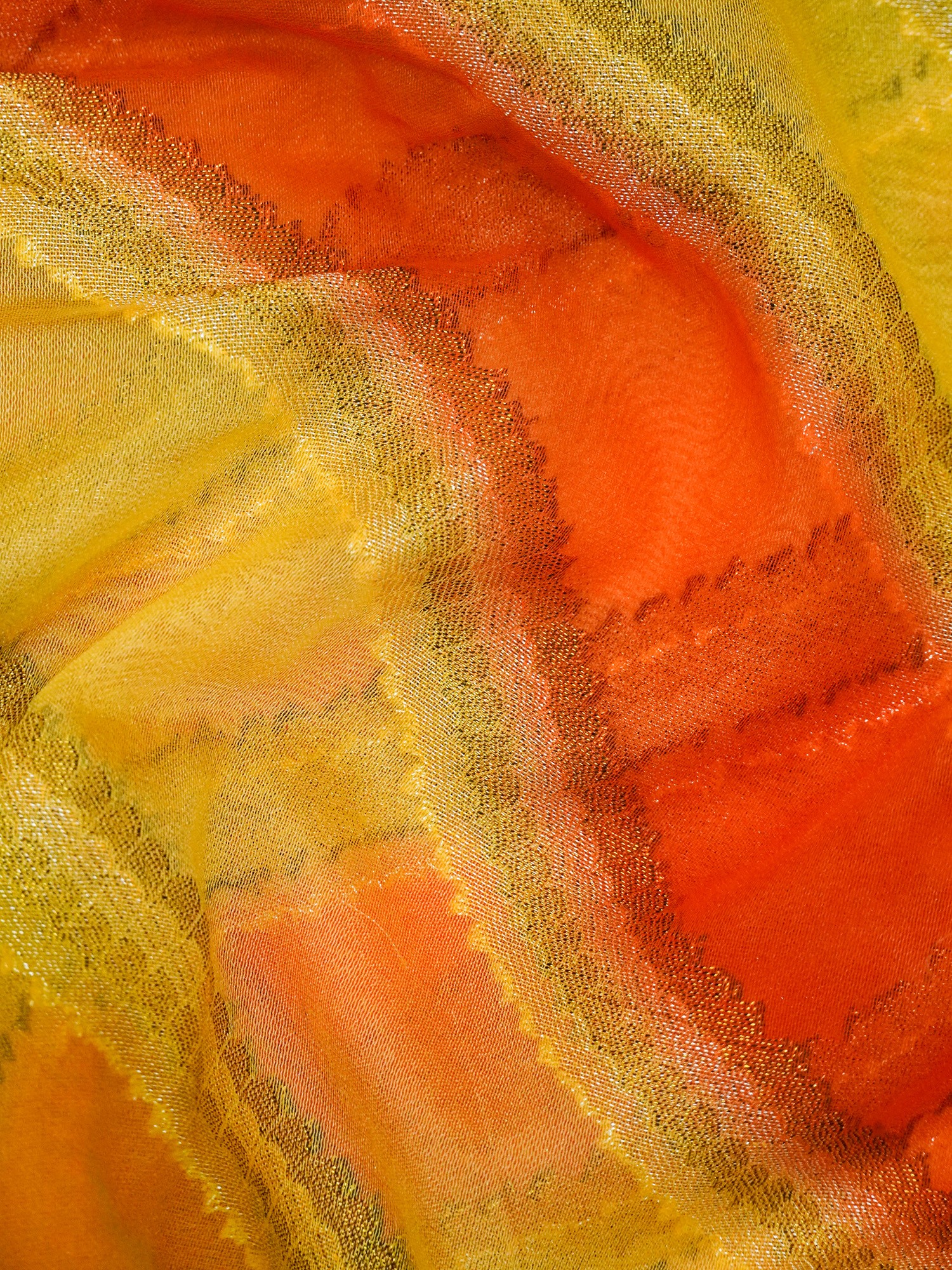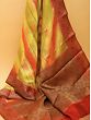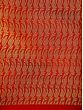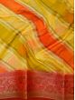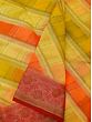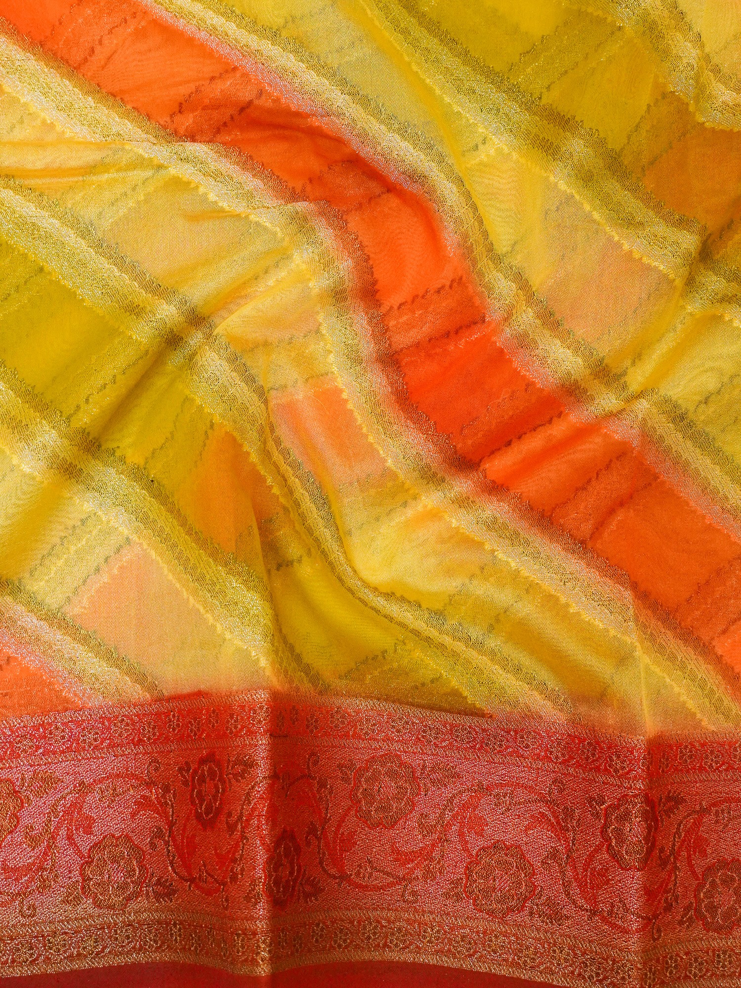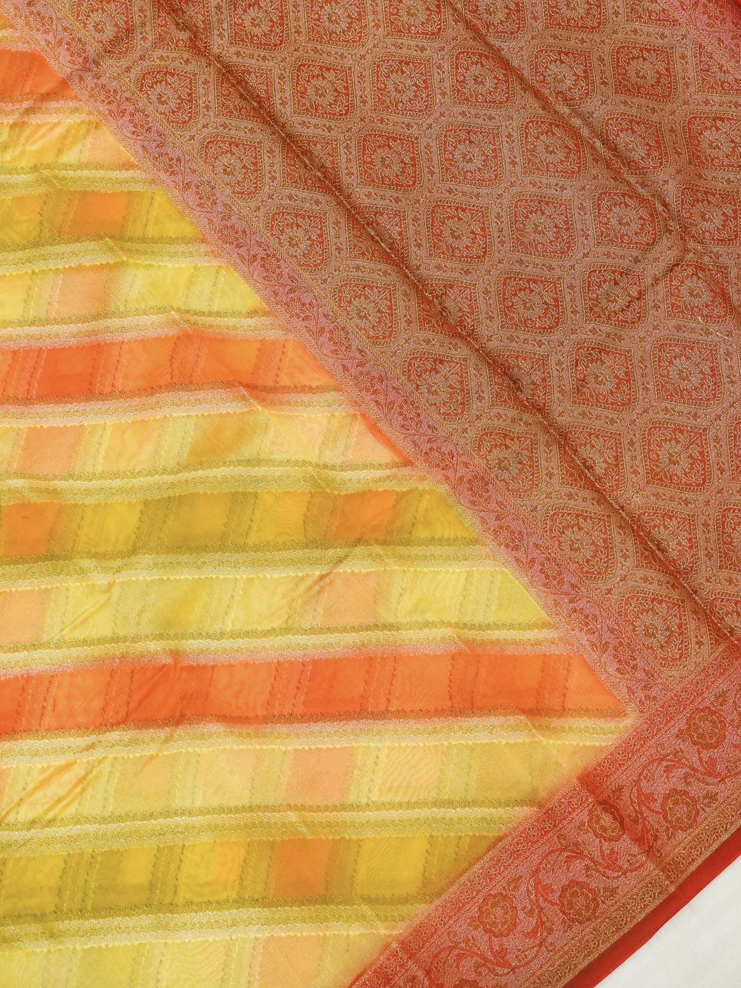 The field of saree is colored in beautiful colors of yellow and orange and covered in geometrical patterns. The border and the pallu of the saree are in a deep red tone and adorned with Zari work to recreate the magic of brocade.