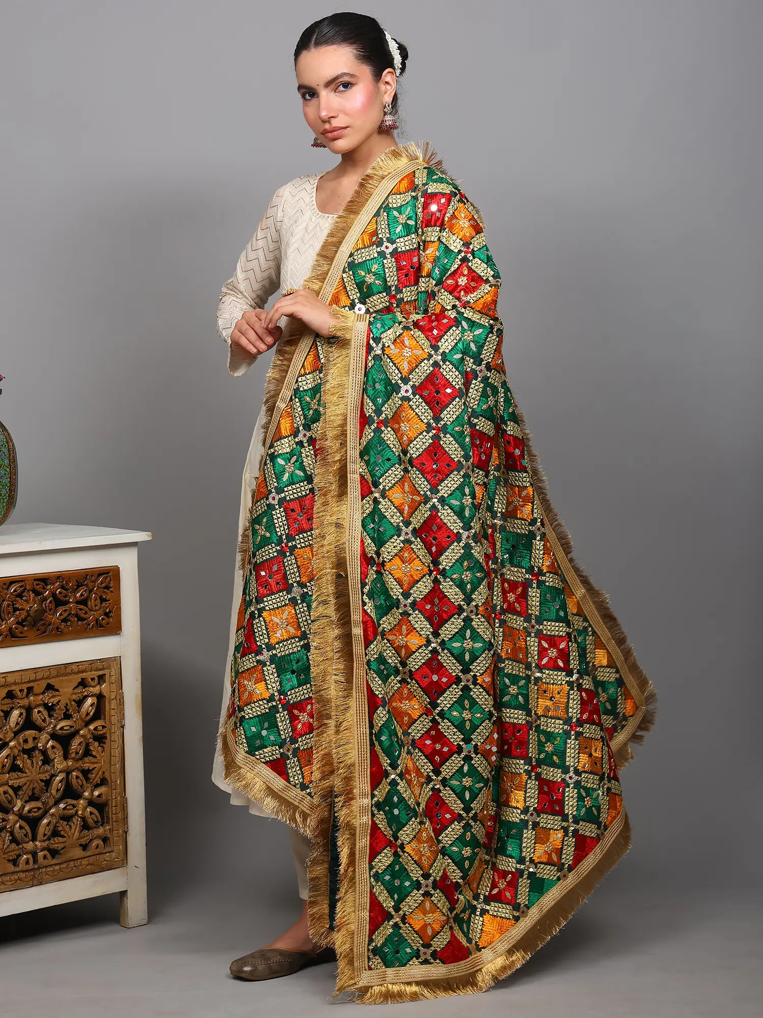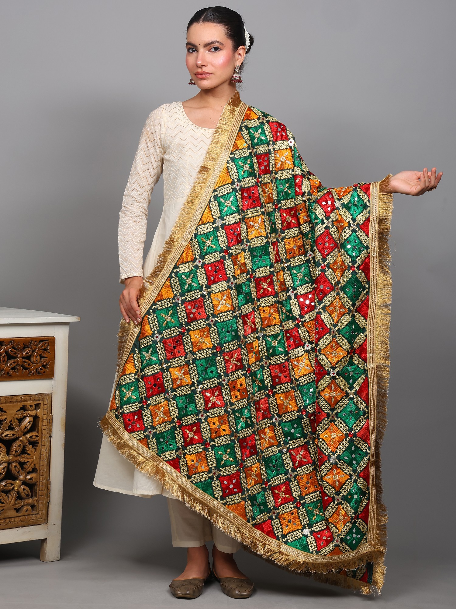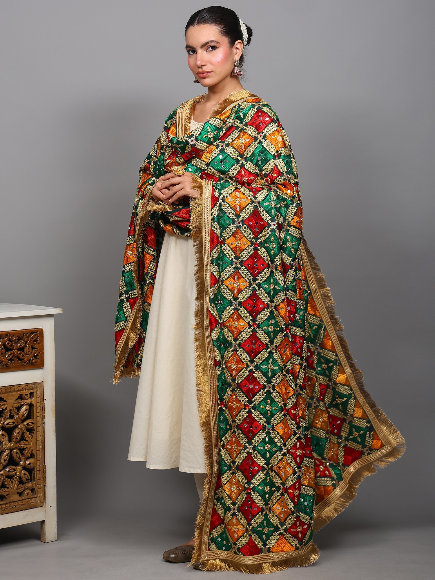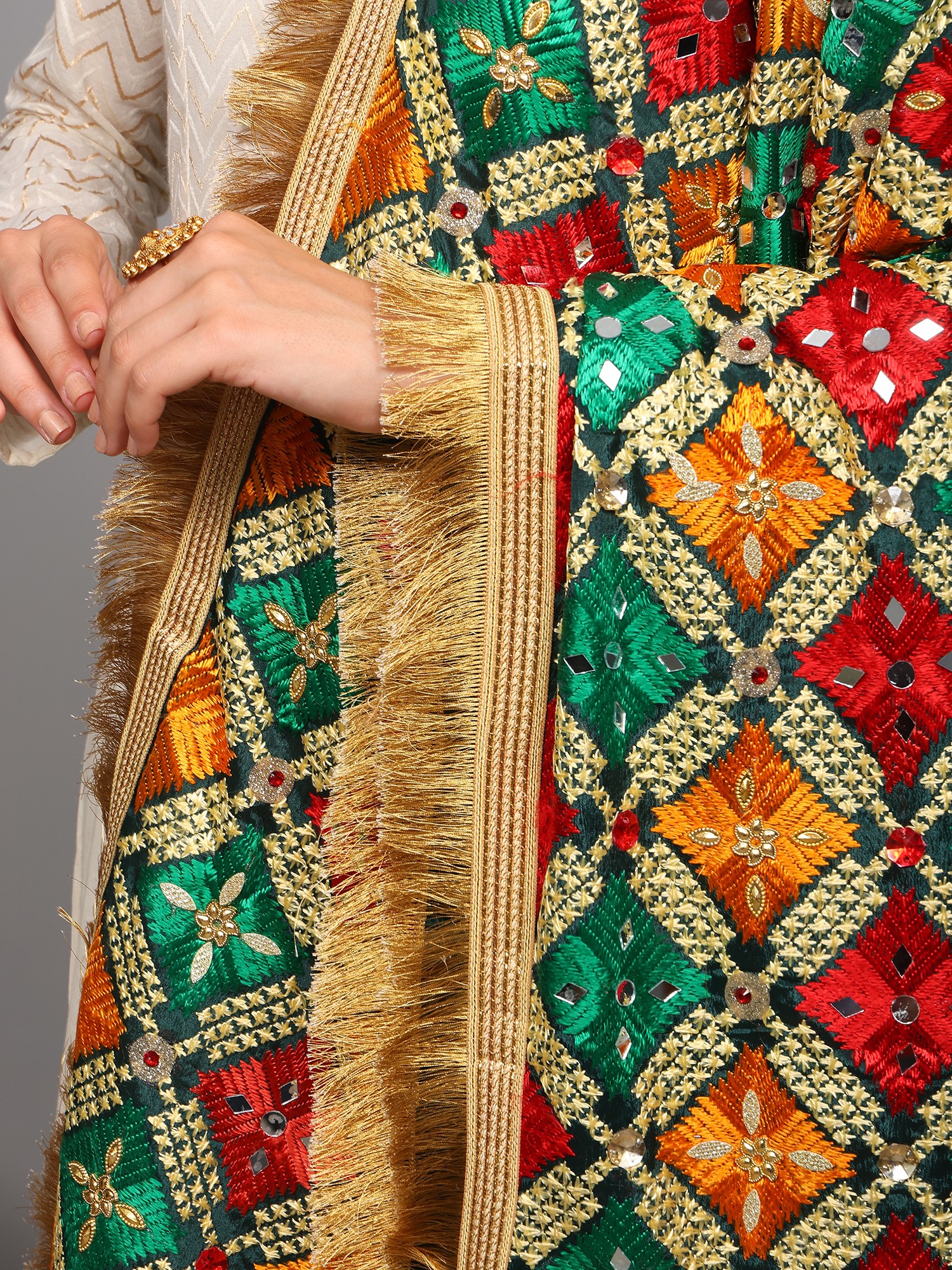 Phulkari Dupatta from Punjab with Embroidery and Gota Border