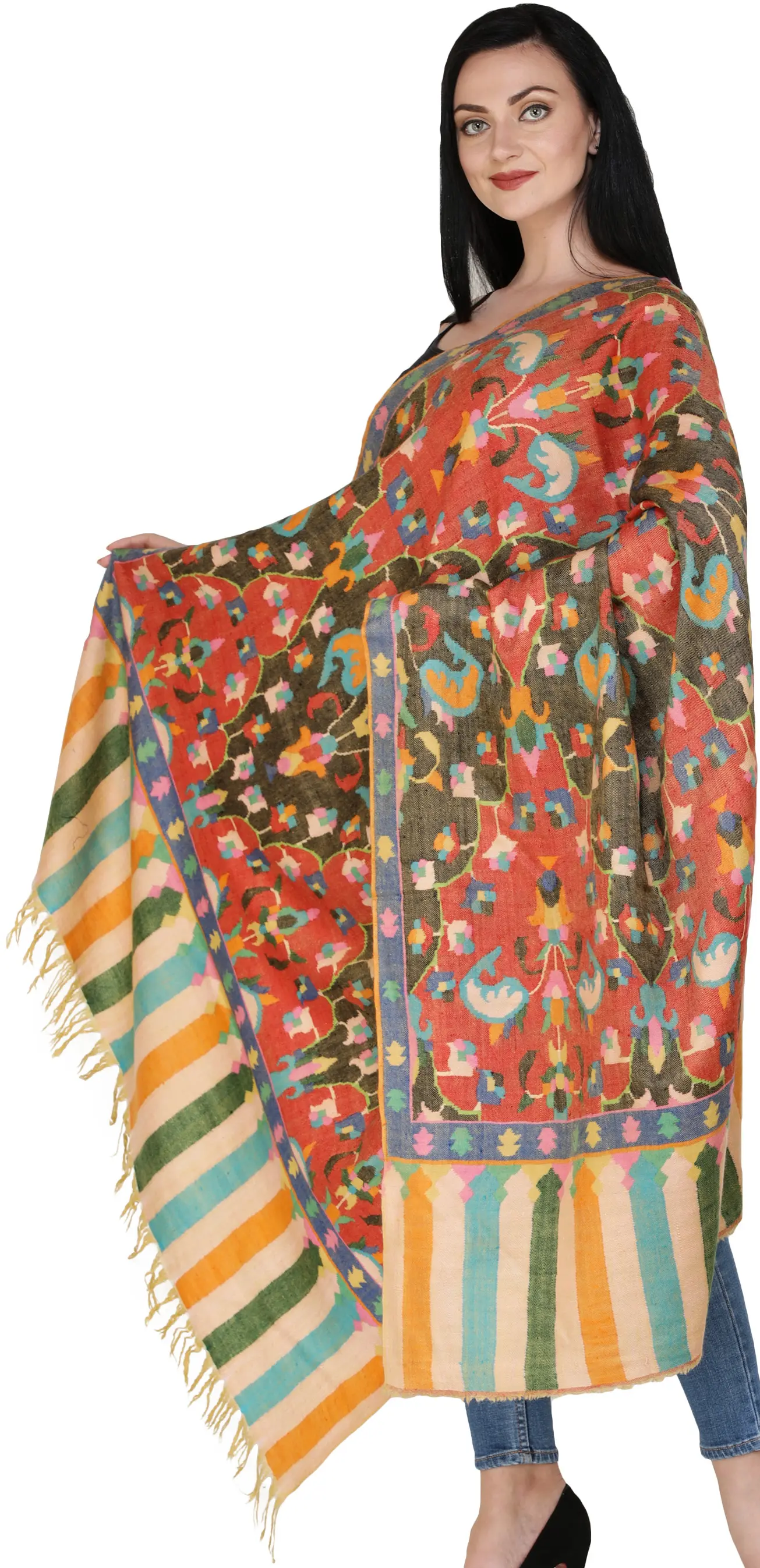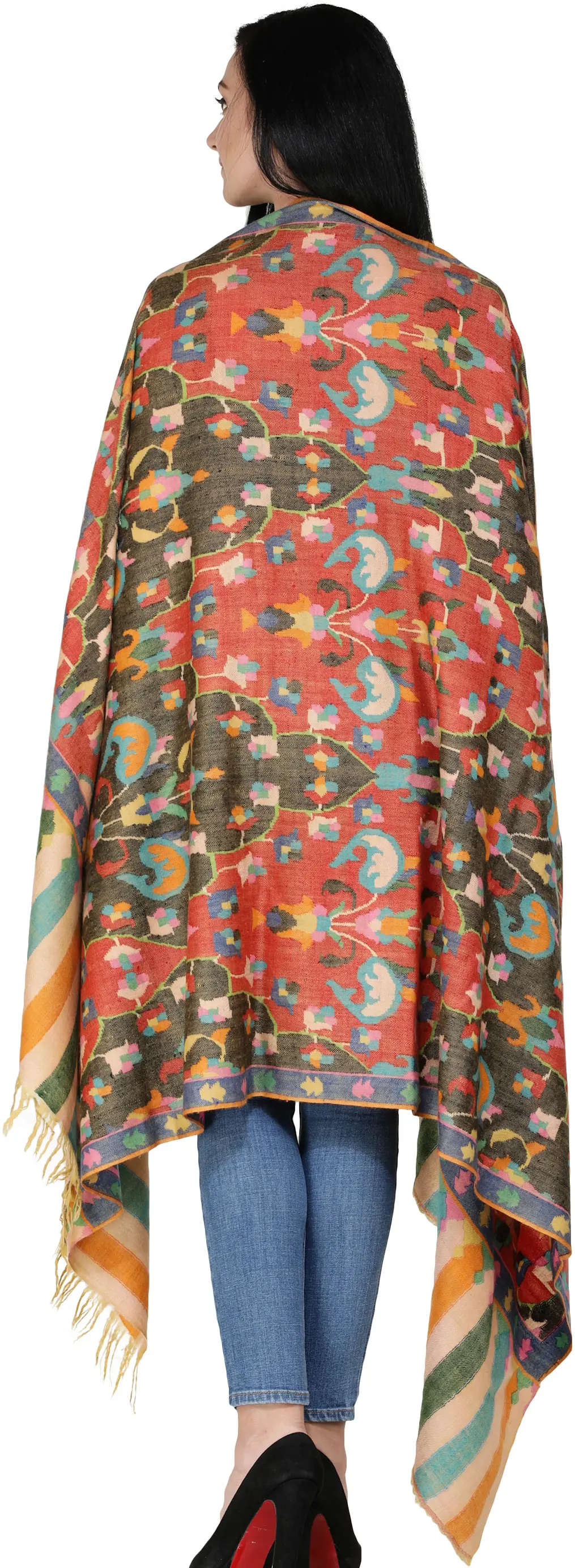 Kani Jamawar Reversible Two Ply Shawl with Woven Floral Leaf Jaal and Paisleys