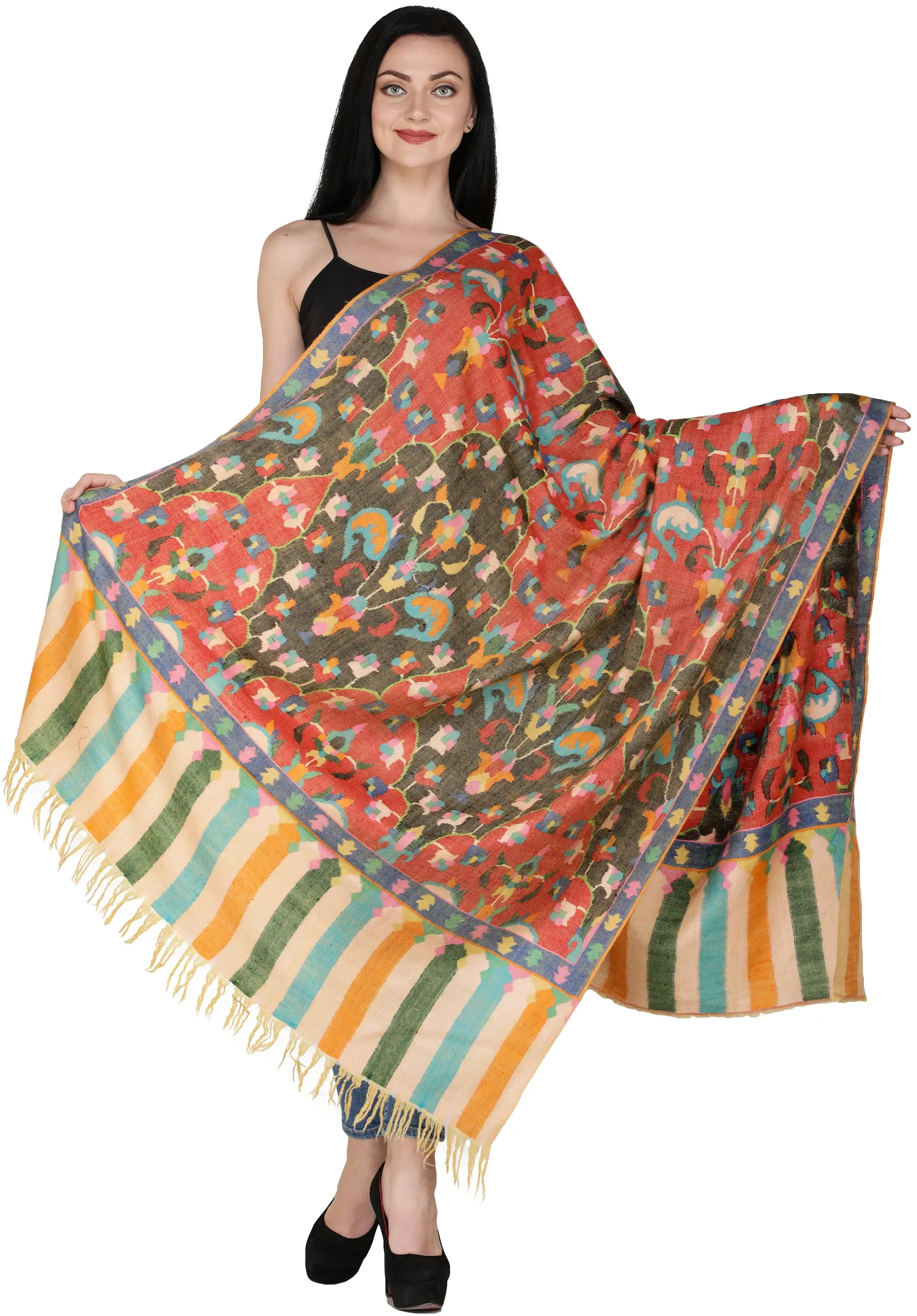 Pure Pashmina Shawl with All-Over Intricate Sozni Embroidered Paisleys in Multicolor Thread and Kani Border