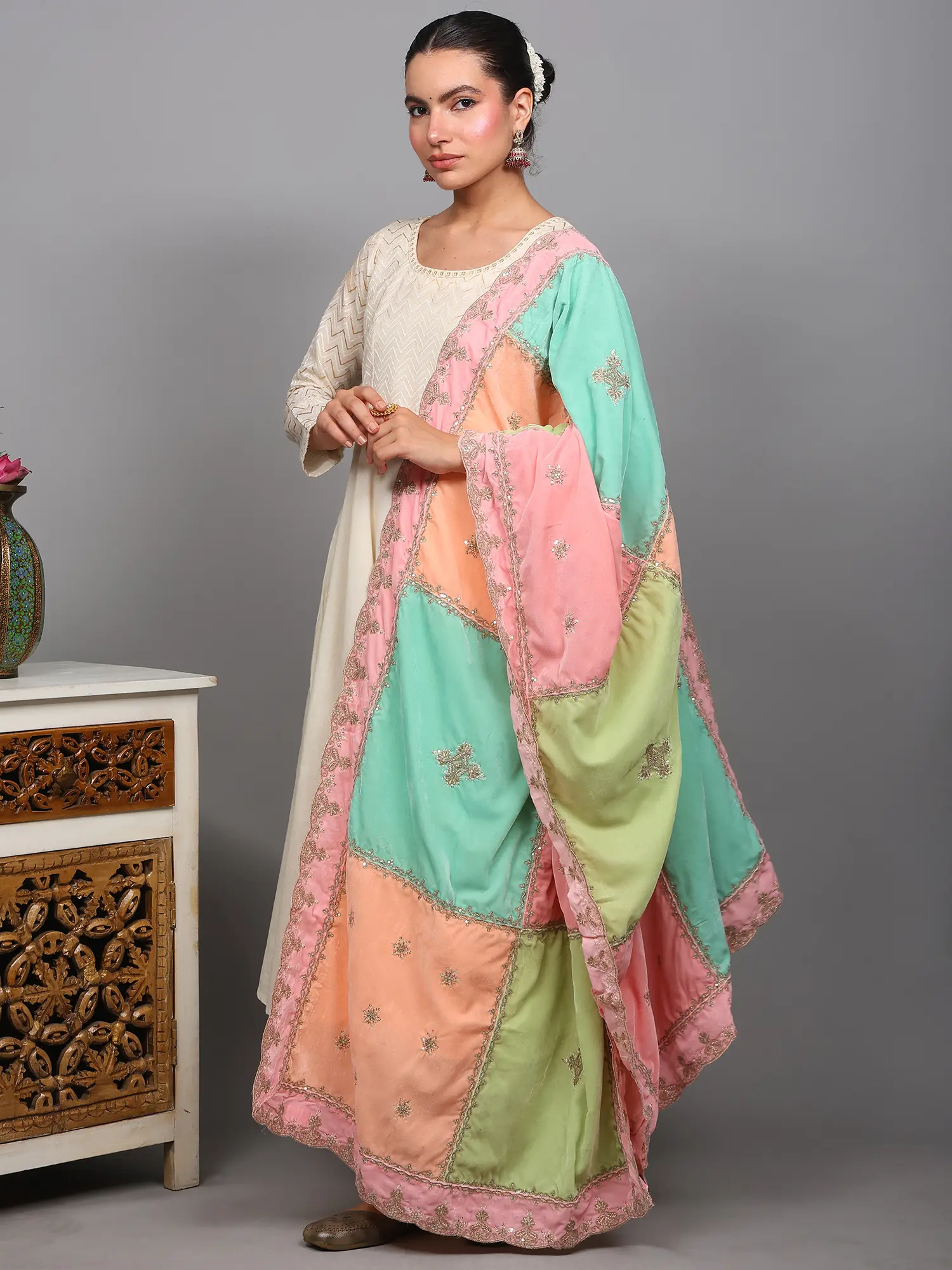 Multicolor Patch Work Velvet Dupatta with Sequins-Zardozi Embroidery and Scalloped Border