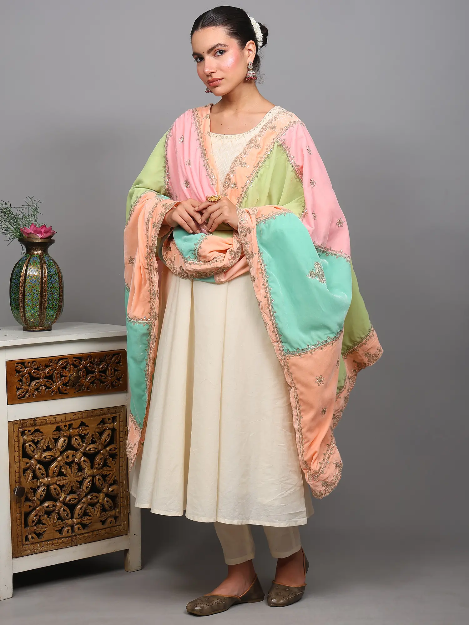 Framing this vibrant patchwork is a scalloped border that adds a final touch of elegance. This border is a delicate dance of embroidery and shimmering details, mirroring the richness found within the main body of the dupatta. The soft pink hue of the border complements the pastel tones within the patchwork, creating a harmonious and eye-catching effect. This thoughtfully designed border ensures that the dupatta makes a statement from every angle, whether draped elegantly over the shoulders or cascaded down the arm. It’s an accessory designed to draw attention and admiration. This versatile dupatta is the perfect accompaniment to a wide range of ethnic wear. Pair it with a simple kurta and palazzo set to let its intricate details shine, or complement a more elaborate lehenga or anarkali for a truly grand occasion. Its generous dimensions ensure it can be styled in numerous ways, from a classic drape to a more contemporary wrap. Add this piece to your wardrobe for an instant infusion of color, texture, and artisanal beauty, perfect for weddings, festivals, or any special event where you want to make a memorable impression.