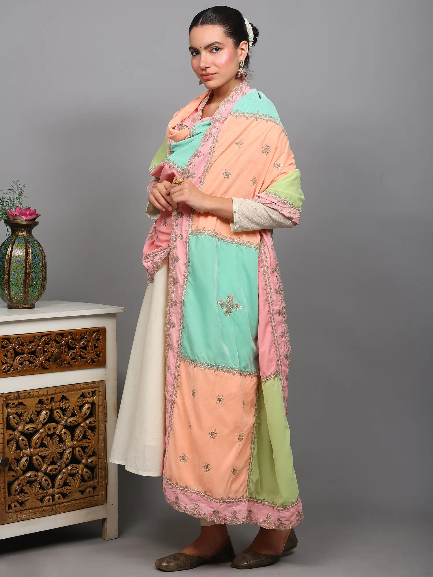 Elevate your ethnic ensemble with this exquisite velvet dupatta, a true masterpiece of traditional Indian artistry. Crafted from sumptuously soft velvet, this dupatta drapes beautifully, offering both comfort and a luxurious feel. Its captivating design is a celebration of vibrant hues, featuring a unique patchwork of pastel shades – soft peach, gentle mint green, and delicate blush pink. Each color panel is meticulously joined, creating a visually stunning mosaic that is both modern and timeless.