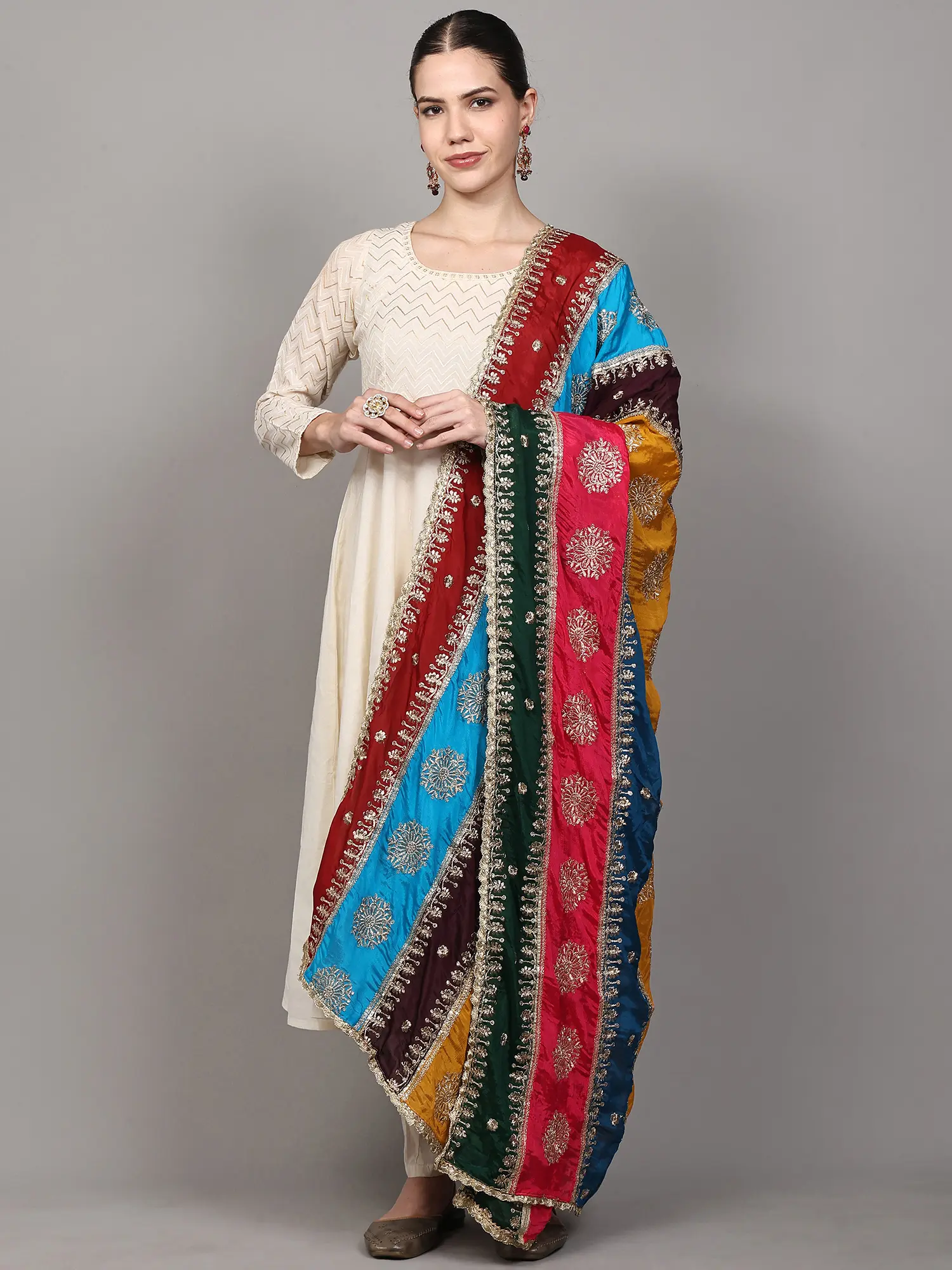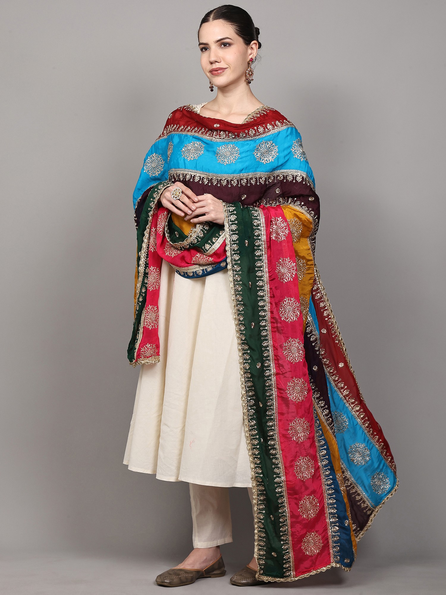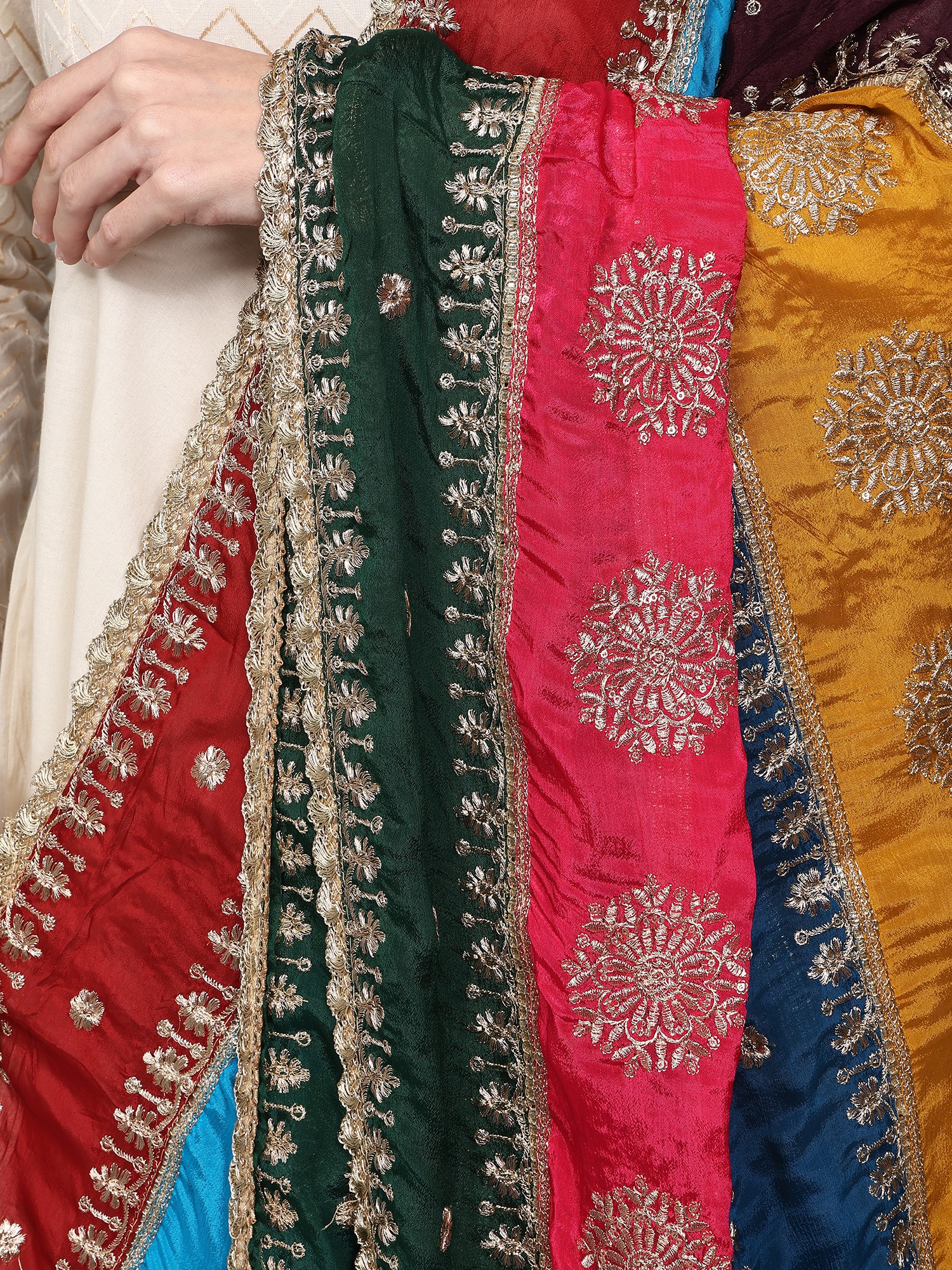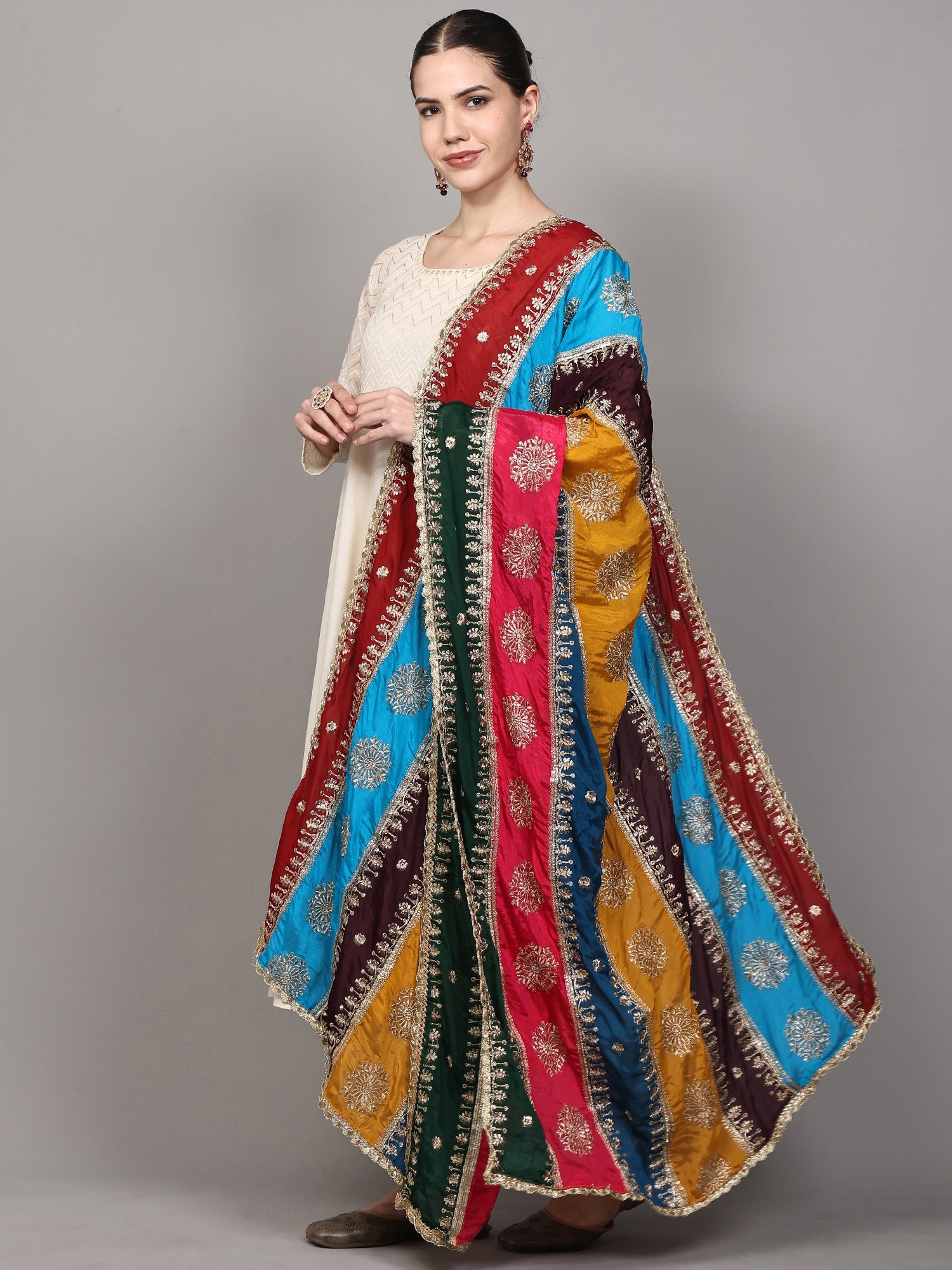 The heart of this dupatta lies in its captivating multicolor patchwork. Bold, alternating stripes of rich ruby red, vivid sky blue, deep plum, radiant marigold yellow, striking sapphire blue, and lush forest green create a dynamic and eye-catching visual. Each stripe is a carefully chosen hue, harmonizing to form a vibrant rainbow that promises to bring joy and sophistication to your attire. Adding a touch of divine elegance, the dupatta is adorned with exquisitely embroidered chakras in shimmering golden thread. These auspicious motifs, meticulously placed within each colored panel, catch the light beautifully, lending an aura of opulence and tradition. The intricate golden embroidery speaks of skilled craftsmanship and an appreciation for timeless symbolism.