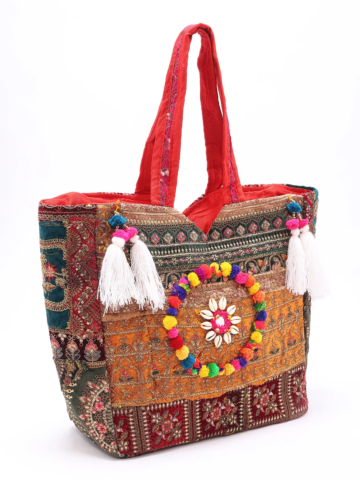 Patchwork Shopper Bag from Kutch with Zari-Mirror Embroidery and Pom Poms