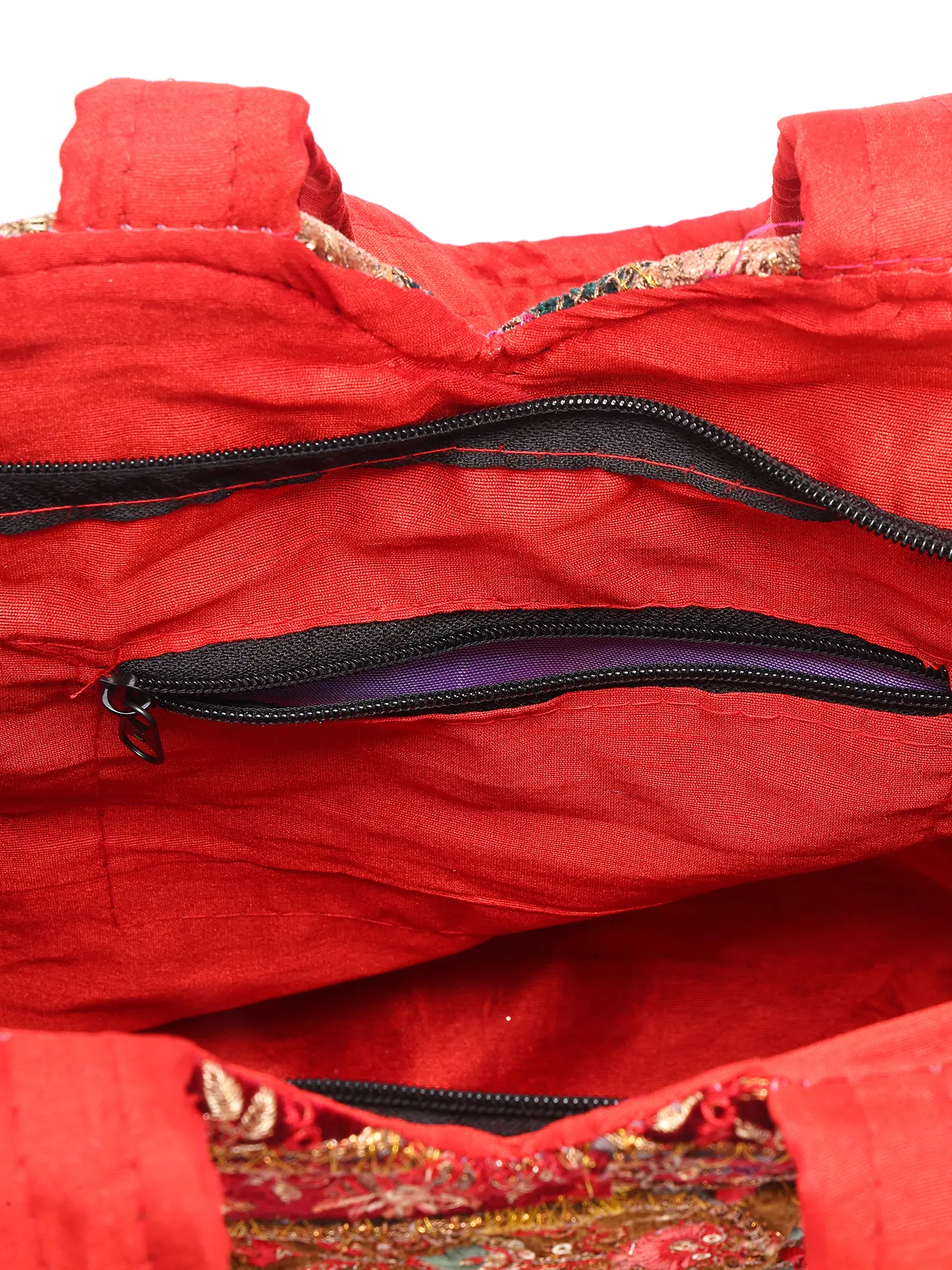The defining feature of this stunning bag is its masterful patchwork, a symphony of carefully selected fabric pieces that come together in a harmonious mosaic. These fabrics are not merely plain cloth; they are adorned with the resplendent glow of zari thread and shimmering sequins. Intricate embroidery patterns, inspired by traditional motifs, are meticulously worked into the design, creating a tactile and visual feast for the eyes. The interplay of rich jewel tones and earthy hues, accented by the sparkling allure of sequins, evokes the spirit of festivity and opulence.