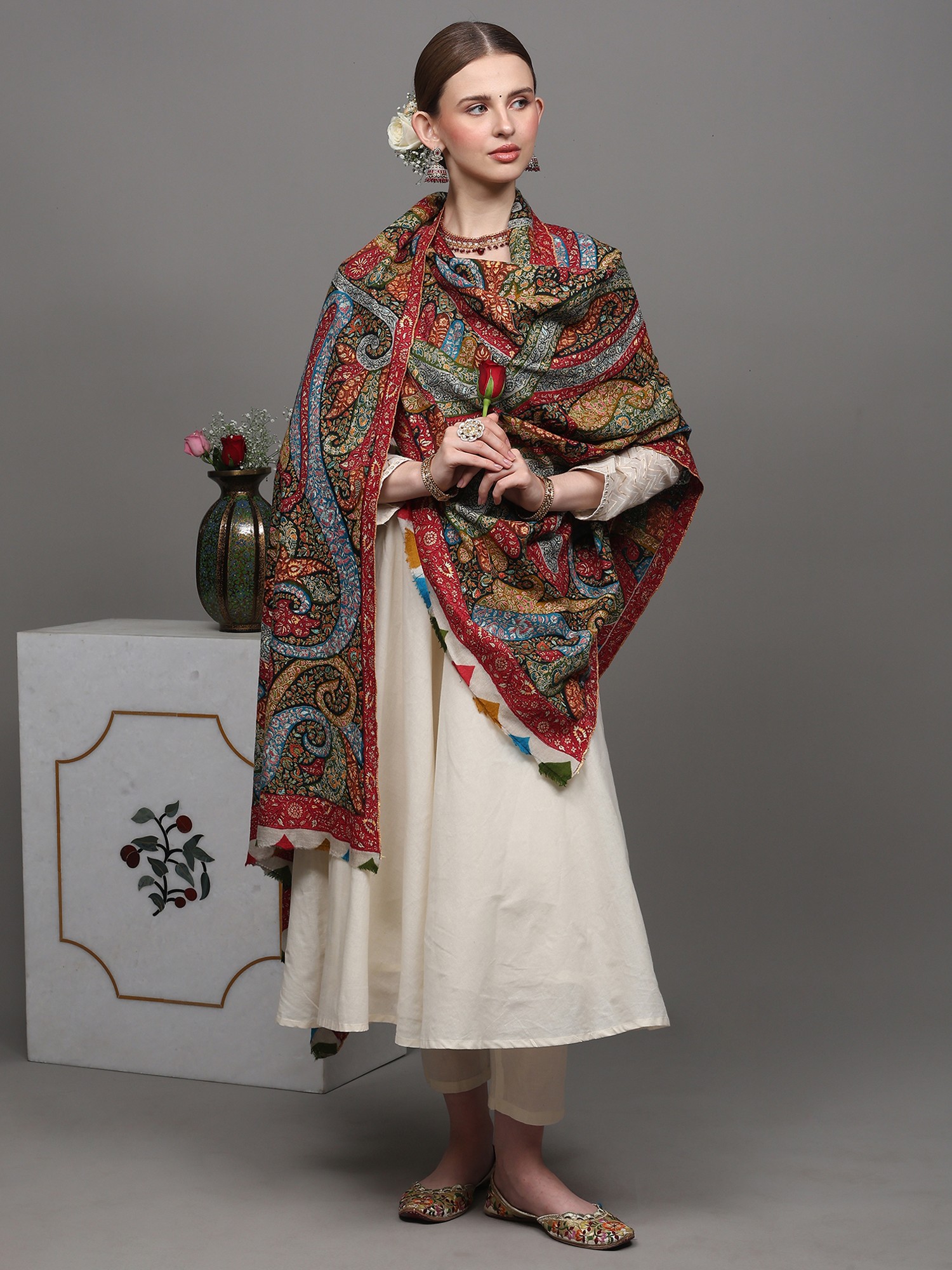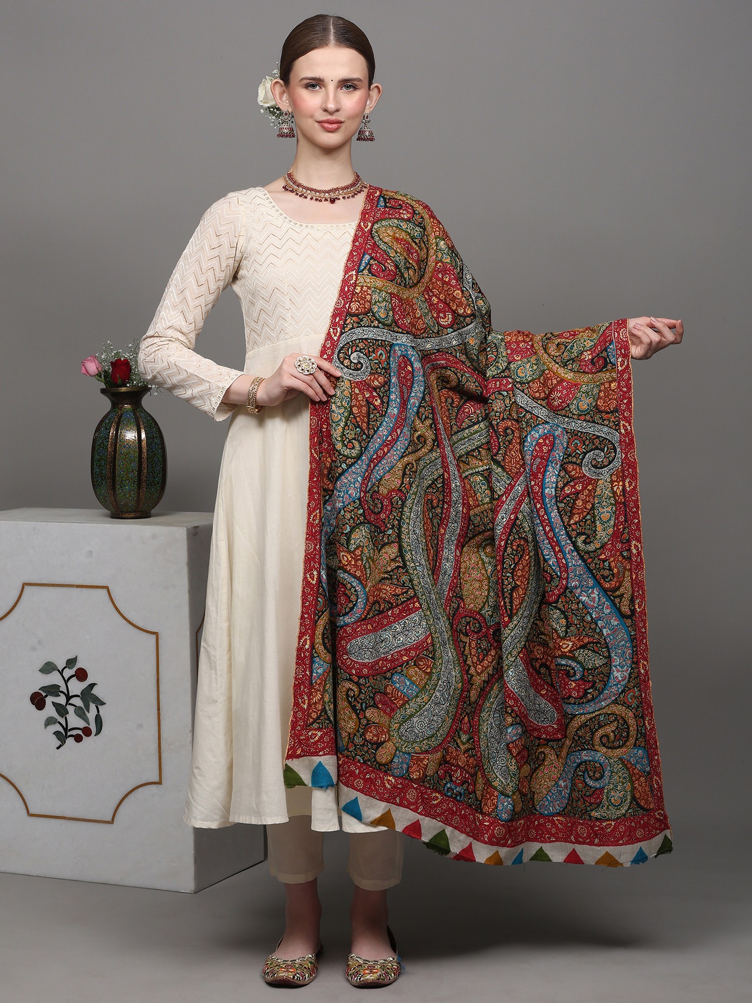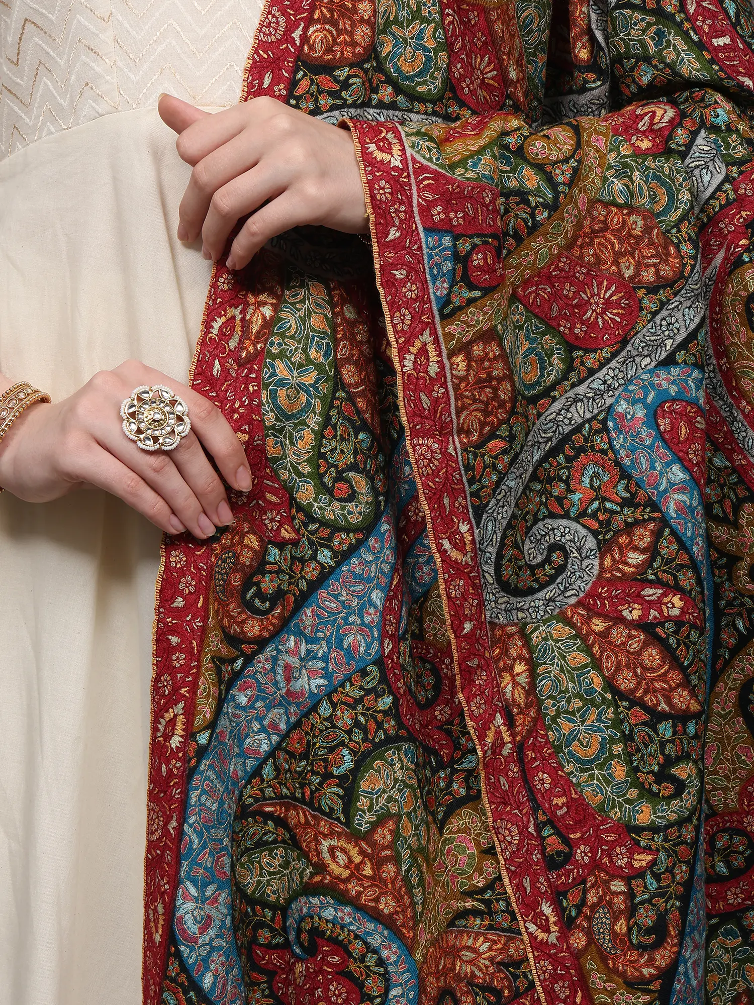 Pashminas are proudly owned and passed down through generations as an heirloom. It has been long associated with opulence and royalty. This Pashmina Multicolored Shawl is a testament to Kashmir's artistic prowess and Pashmina's status. Crafted from the finest Cashmere, it dazzles with a full-body tapestry of intricate paisley patterns meticulously brought to life through the refined artistry of Sozni embroidery. Sozni, a jewel in the world of needlework, stands as one of the most sophisticated and delicate forms of embroidery exclusive to Kashmir. The vibrant hues and intricate detailing of this shawl showcase the unparalleled craftsmanship that Kashmiri artisans are celebrated for worldwide. Adorn yourself in this masterpiece, and experience the heritage, culture, and unparalleled artistry of the Kashmiri tradition.