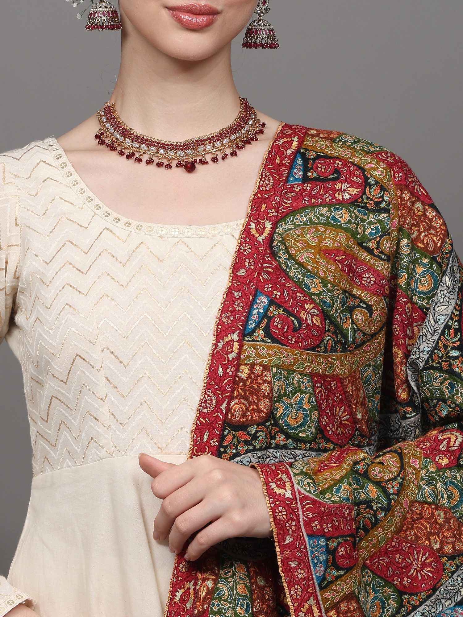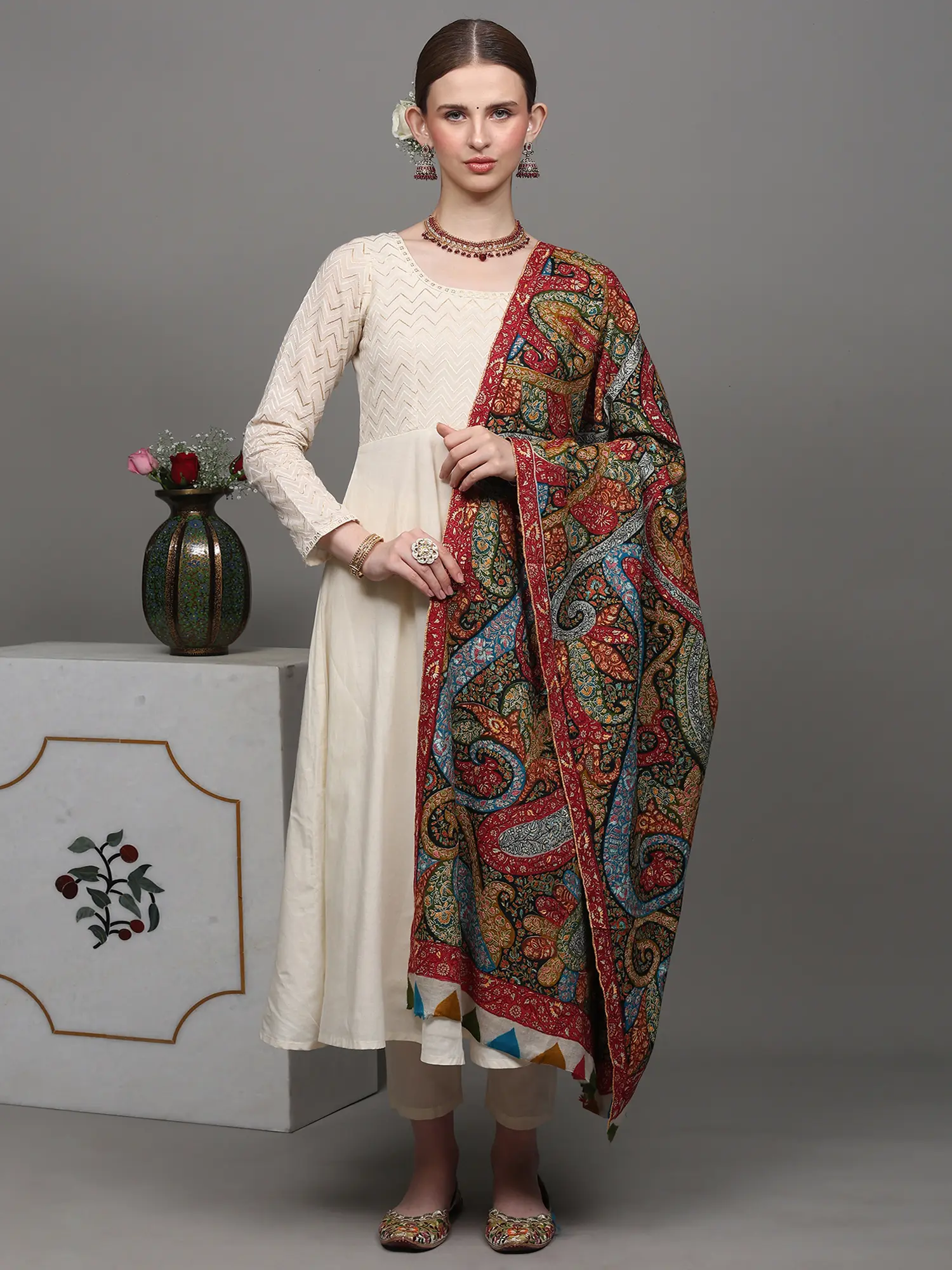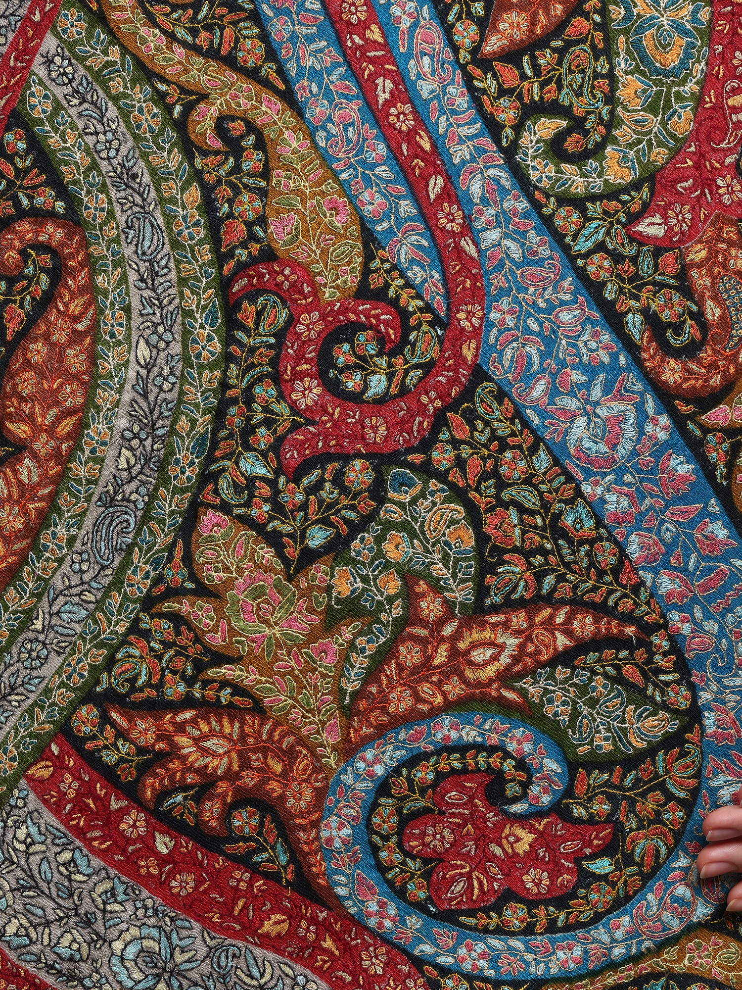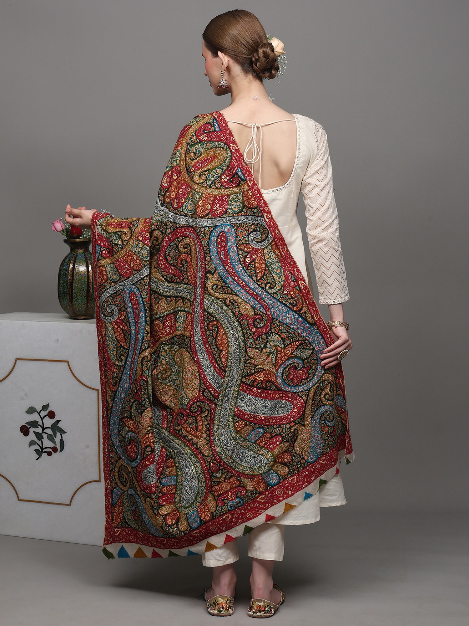 Pashminas are proudly owned and passed down through generations as an heirloom. It has been long associated with opulence and royalty. This Pashmina Multicolored Shawl is a testament to Kashmir's artistic prowess and Pashmina's status. Crafted from the finest Cashmere, it dazzles with a full-body tapestry of intricate paisley patterns meticulously brought to life through the refined artistry of Sozni embroidery. Sozni, a jewel in the world of needlework, stands as one of the most sophisticated and delicate forms of embroidery exclusive to Kashmir. The vibrant hues and intricate detailing of this shawl showcase the unparalleled craftsmanship that Kashmiri artisans are celebrated for worldwide. Adorn yourself in this masterpiece, and experience the heritage, culture, and unparalleled artistry of the Kashmiri tradition.