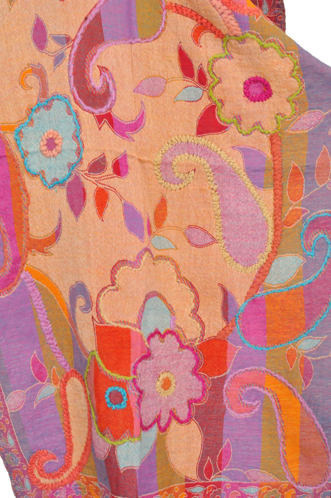 The heart of this stole lies in its elaborate woven paisleys, iconic symbols of fertility and life, rendered in a harmonious blend of colors. Complementing these woven elements are delicate wool-embroidered details. These handcrafted touches add depth and texture, showcasing the artisan's skill and attention to detail. From the swirling tendrils to the blooming flowers, every stitch is a testament to enduring quality and timeless elegance. The generous dimensions of this stole provide ample coverage, allowing it to be draped, wrapped, or tied in numerous ways. Whether you're seeking to add a splash of color to a casual ensemble or a touch of sophisticated charm to evening wear, this stole is guaranteed to turn heads. The soft, natural fibers provide a comfortable drape, while the rich coloration ensures it remains a focal point of any outfit. Embrace the blend of traditional artistry and contemporary fashion with this truly unique and beautiful accessory.