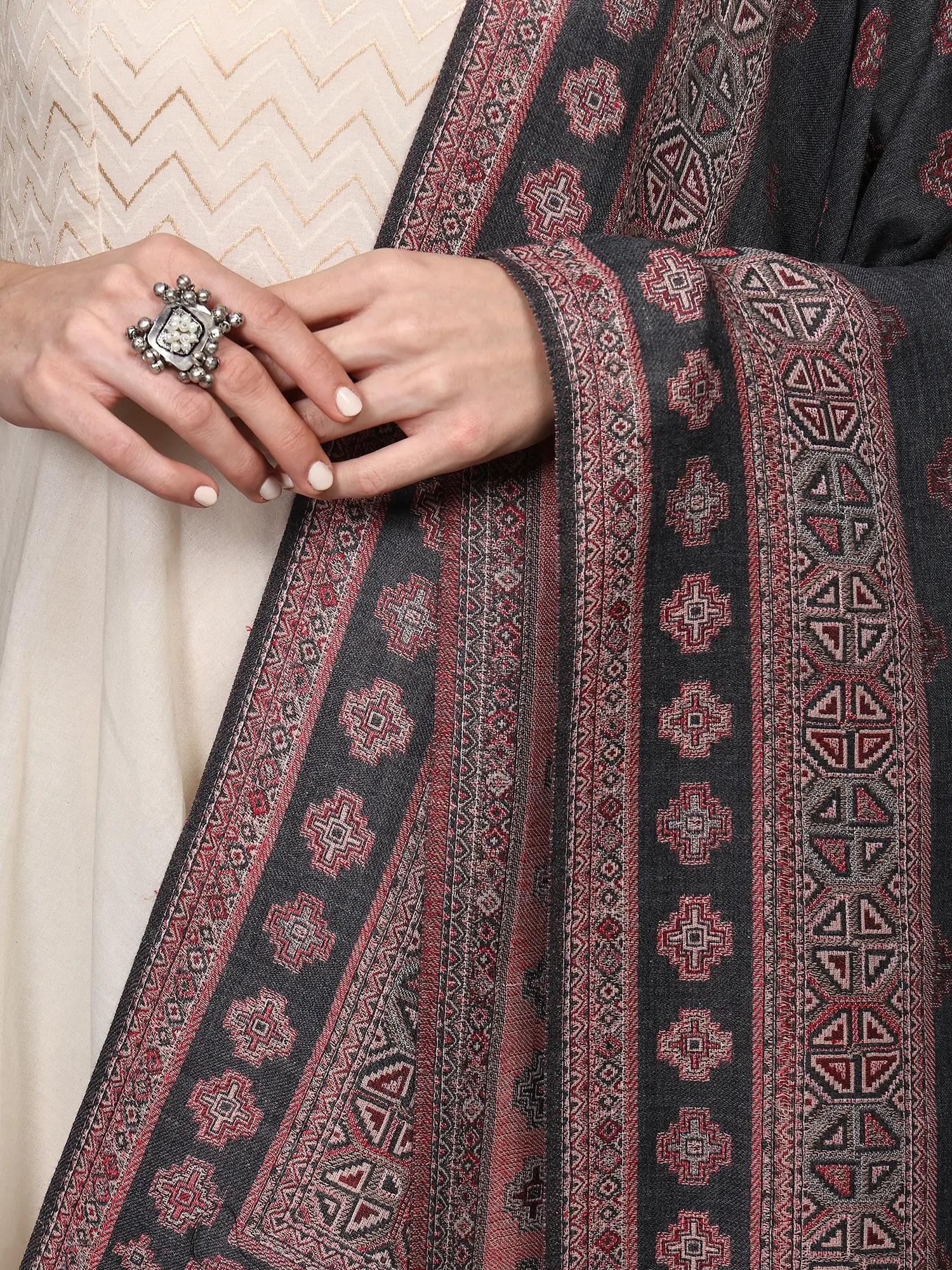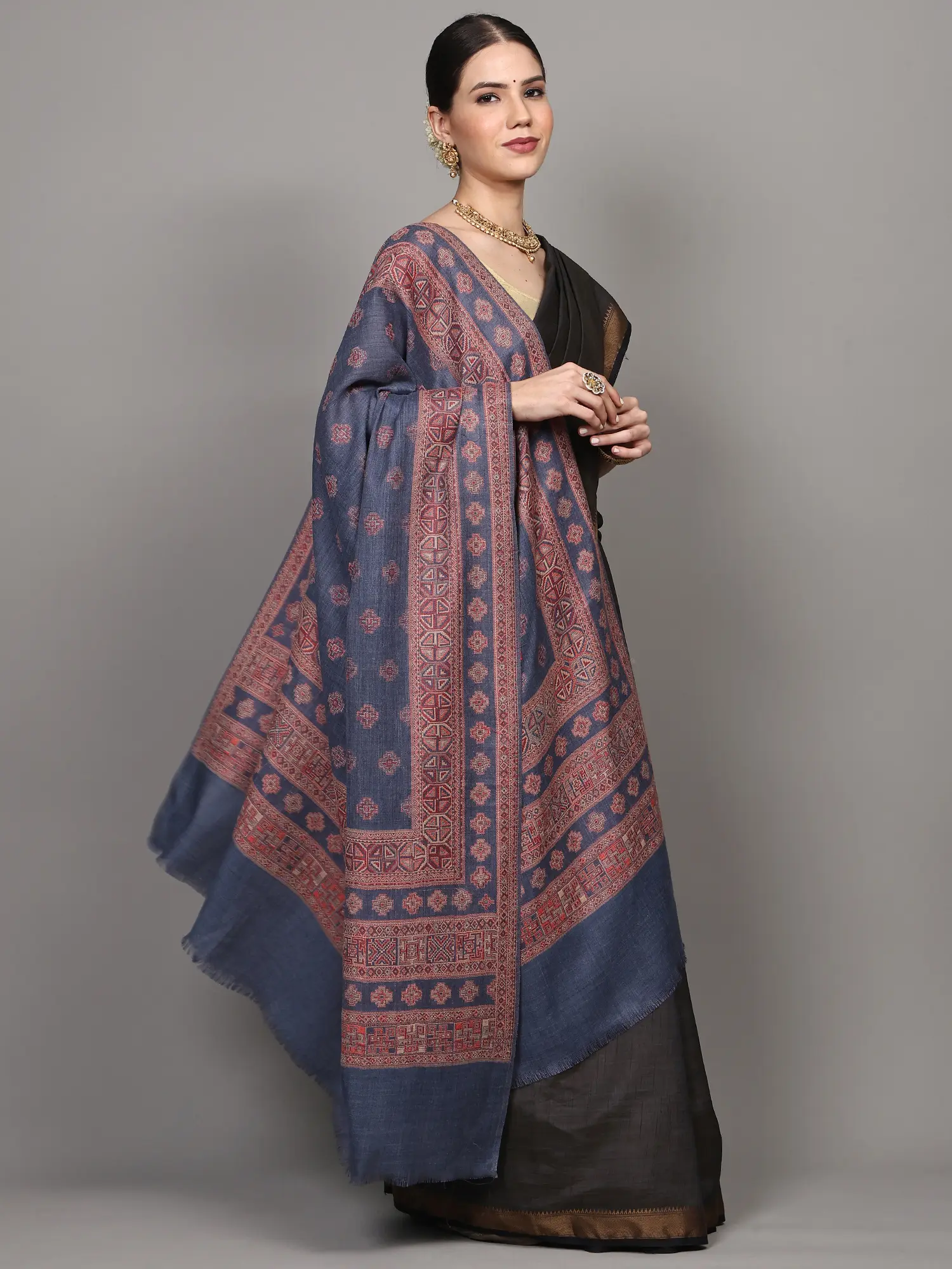 This shawl transcends seasonal trends and fleeting fashions. Its timeless design and the inherent quality of wool make it a versatile addition to any wardrobe. Pair it with traditional Indian attire like kurtis and salwar kameez for an authentic and elegant aesthetic. Alternatively, use it to add a touch of bohemian charm or cultural richness to your contemporary Western wear. Drape it over a simple dress, a pair of jeans and a top, or a tailored coat to instantly transform your look from ordinary to extraordinary. The intricate border, a symphony of patterns within patterns, provides a beautiful frame, while the scattered motifs across the body add depth and interest.