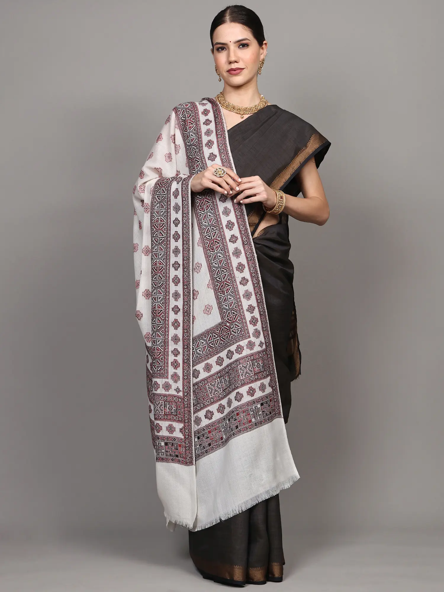 Shawl from Kutch with Embroidered Bootis and Golden Woven Border