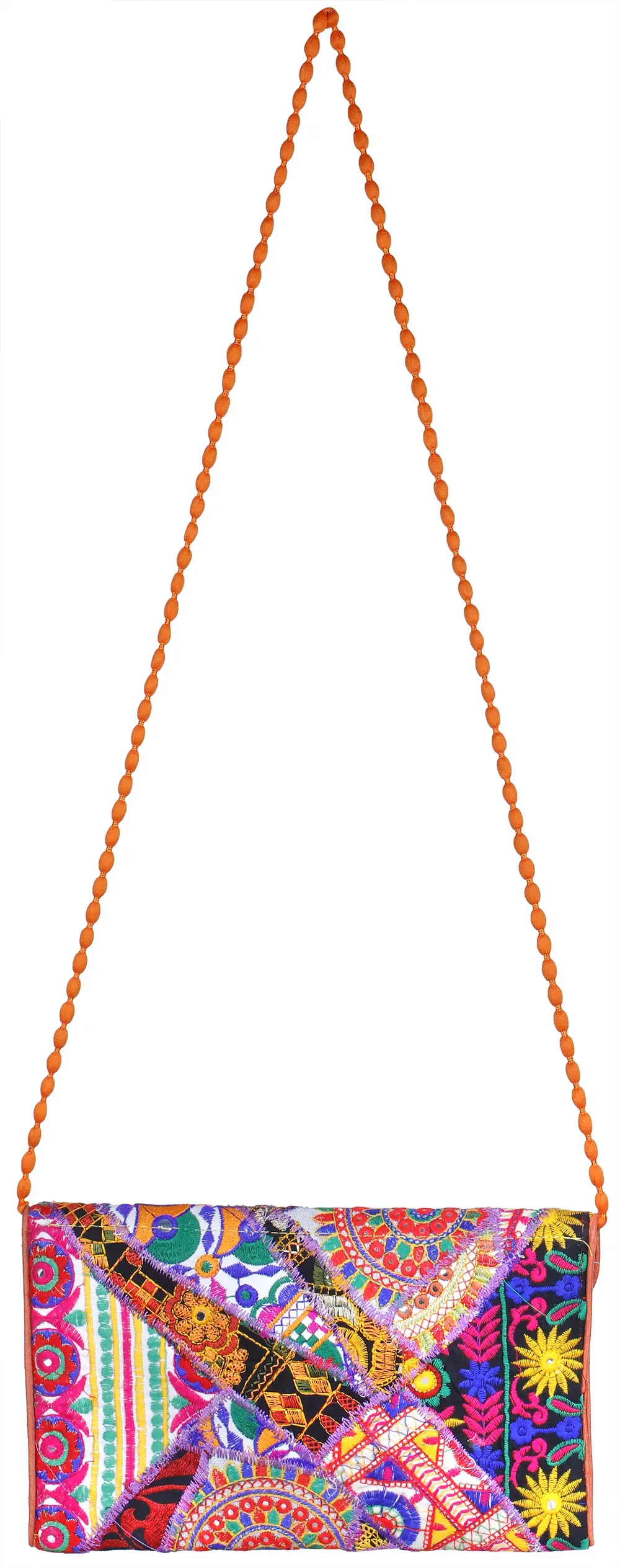 Elevate your simple ethnic look with a touch of traditional glamour that this multicolor embroidered clutch carries. With a long strap and front flap, the bag is beautified by classic mirrorwork and embroidery that is inspired by the ethnic tapestry of Indian textiles.