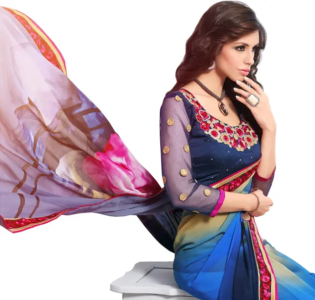 Georgette in modern Indian renditions of sarees is a beloved fabric, for its stylish feel and breathable embrace. This multicolor floral printed saree uses the chic qualities of georgette, to create a vibrant effect all over the field. Eye-catching floral prints on the ground of the saree, are outlined by a richly embroidered patch border, beautifully stitched to give the drape a hint of traditional intricacy.