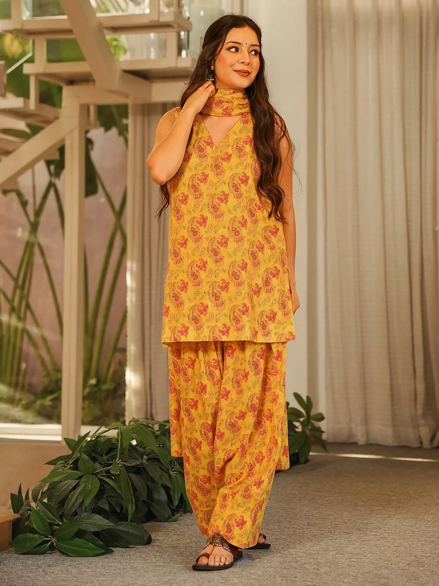 Floral Motif Cambric Cotton Suit Set - Yellow with Square Neck & Dupatta