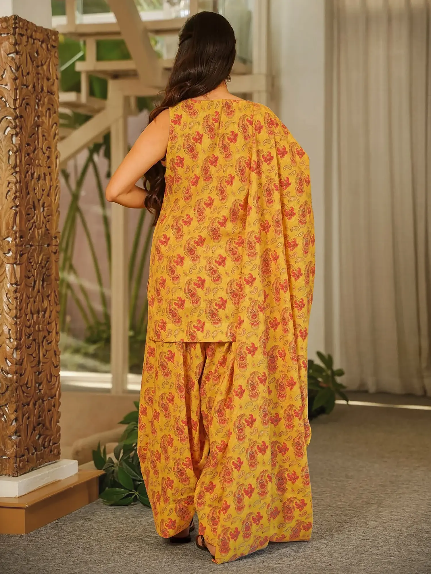 Yellow Chinon Beads Embroidered Indo Western Suit With Sleeveless Crop Top Flowy Palazzo And Matching Dupatta