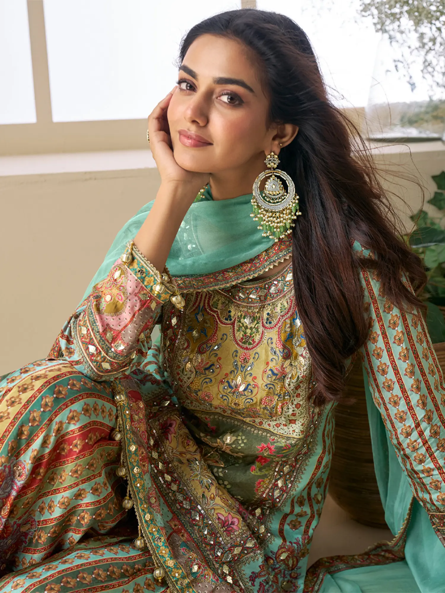 Chinon Palazzo Suit With Multi Thread Sequin Embroidery Work For Festive Wedding And Party Wear For Women And Girls