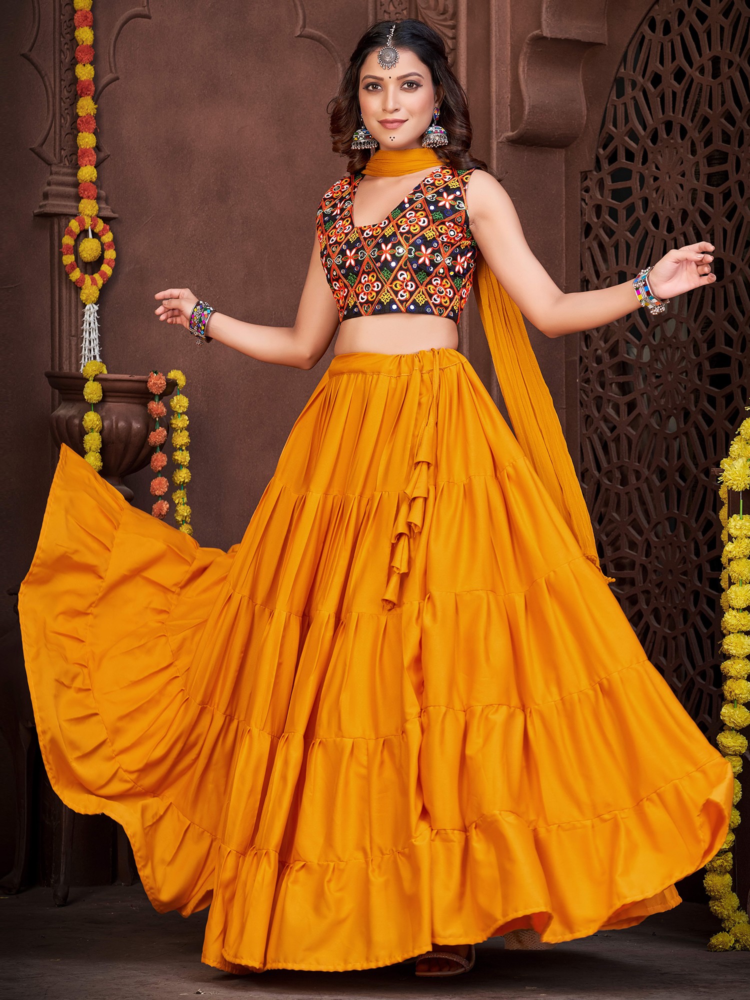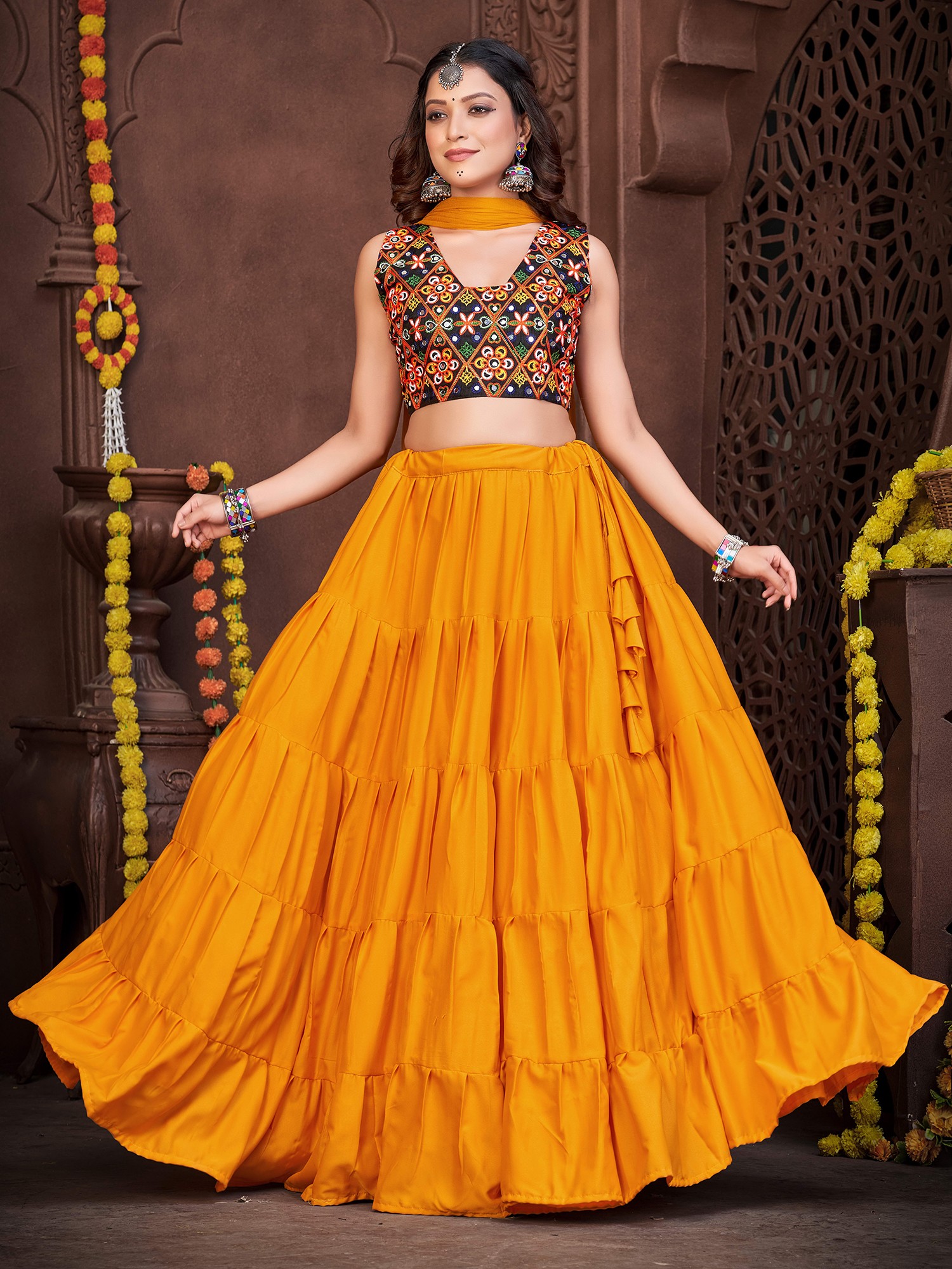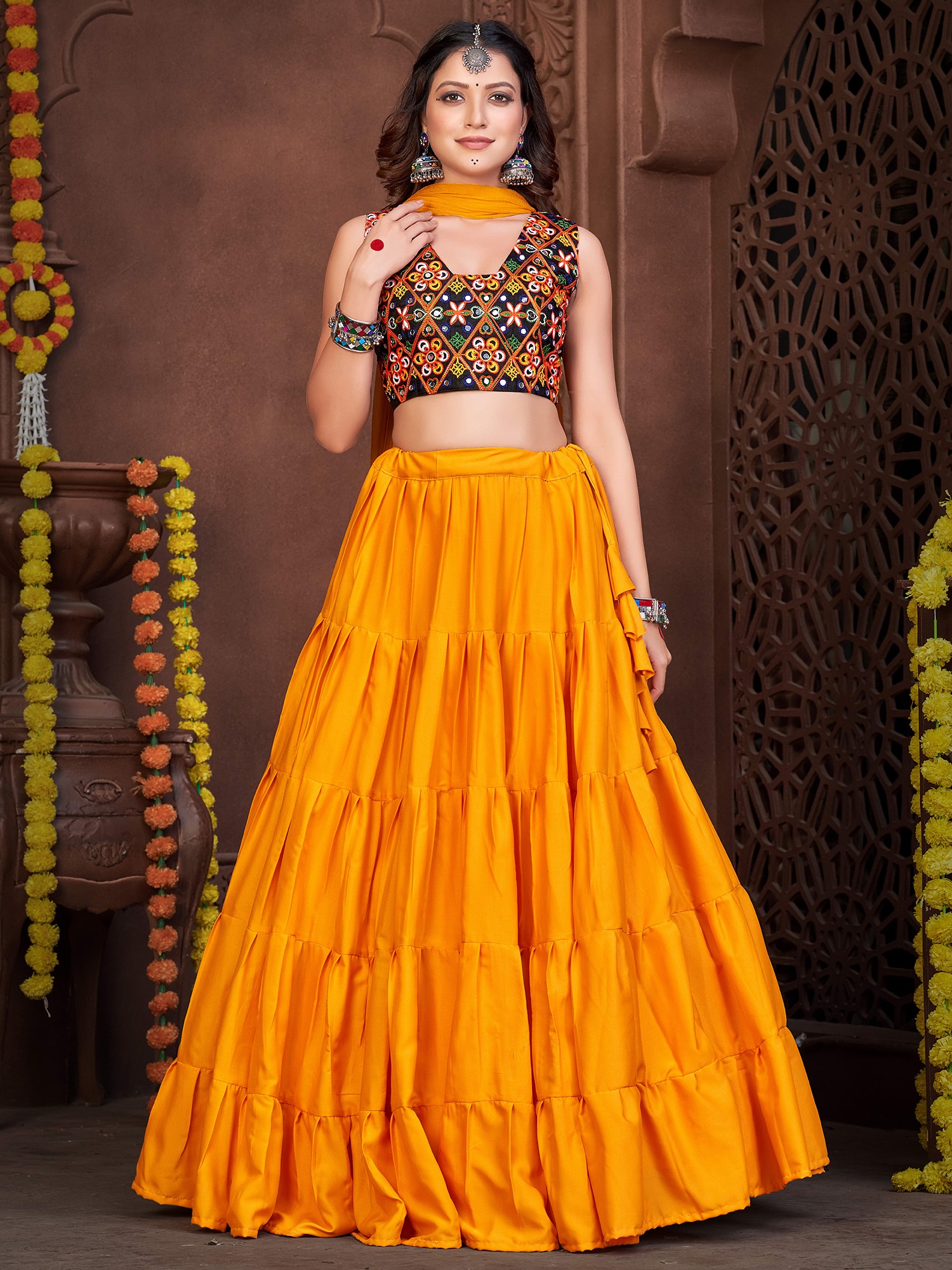 Dance with an effortless and stylish appeal dressed in this French crepe designer lehenga, a union of classic and chic beauty. The soft crepe fabric flows marvelously in the lehenga, with a ruffled effect giving it a graceful look. The choli or blouse is adorned with vivid embroidery work, inspired by the style of Gujarat, where threads and mirrors are a staple element in festive wear.