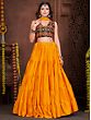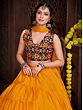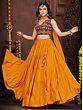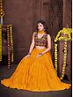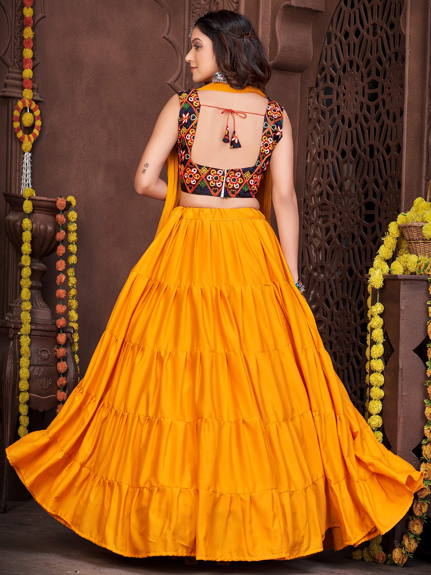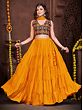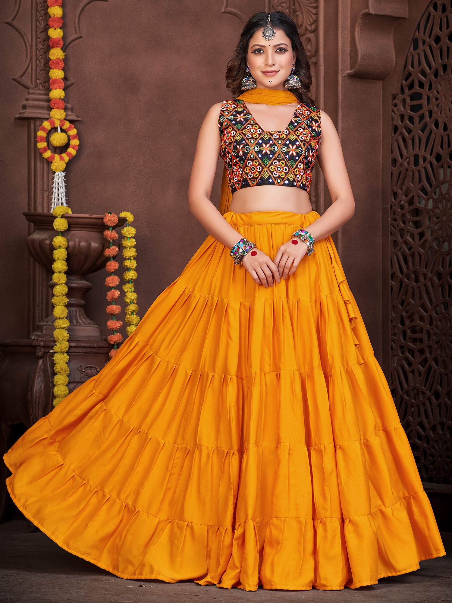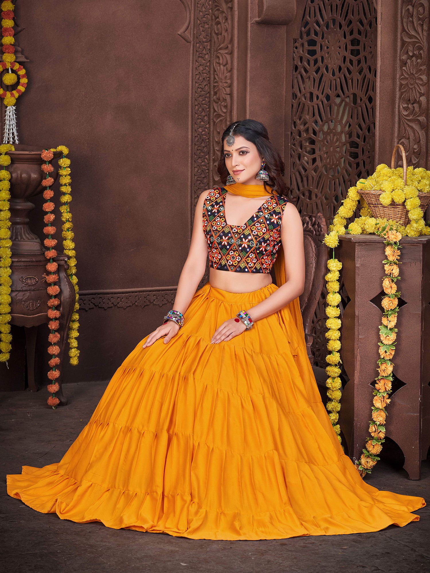 Dance with an effortless and stylish appeal dressed in this French crepe designer lehenga, a union of classic and chic beauty. The soft crepe fabric flows marvelously in the lehenga, with a ruffled effect giving it a graceful look. The choli or blouse is adorned with vivid embroidery work, inspired by the style of Gujarat, where threads and mirrors are a staple element in festive wear.
