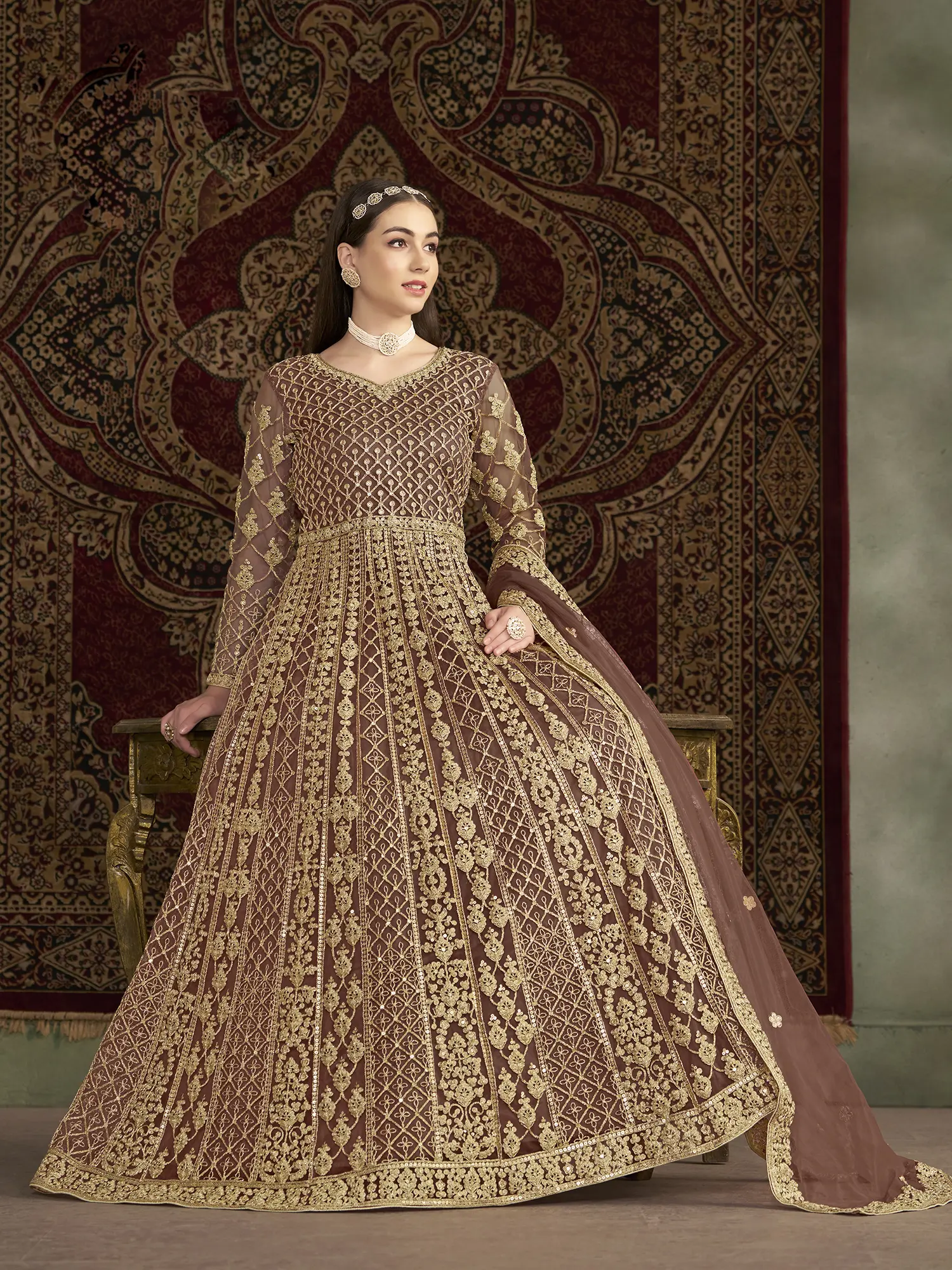 Complete your ensemble with the included matching dupatta. Made from the same exquisite net fabric, the dupatta features delicate embellishments that complement the gown perfectly. Drape it gracefully over your shoulders or let it flow freely for an added touch of elegance and sophistication. This versatile accessory allows you to customize your look and express your personal style.