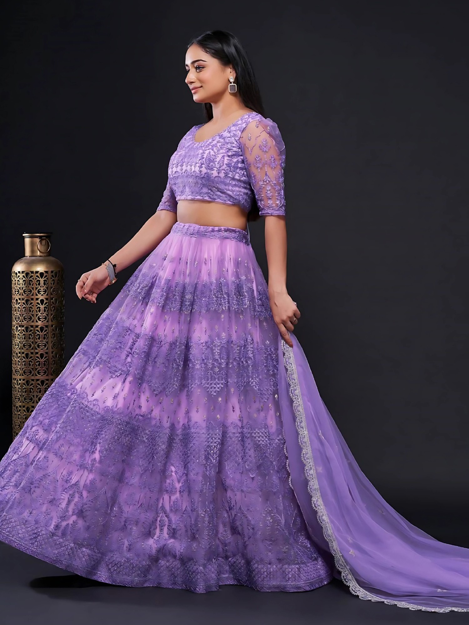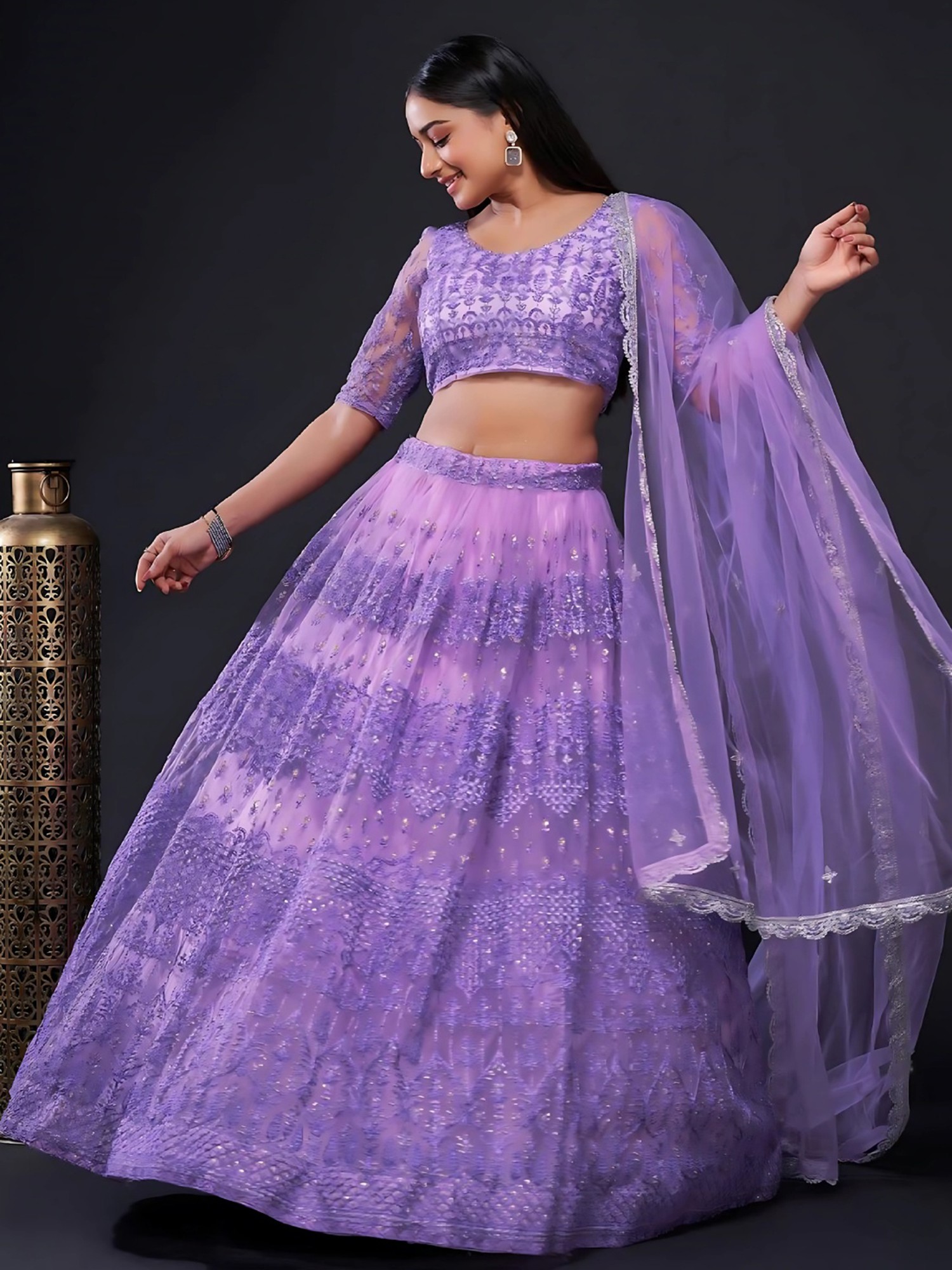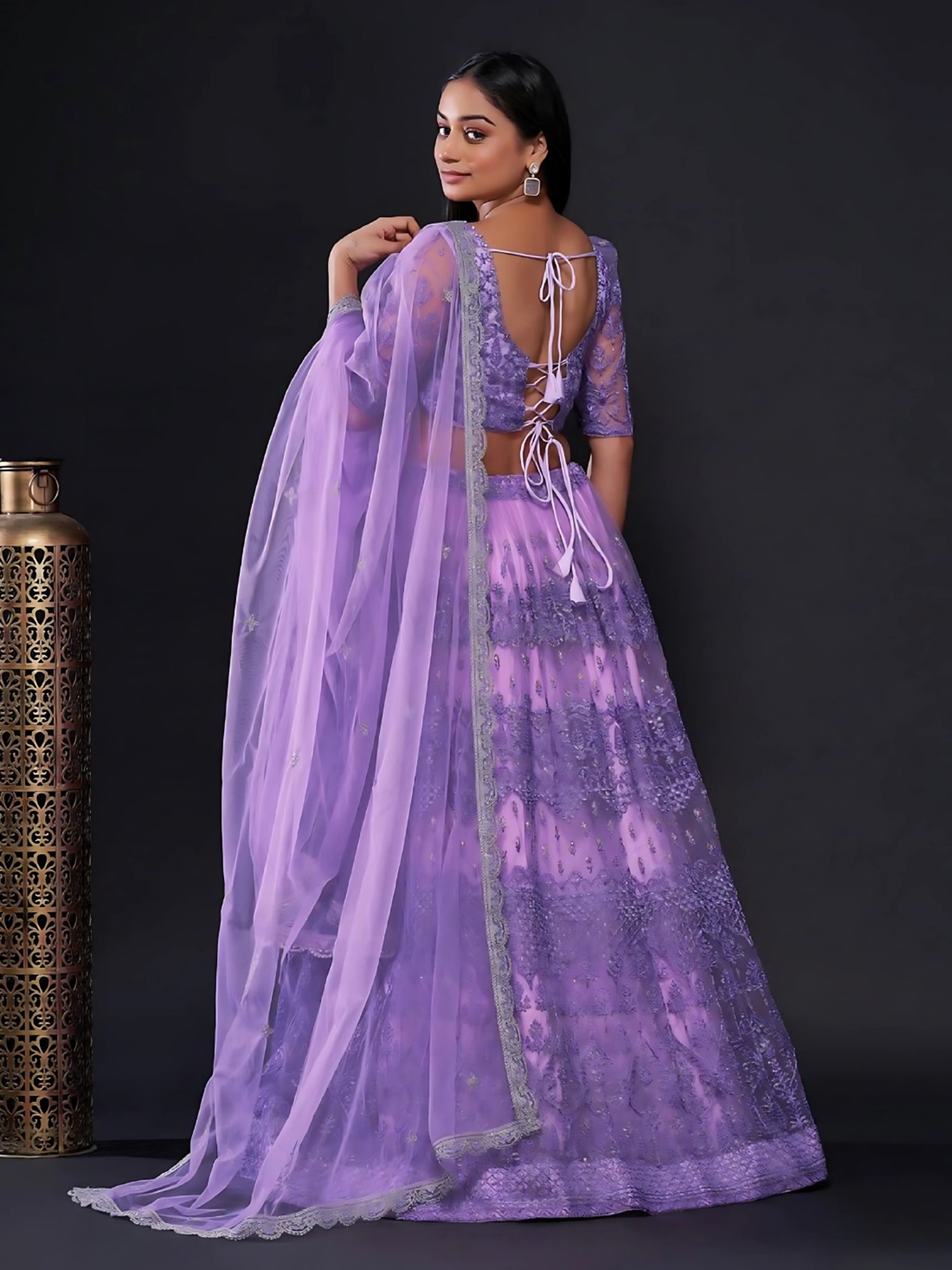 Light-Pink Soft Net Thread Embroidered Lehenga Choli with Sheer Dupatta