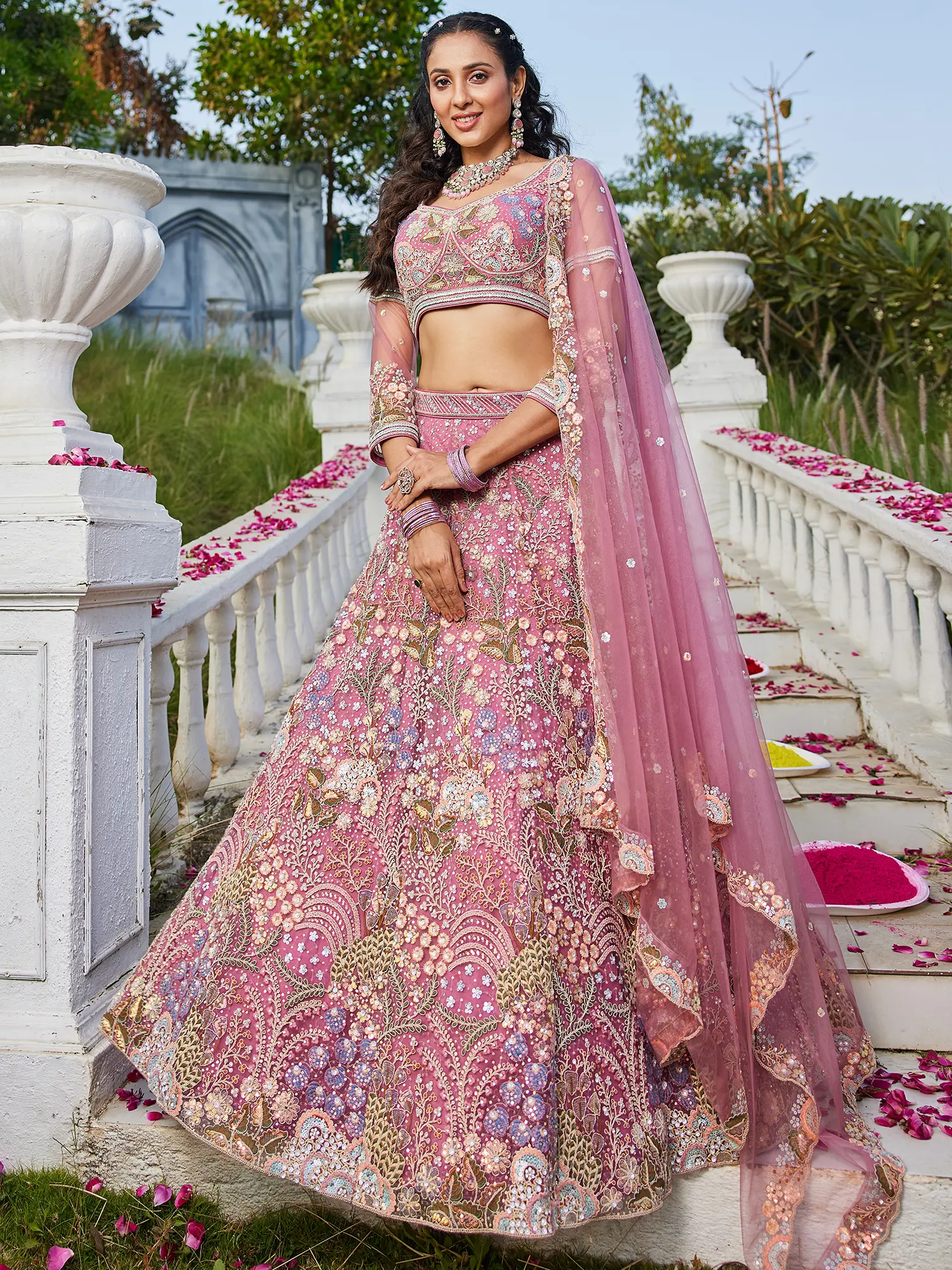 Light-Pink Soft Net Thread Embroidered Lehenga Choli with Sheer Dupatta