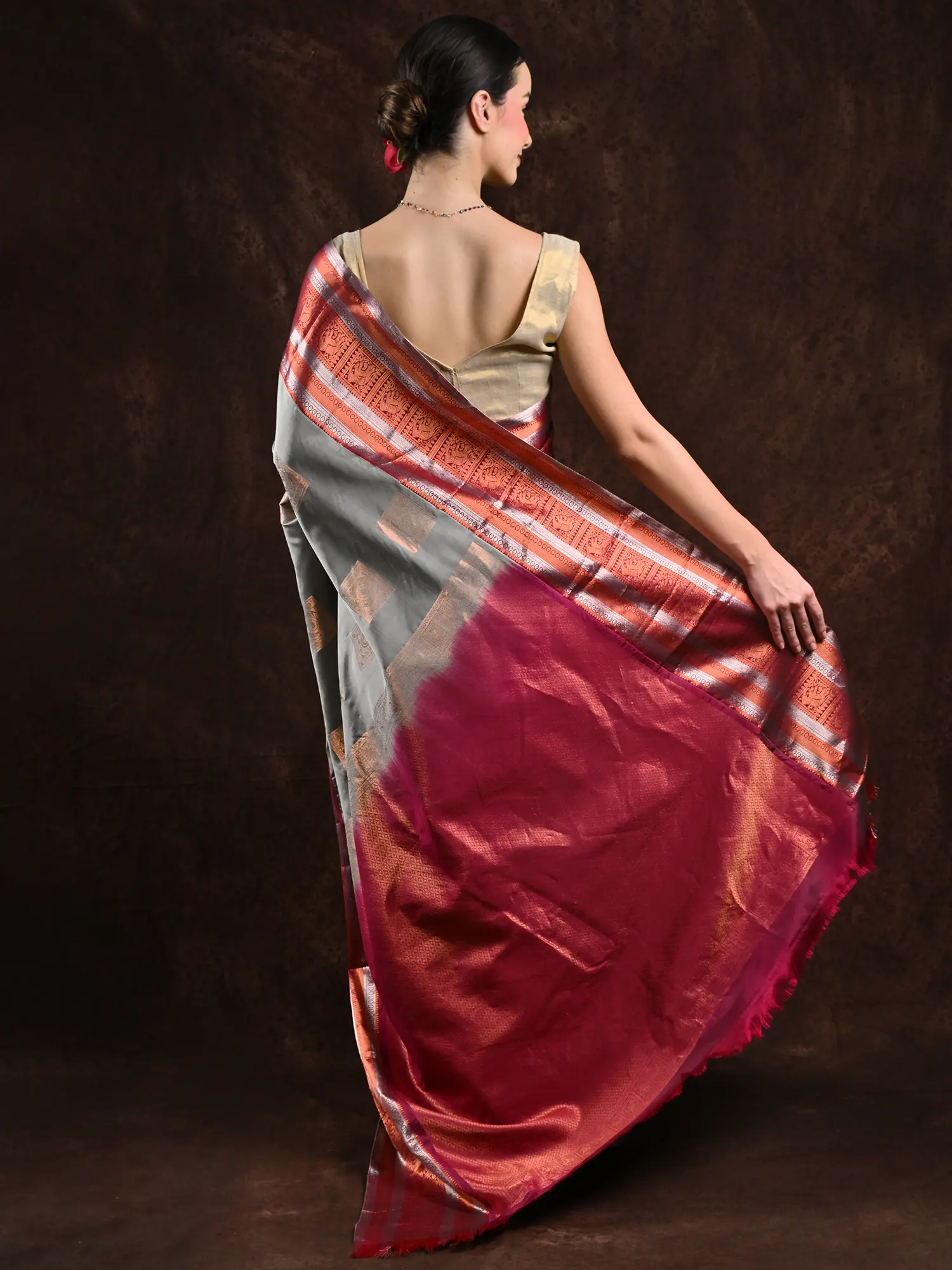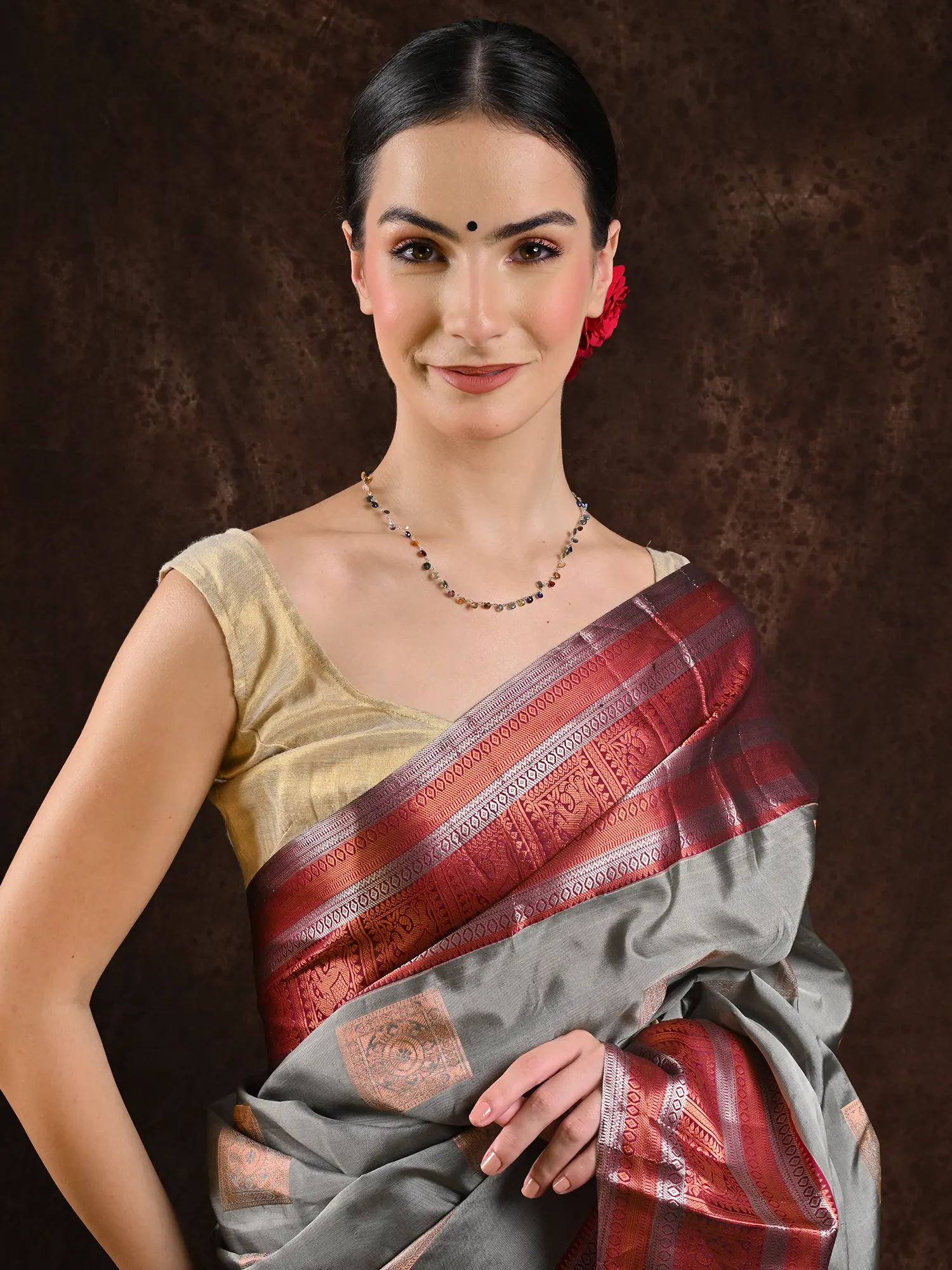 This neutral-gray Kanjivaram combines the timeless weave of the South Indian saree, with the modern appeal of grey, creating refined ethnic wear.