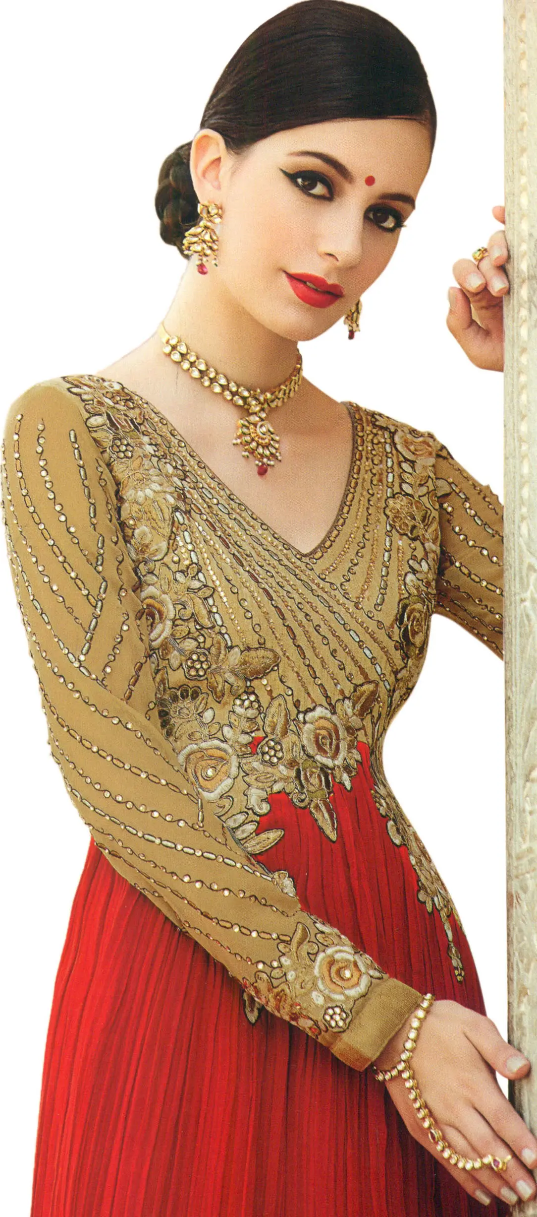 Step into a realm of exquisite style and captivating charm with this breathtaking Anarkali suit. Designed to make you the undeniable center of attention, this ensemble is a masterpiece of traditional Indian craftsmanship blended with contemporary design. The rich, vibrant red of the flowing skirt is a celebration of boldness and festivity, perfectly complemented by the sophisticated wheat-toned yoke and sleeves. This striking contrast creates a visually stunning silhouette that is both modern and timeless.
