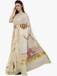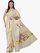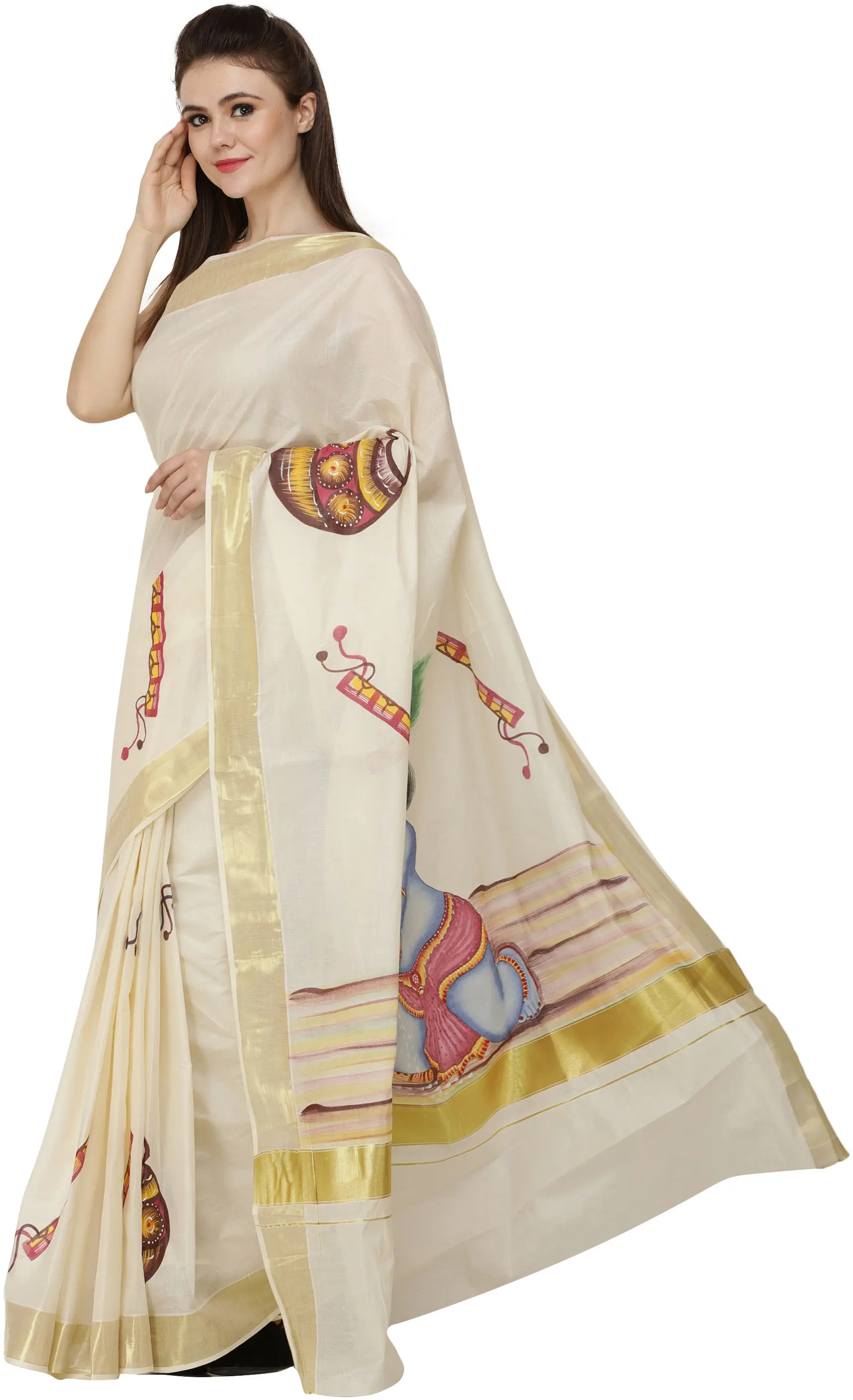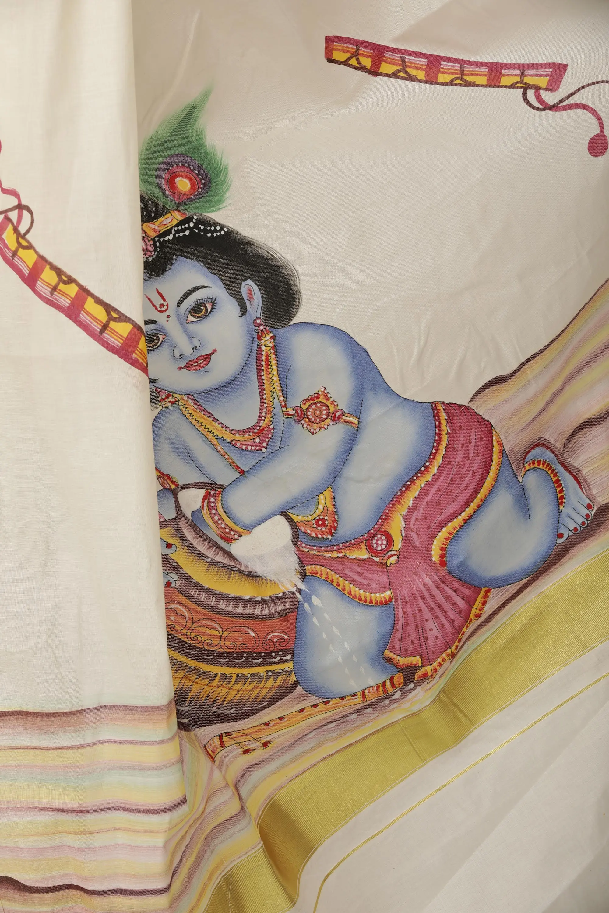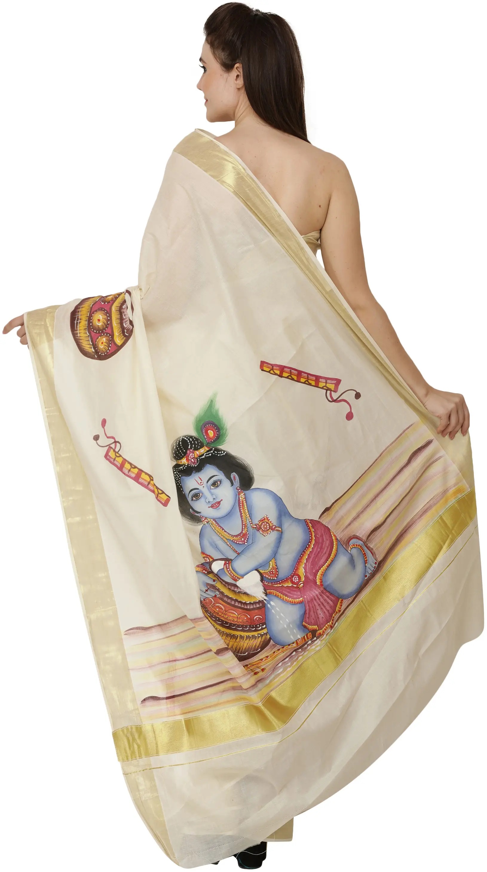 Off-White Kasavu Sari from Kerala with Zari-Woven Border and Butter-Thief Krishna (Baal Gopal)