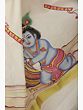 What sets this sari apart is its unique and charming hand-painted motif depicting Lord Krishna in his playful 'Baal Gopal' avatar, famously known for his mischievous antics of stealing butter. This artistic rendition brings a touch of divinity and a sense of whimsical storytelling to the traditional drape. The vibrant blue of Krishna's skin, contrasted with the bright pink and gold hues of his attire and the earthy tones of the background, creates a visually engaging narrative. The motifs are thoughtfully placed, ensuring that this divine imagery graces your sari with grace and subtle artistry, sparking conversations and admiration wherever you go.