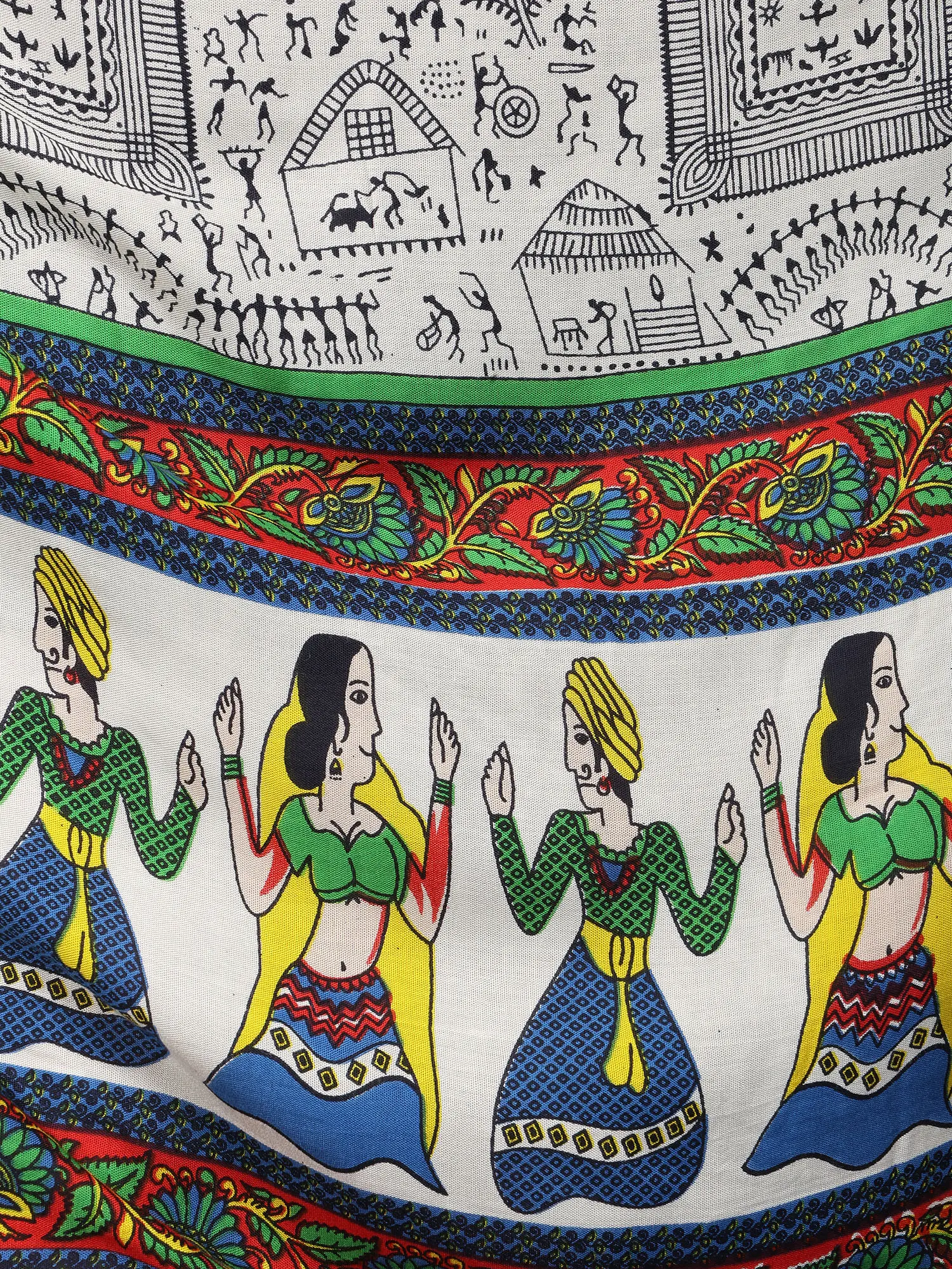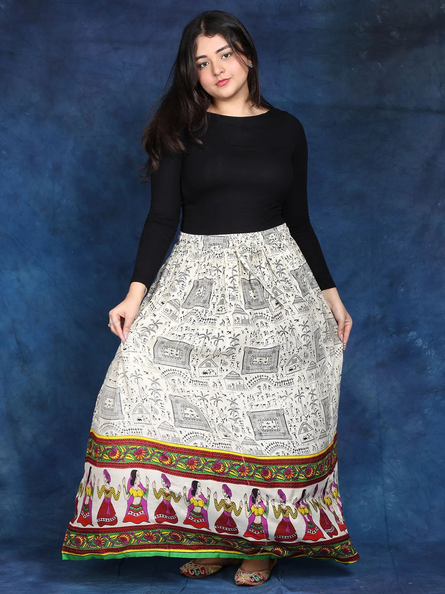 In the ethereal canvas of fashion, this Long Skirt is a masterpiece embroidered with threads of ethnic beauty. Its immaculate off-white colour, symbolic of purity, engulfs an individual in a peaceful embrace. Each stroke, embellished with elaborate Warli folk prints, tells a narrative about tradition and legacy, whispering ancient tales of love and celebration.
