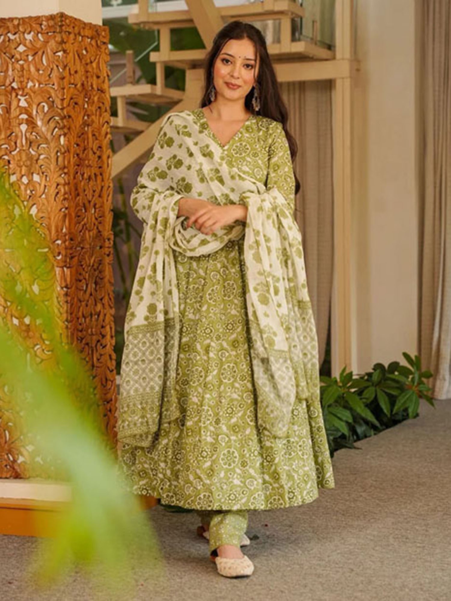 Green Cotton Silk Anarkali Kurta Set with Floral Digital Print and Matching Dupatta