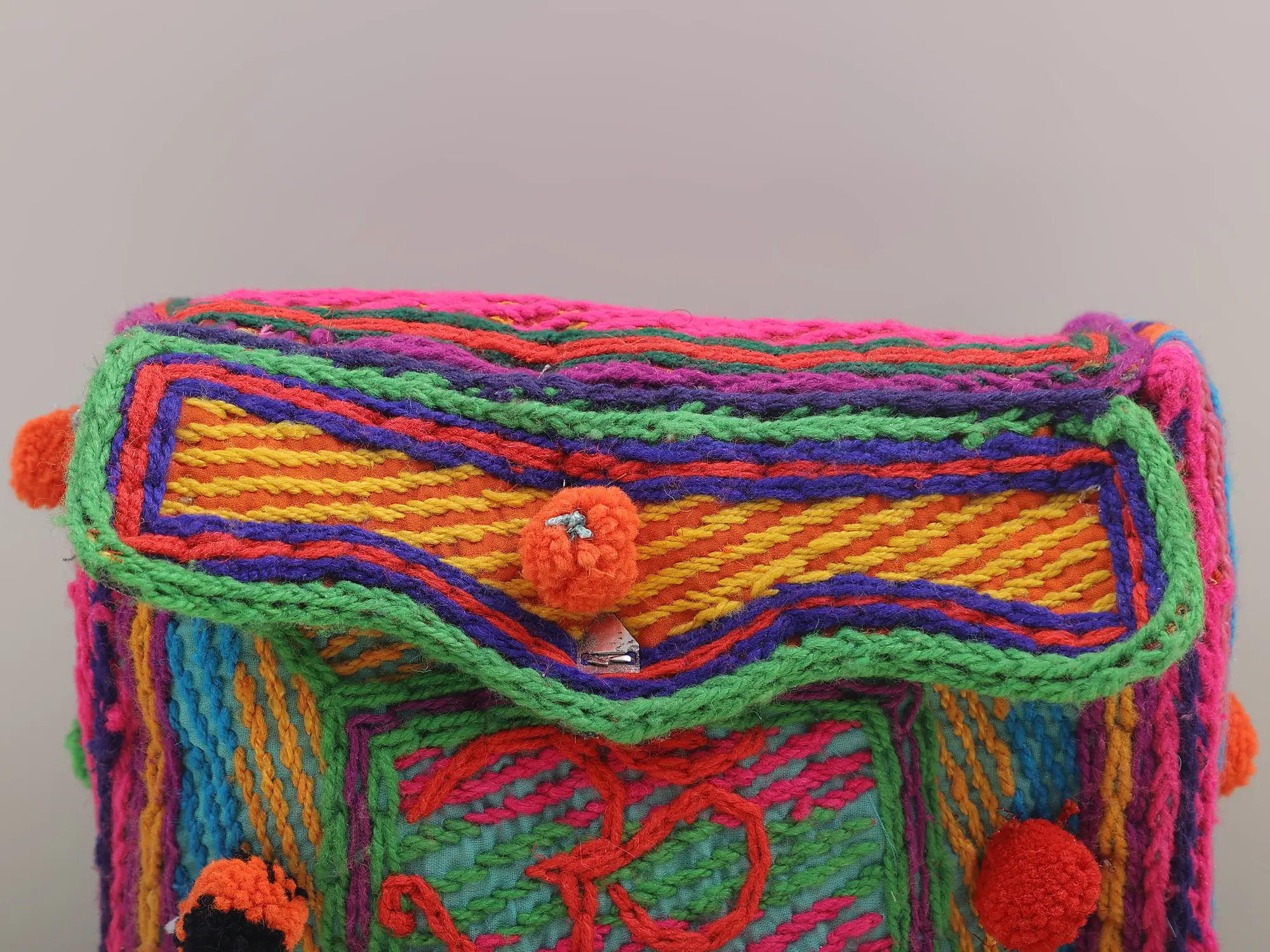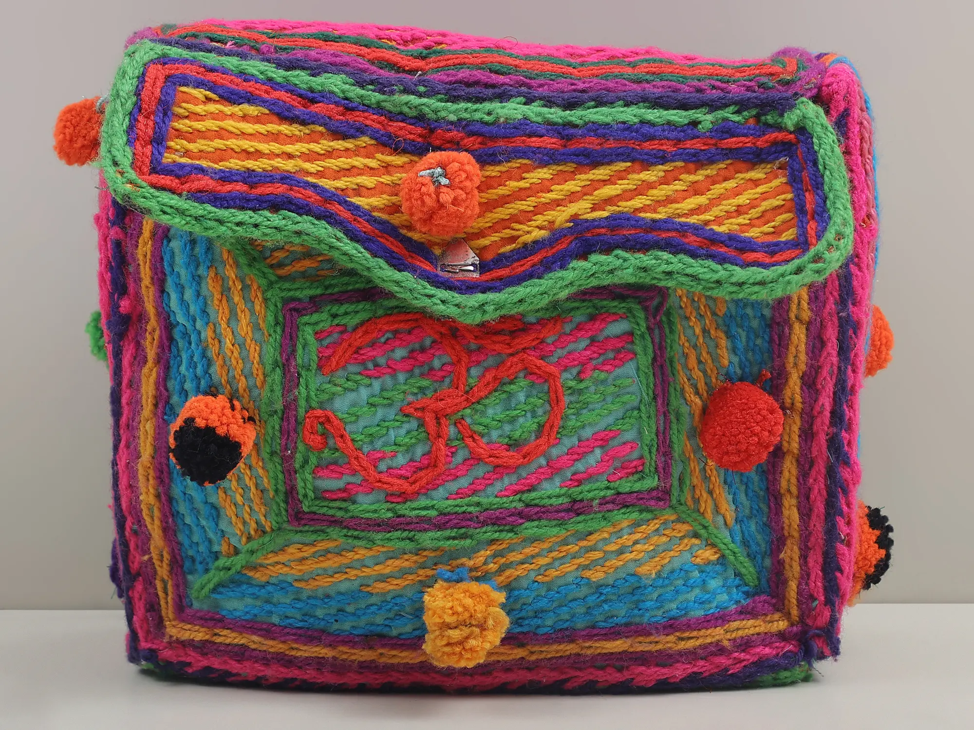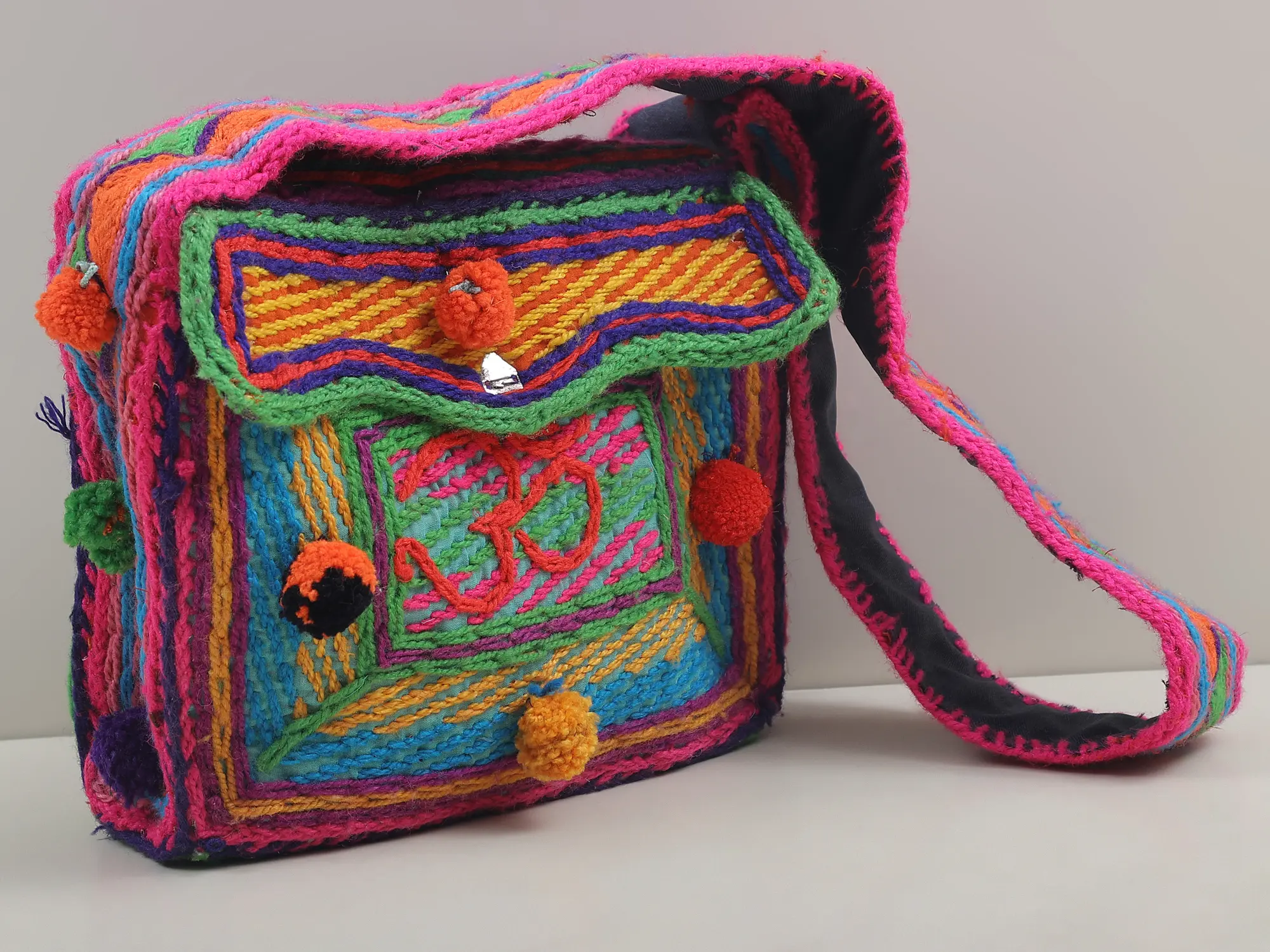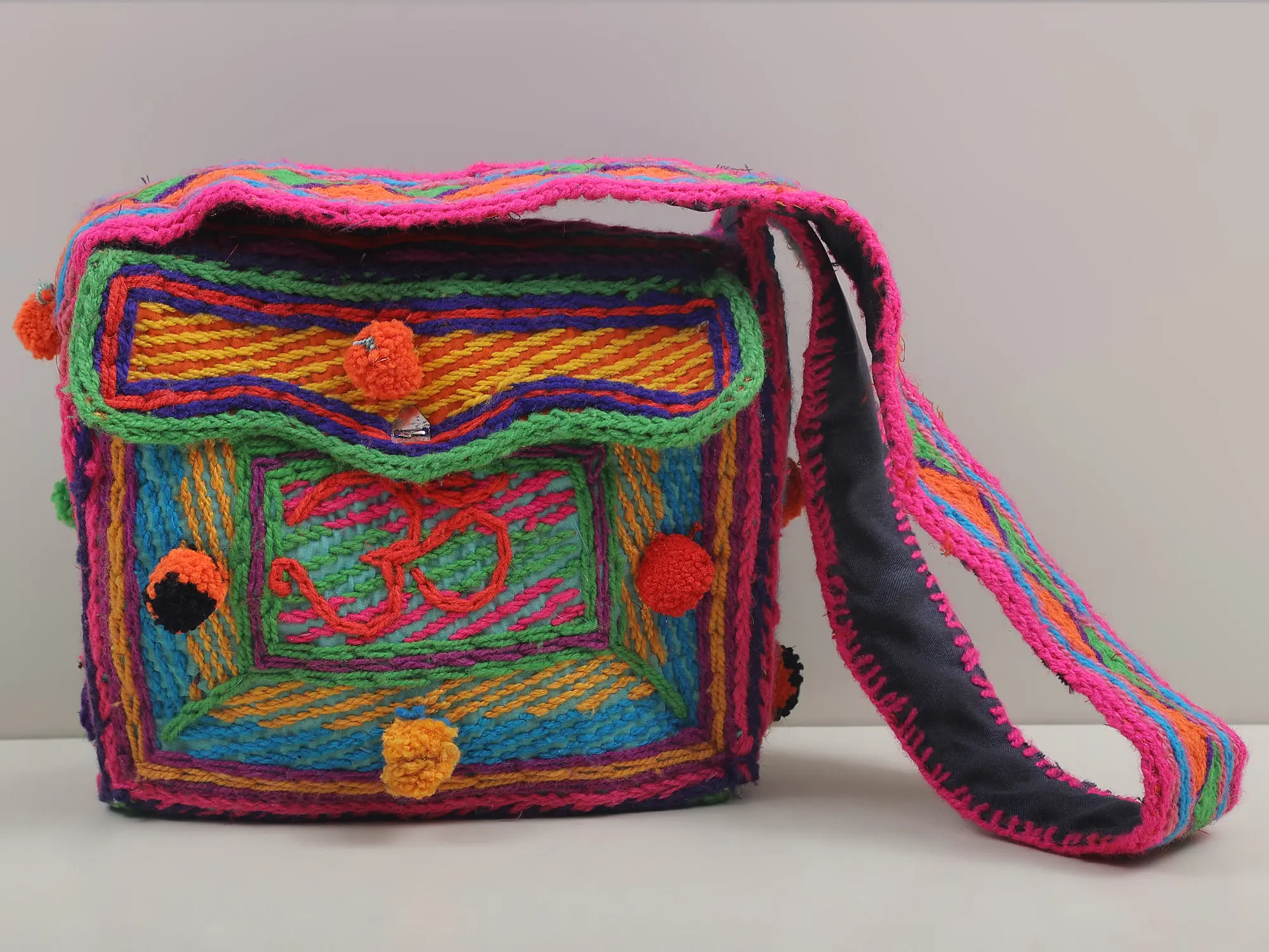Embrace the vibrant spirit of Haridwar with this exquisite shoulder bag, a testament to artisanal craftsmanship and spiritual significance. Woven from pure wool, each bag is a unique creation, imbued with the care and dedication of its maker. The rich, multi-colored yarn is expertly woven to create a dynamic and eye-catching pattern, showcasing a spectrum of bold hues that evoke the energy and joy of Indian culture. This bag is more than just an accessory; it's a piece of art, a wearable story, and a connection to a timeless tradition.