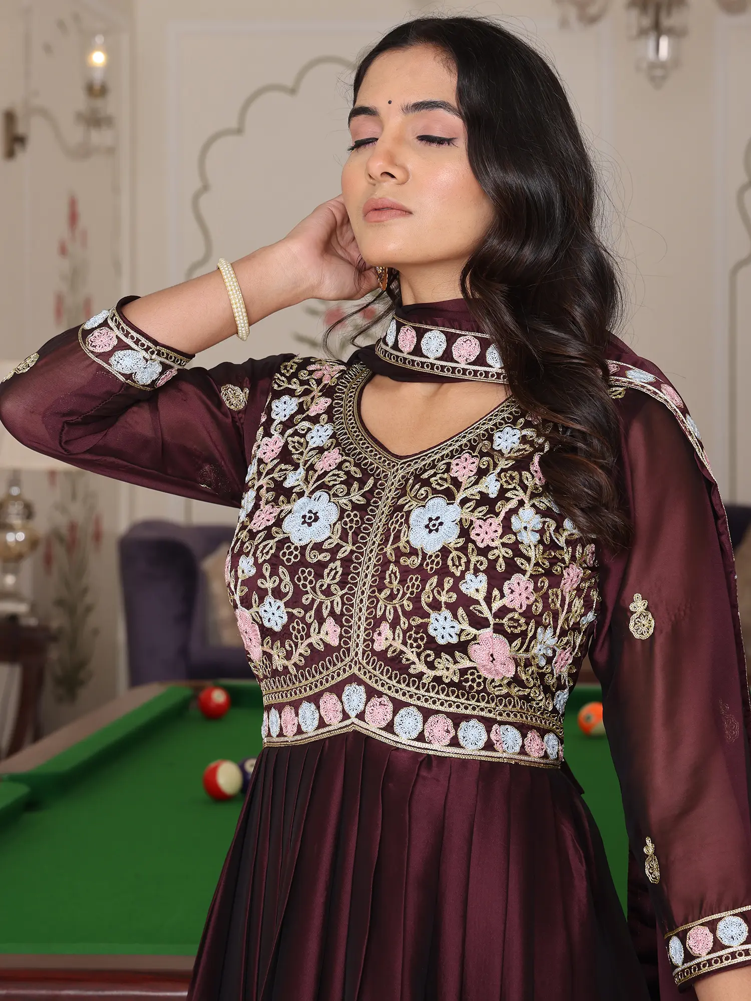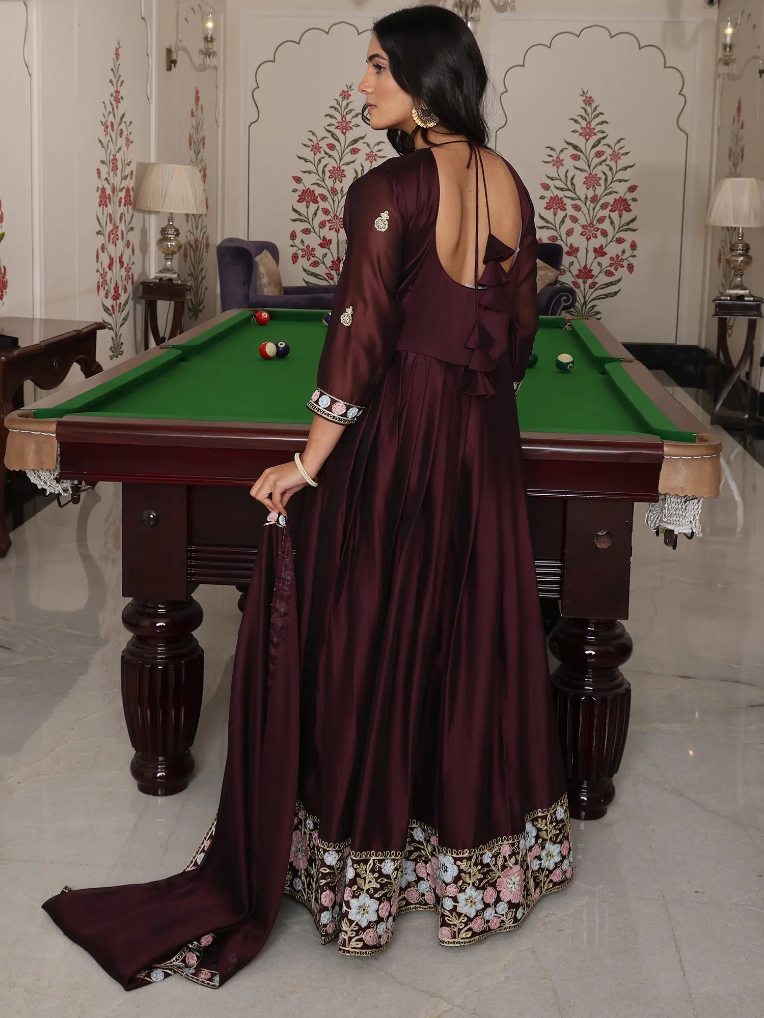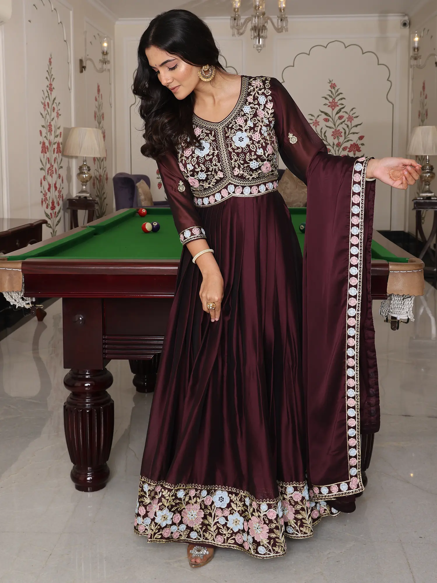 The rich, deep hue of the silk crepe drapes with unparalleled fluidity, creating a silhouette that is both dramatic and graceful. You'll be captivated by the delicate embroidery that graces the neckline and hem, a mesmerizing dance of pastel threads that adds a touch of opulent artistry. The accompanying dupatta offers a perfect finishing touch, its borders echoing the exquisite detailing of the main garment, enhancing its overall splendor.