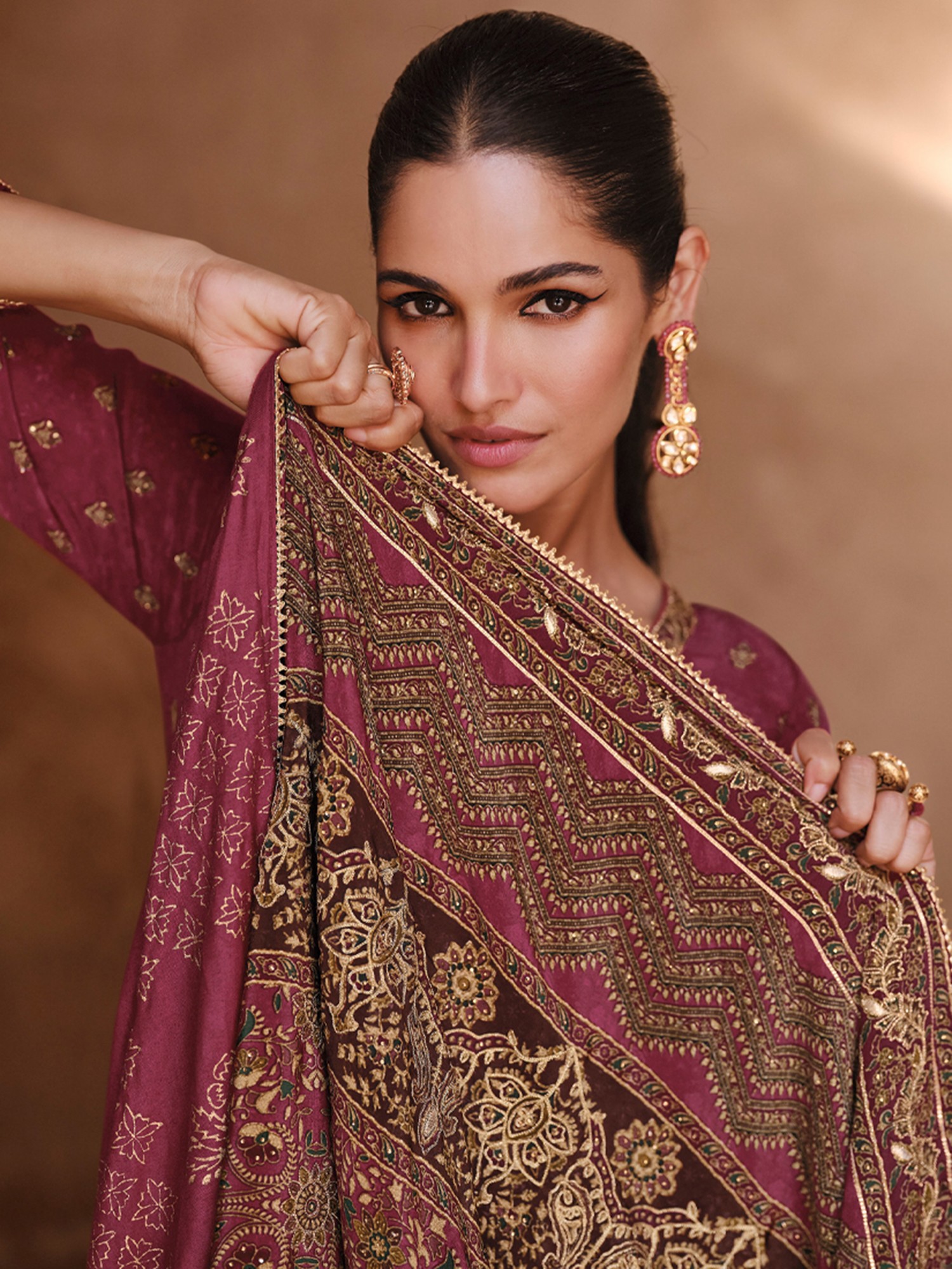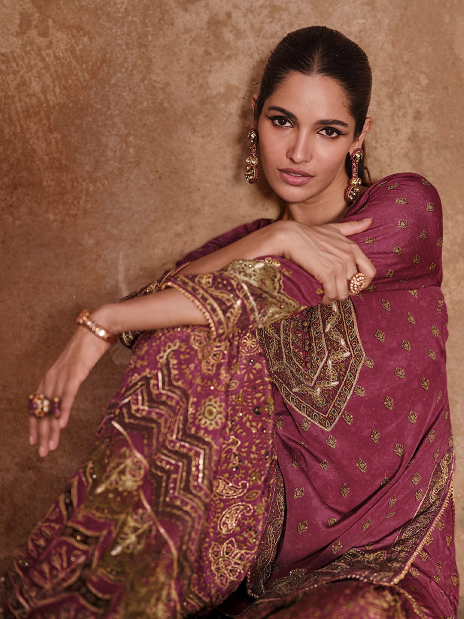 Timeless Russian Silk Gharara Suit With Artistic Print And Heavy Thread Sequin Embroidery For Festive Look