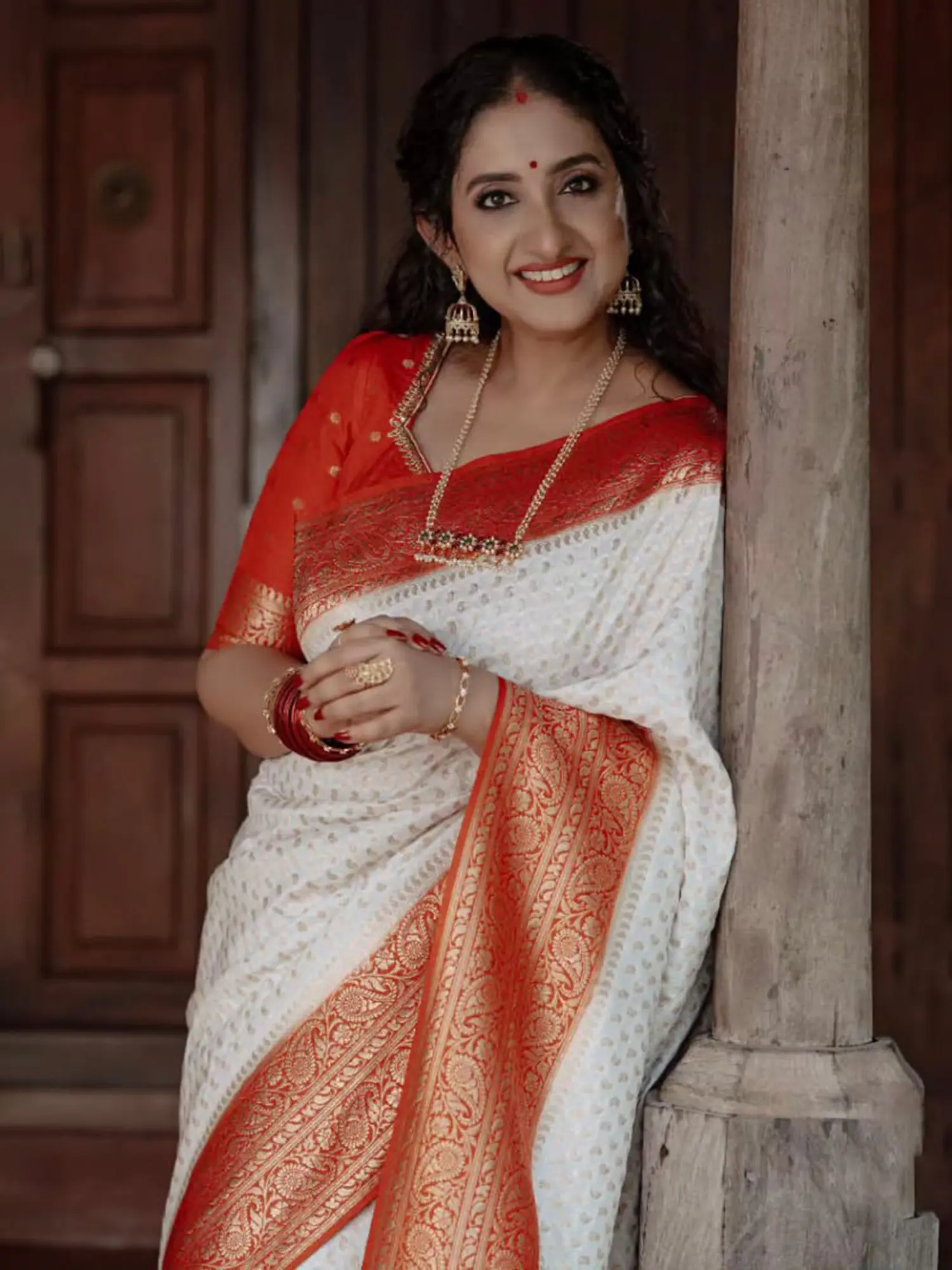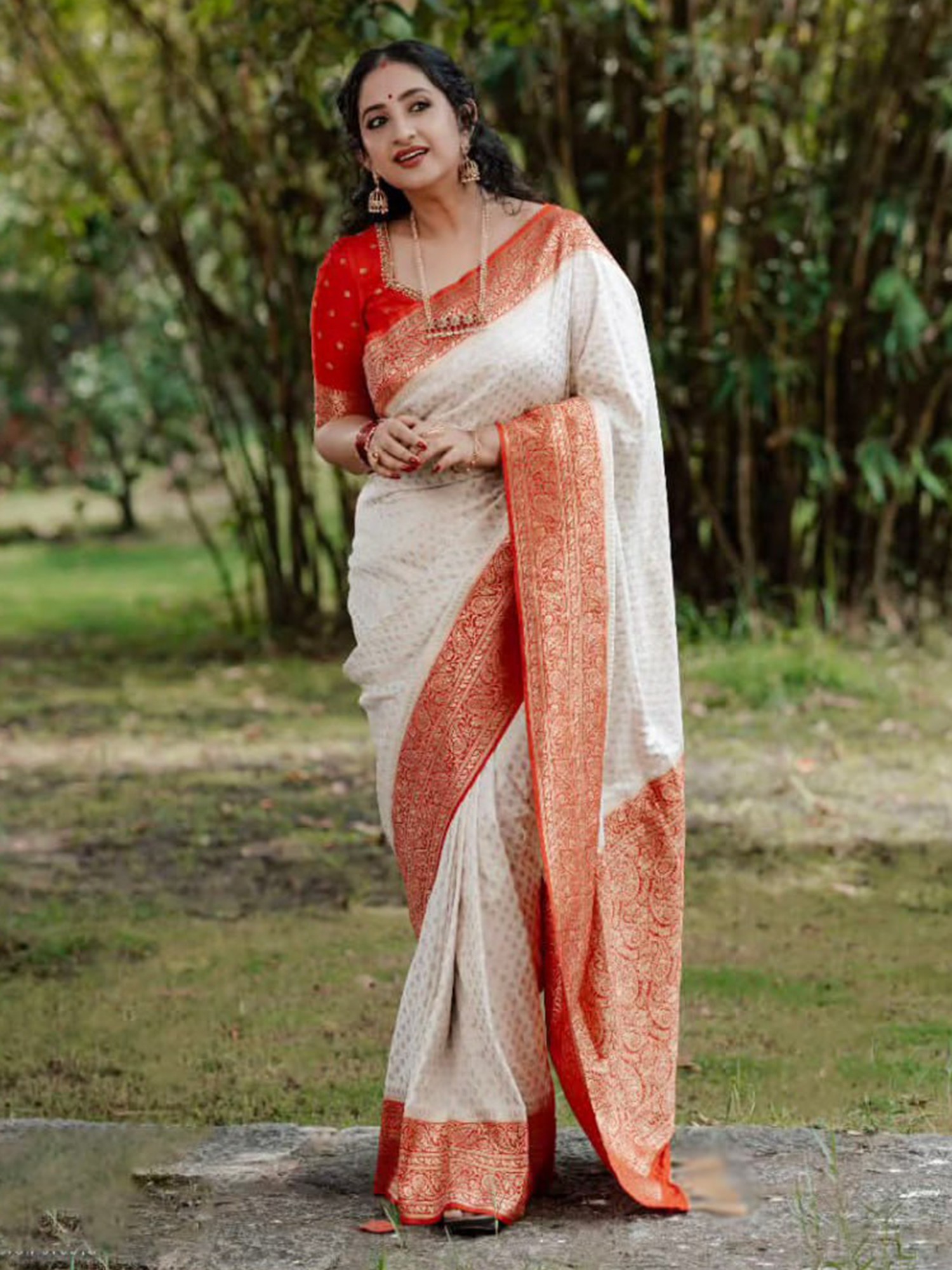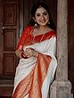 The captivating color palette of this saree features a pristine off-white base beautifully contrasted with vibrant orange accents. This striking combination creates a look that is both classic and contemporary. The true artistry lies in the rich pallu and border, meticulously woven with intricate jacquard patterns. These ornate designs, in a deep, radiant orange, showcase exceptional craftsmanship and add a touch of regal splendor. The detailed motifs speak of heritage and tradition, making this saree a true heirloom piece.